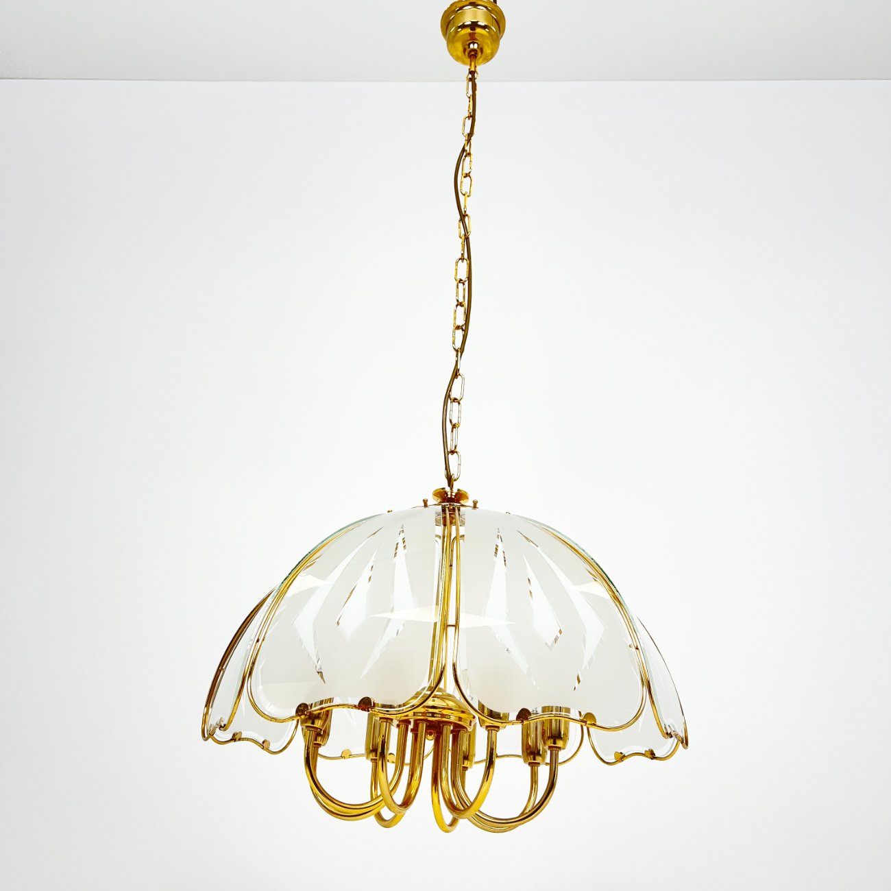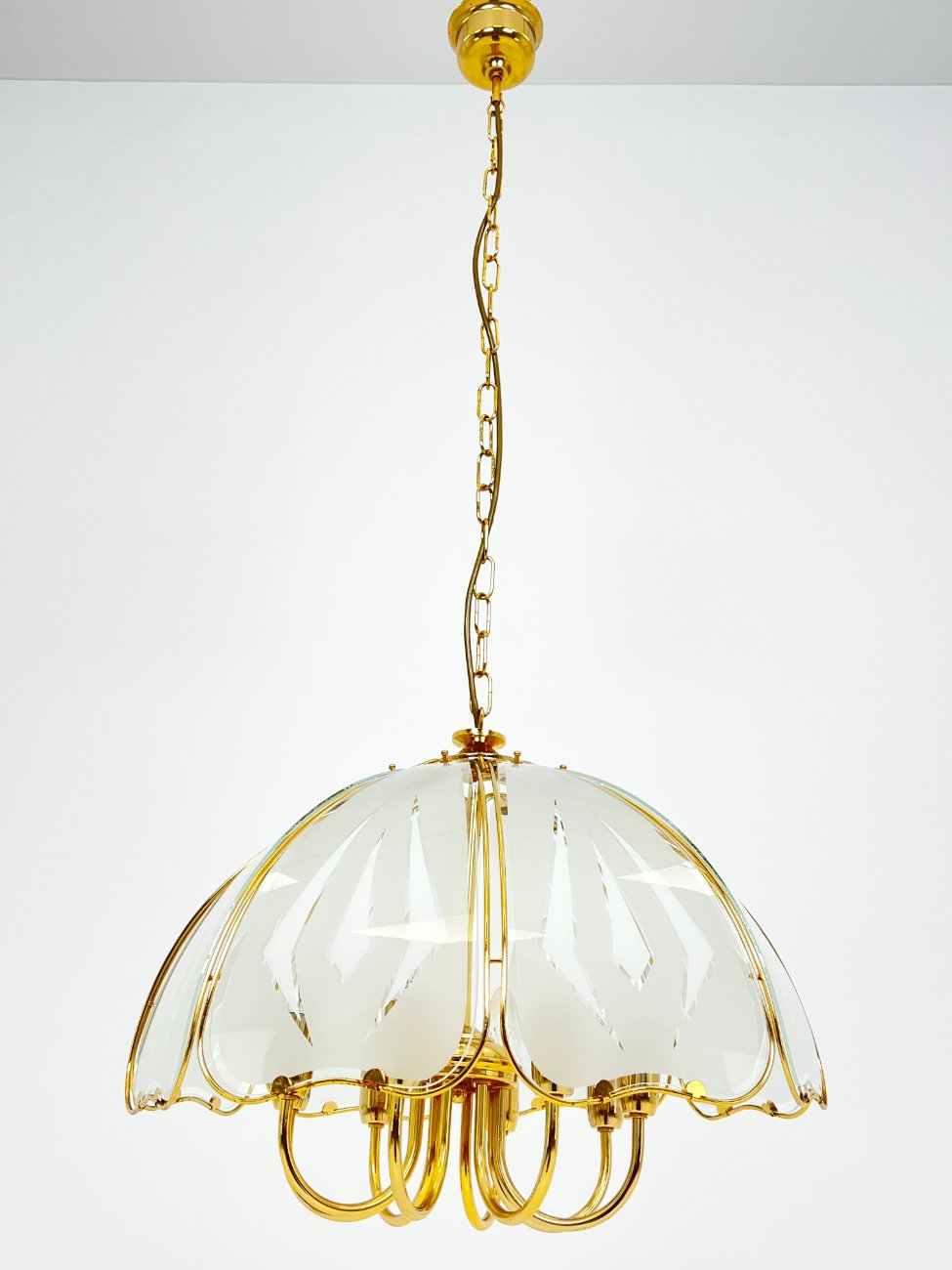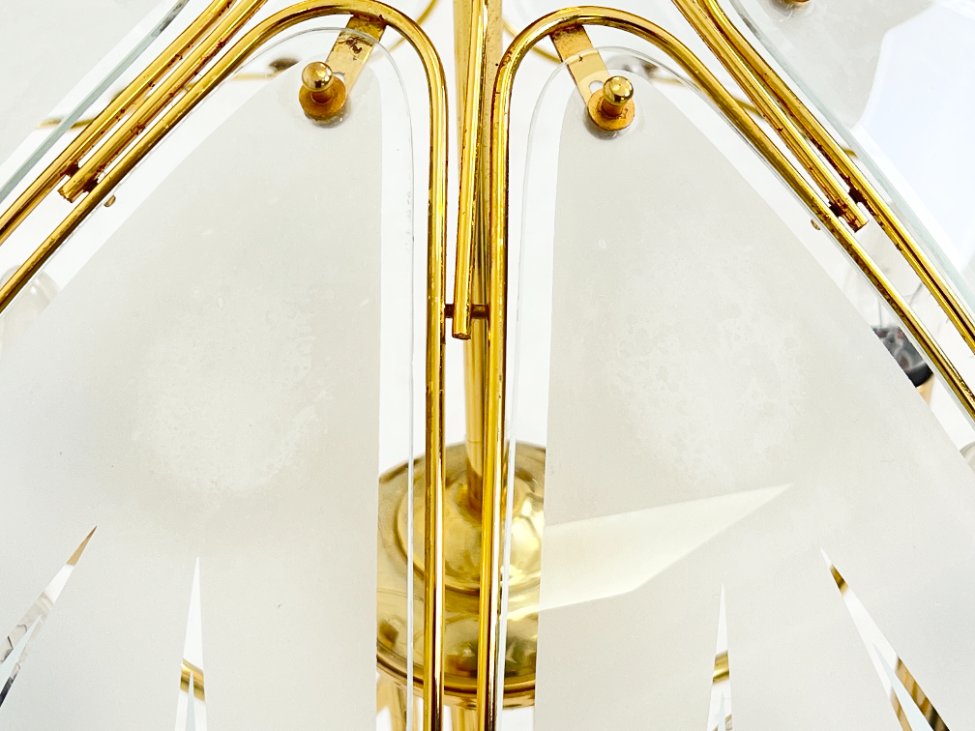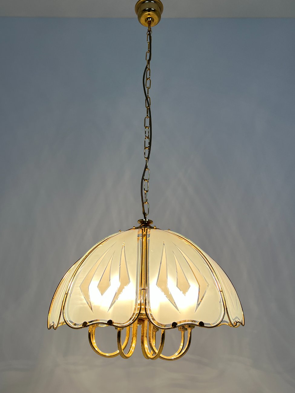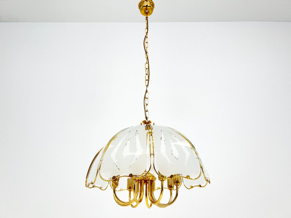 Aukso spalvos metalo pakabinamas šviestuvas su stiklu.