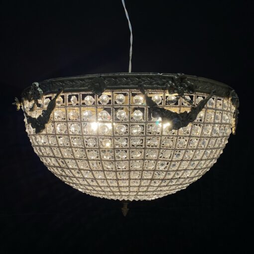 Suvertų stiklo detalių lubinis šviestuvas dekoruotas ampyro stiliui būdingomis žalvarinėmis detalėmis
