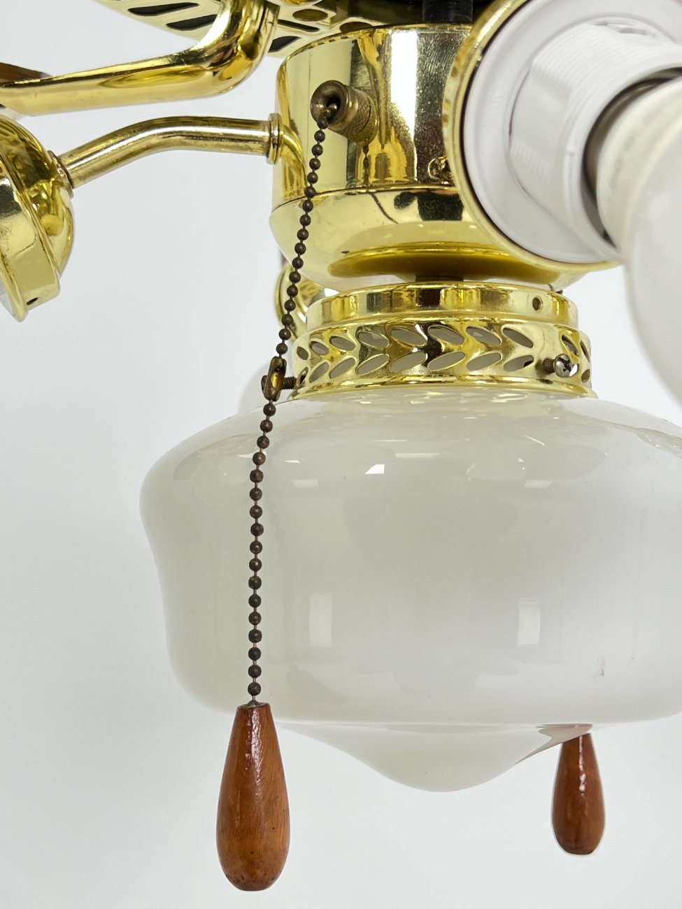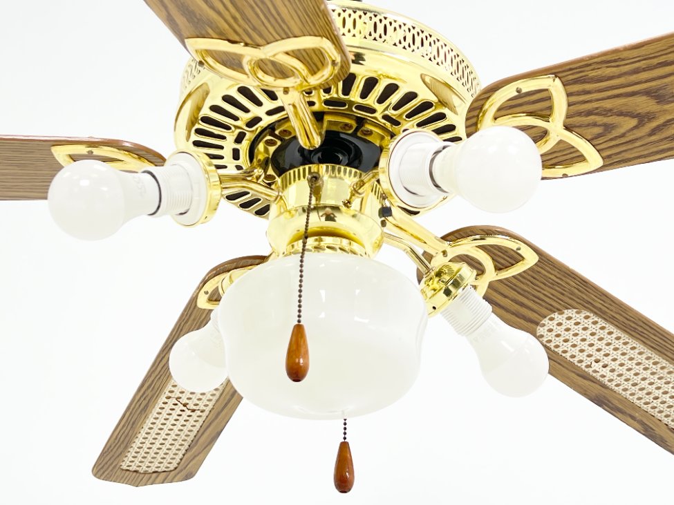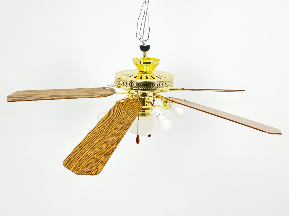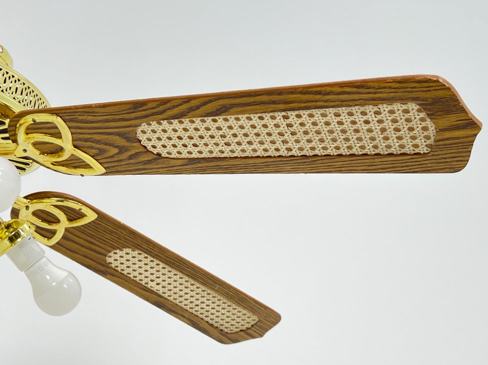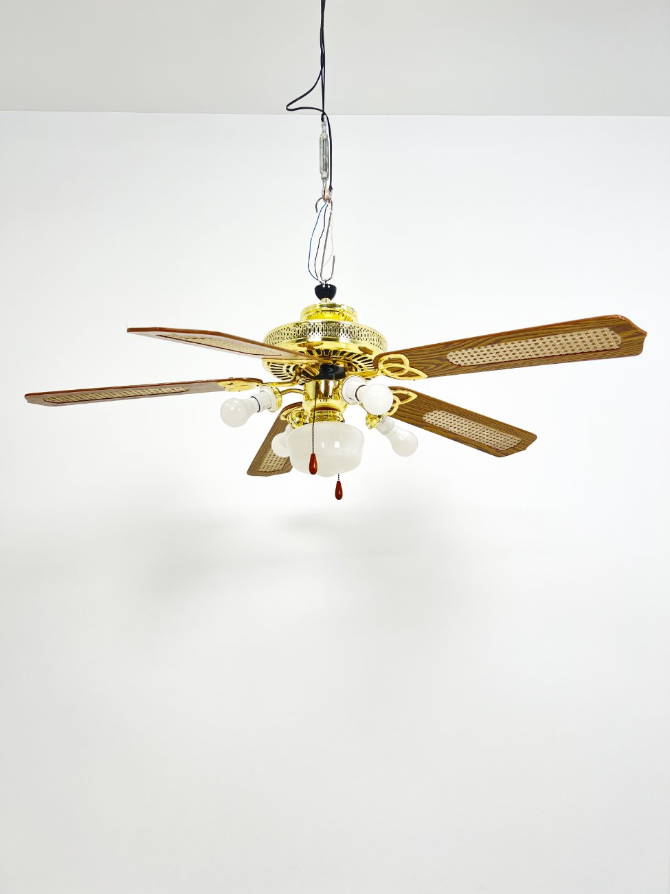 | Papildoma informacija | Ventiliatorius ir apšvietimas veikia. Ant visų sparnų aplūžinėjusi plastikinė ratano imitacija. Per visą paviršių yra pabraižymų. |