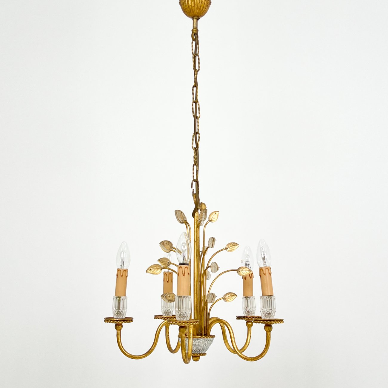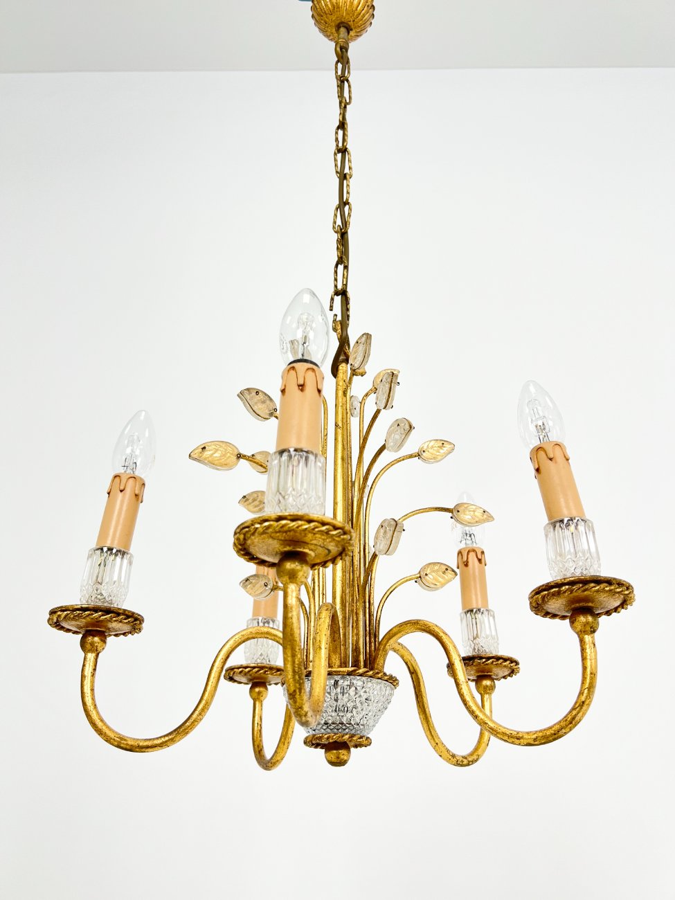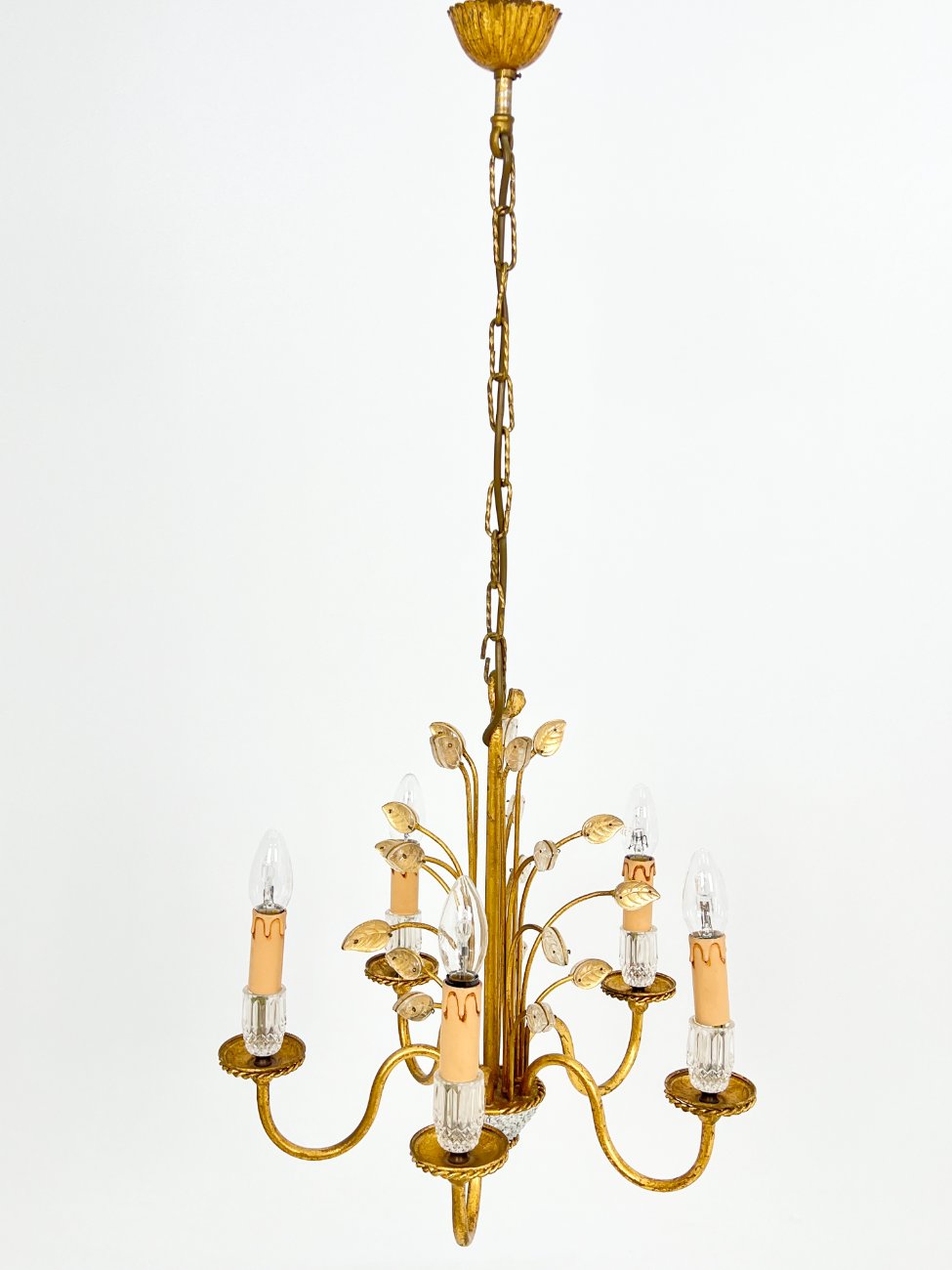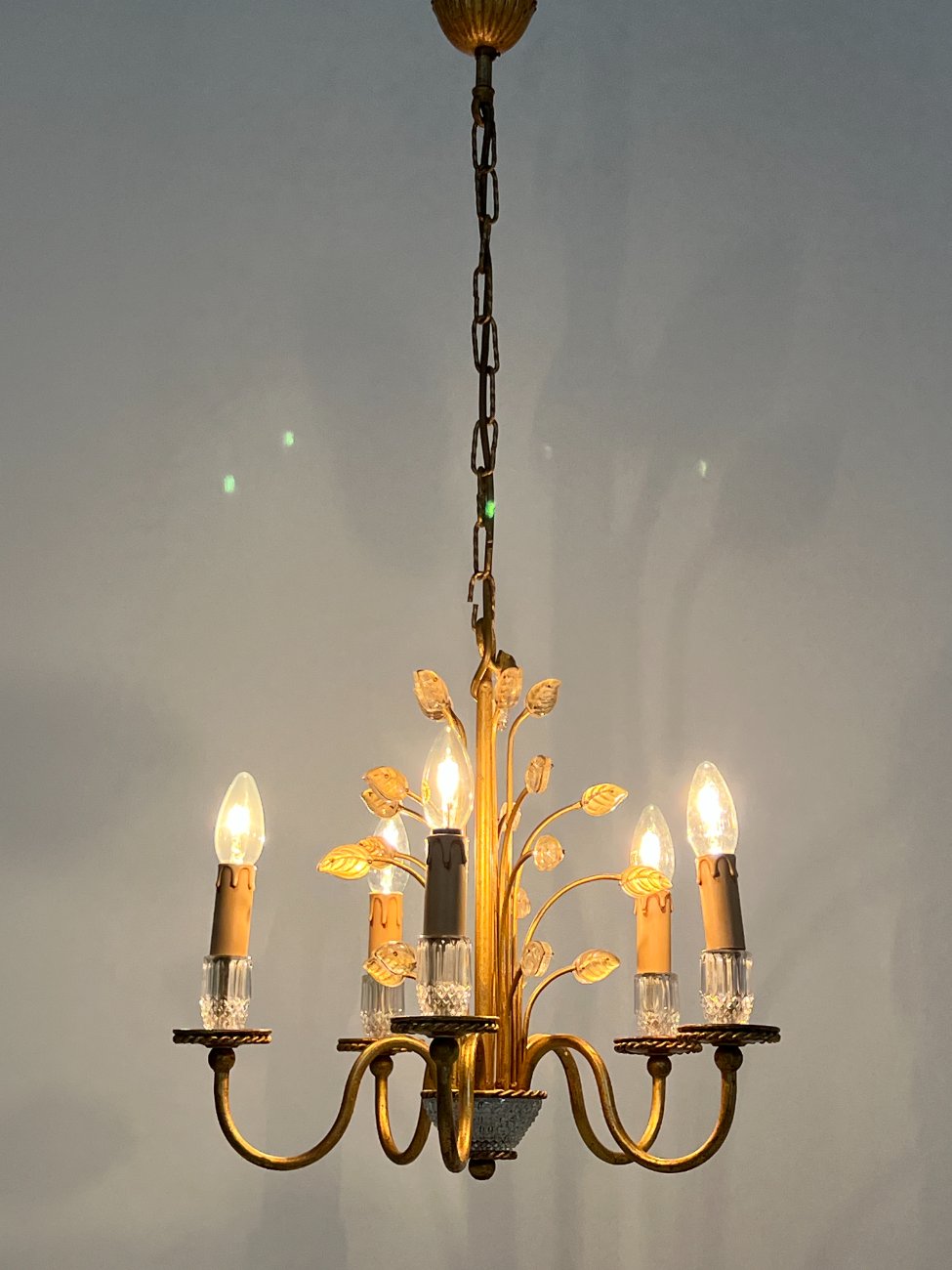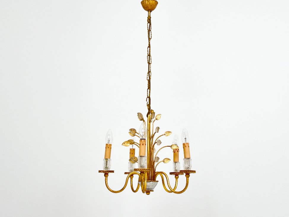 Metalinis penkių šakų sietynas su stiklo detalėmis, augalų lapų motyvais.