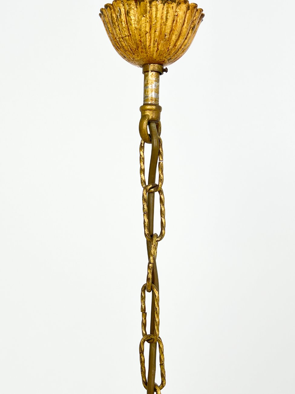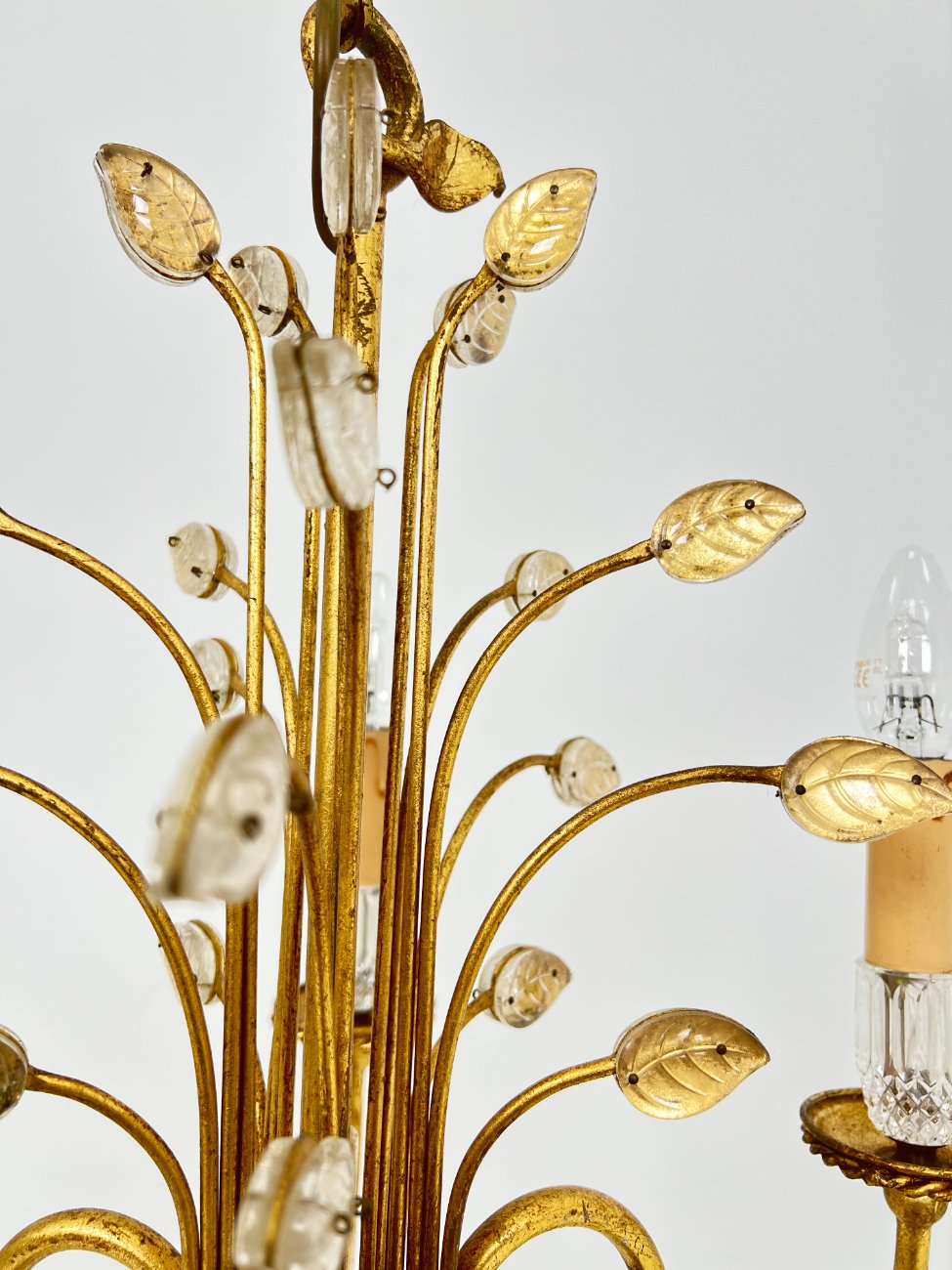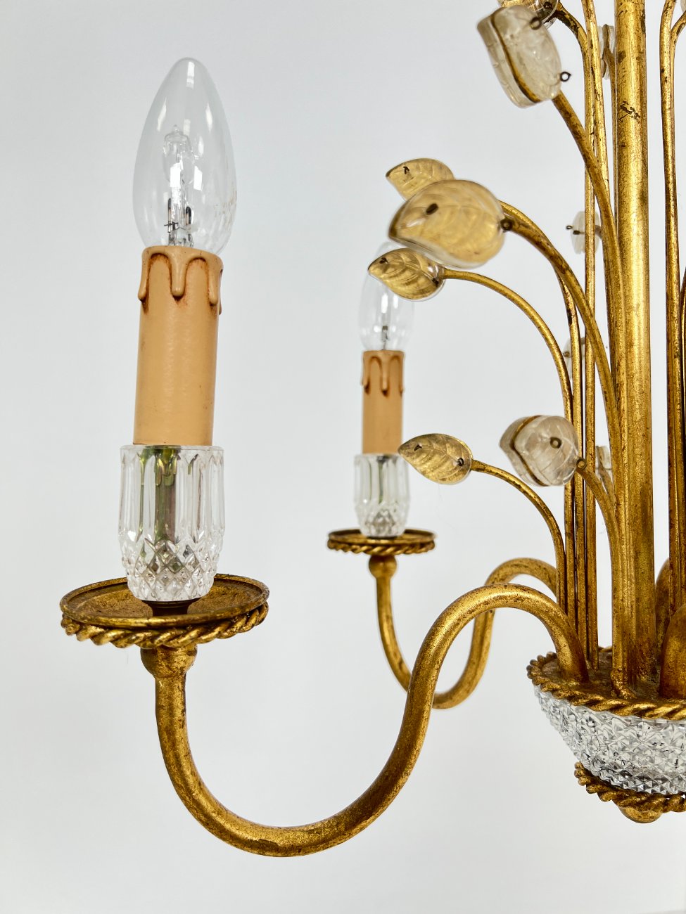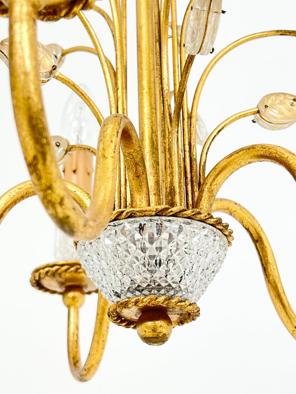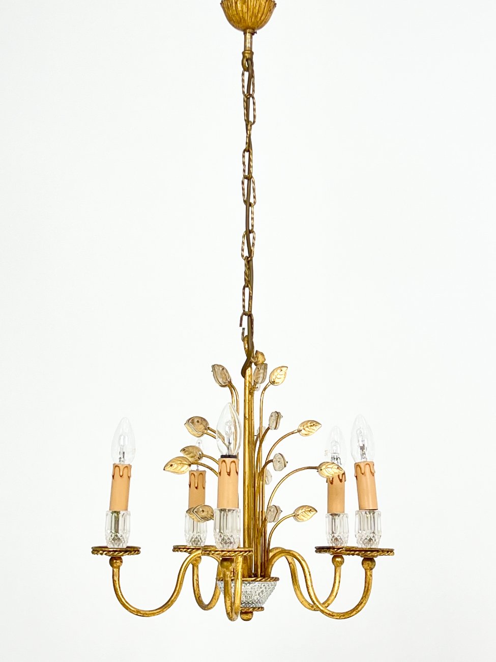 Metalinis penkių šakų sietynas su stiklo detalėmis, augalų lapų motyvais.