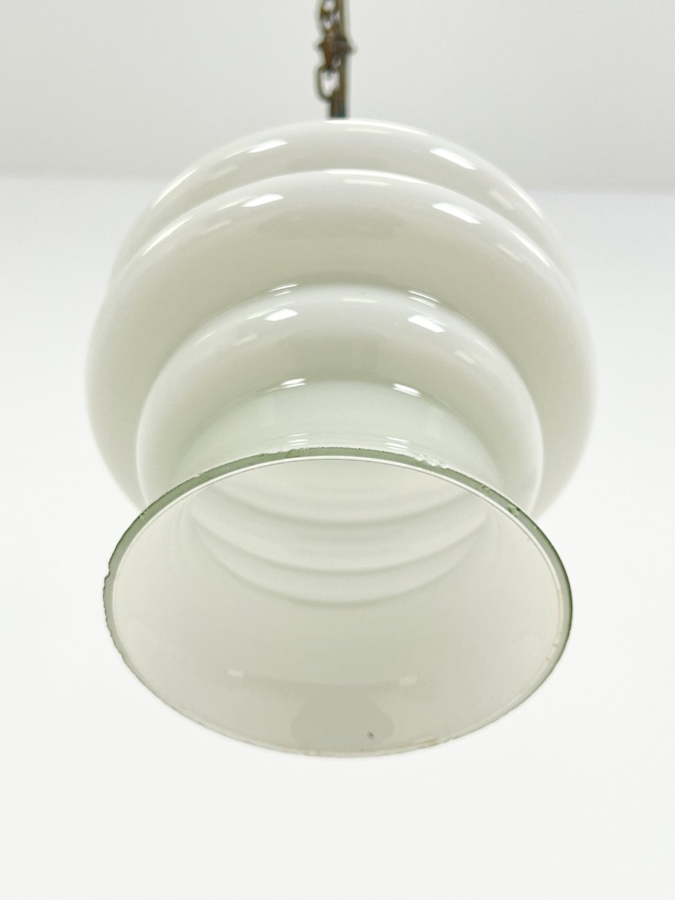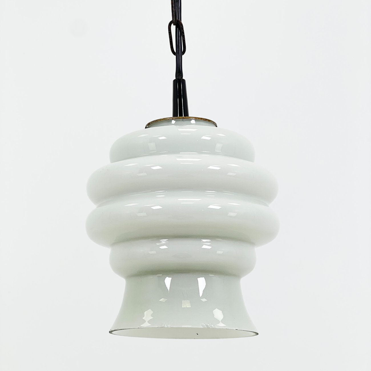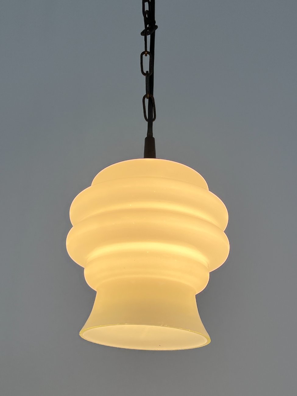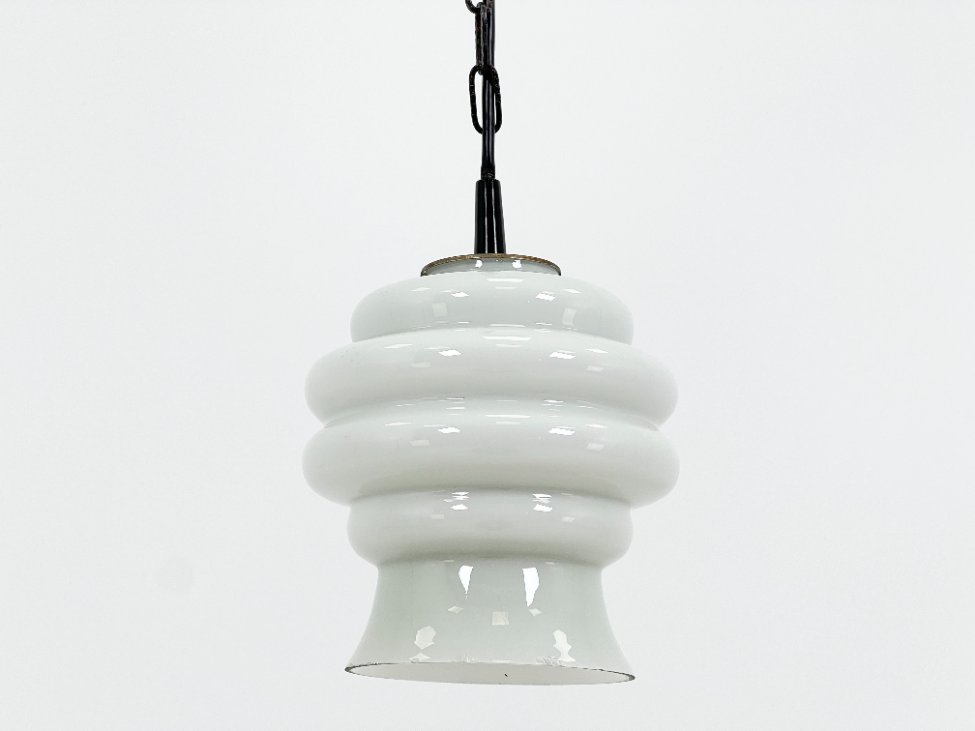 Pakabinamas šviestuvas stikliniu baltos spalvos gaubtu.