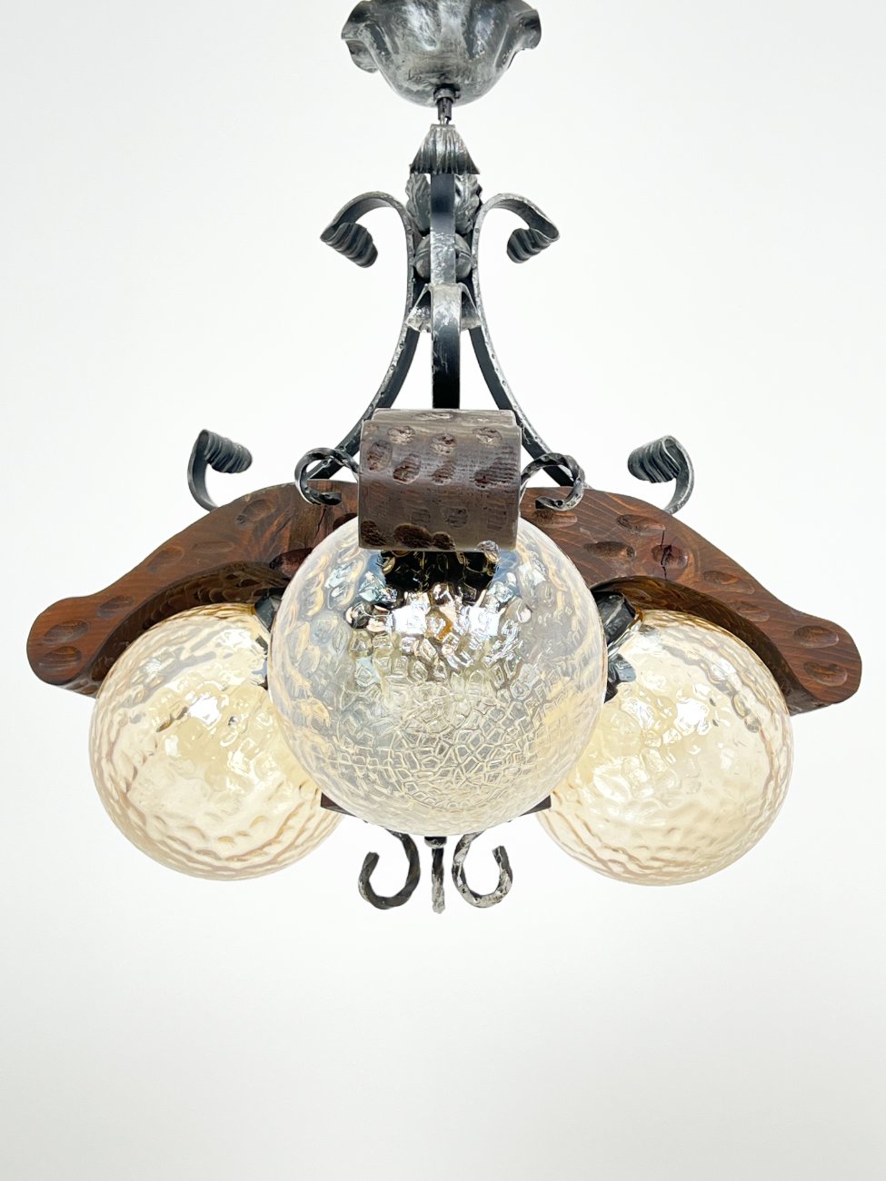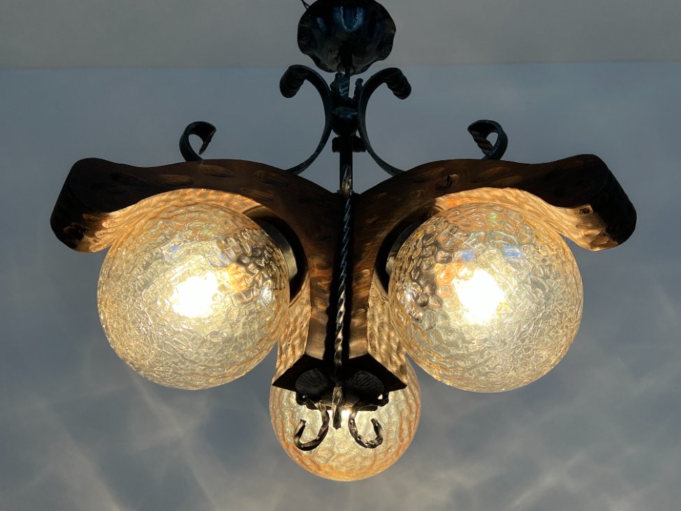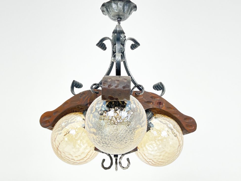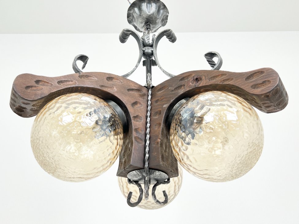 Trijų šakų sietynas iš medžio ir metalo su stikliniais gaubtais.