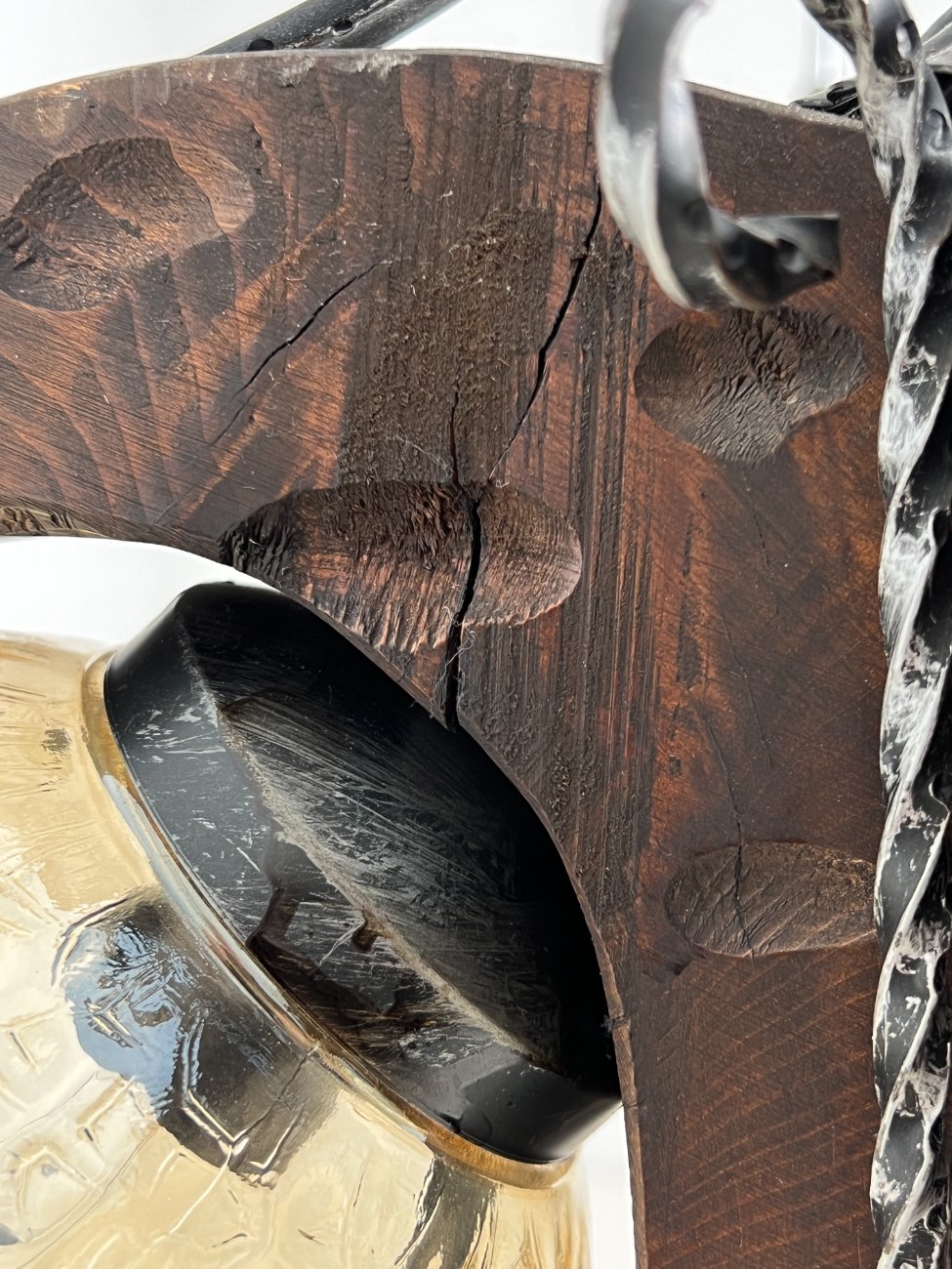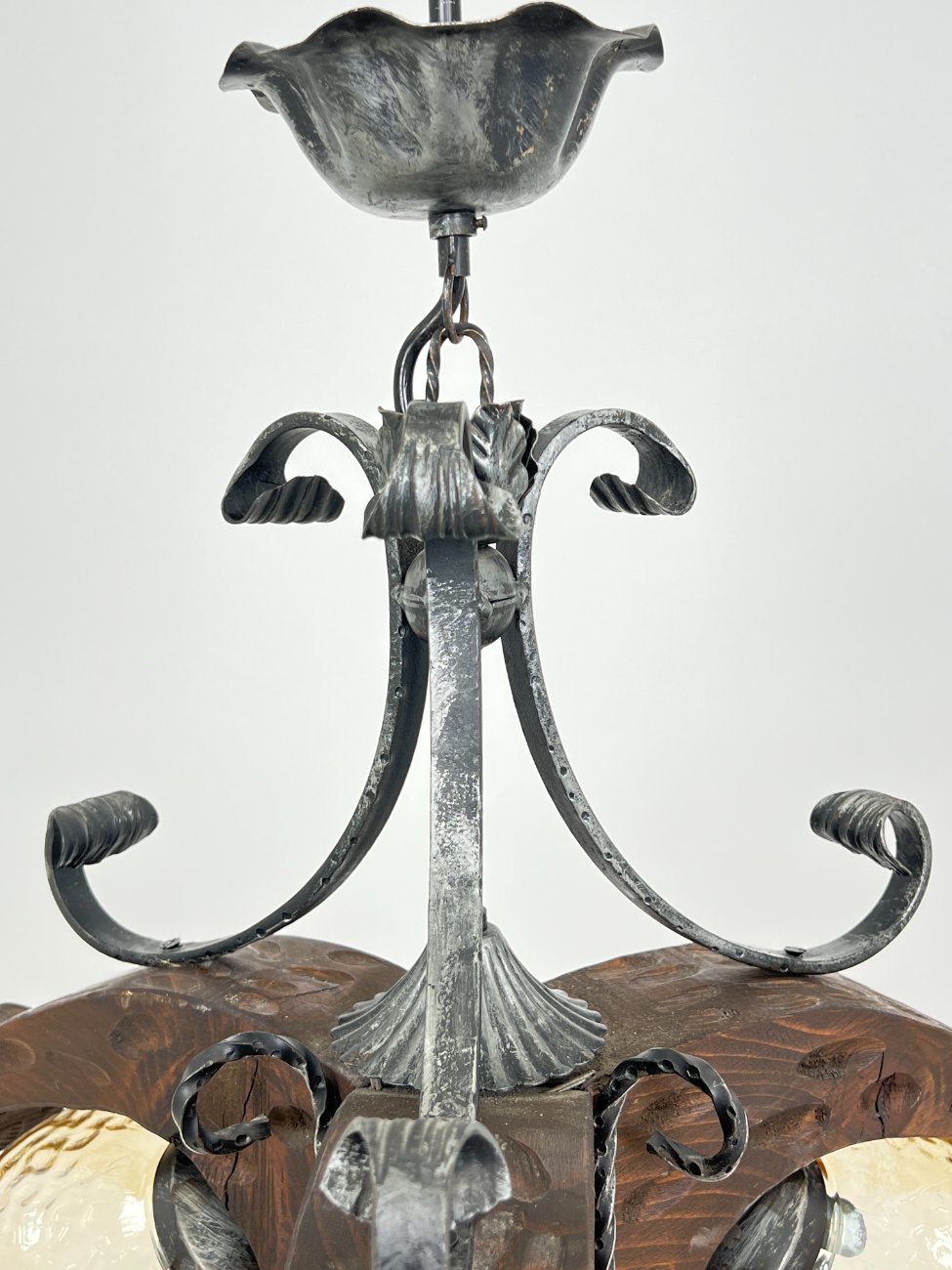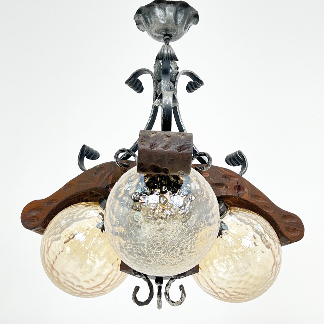 Trijų šakų sietynas iš medžio ir metalo su stikliniais gaubtais.