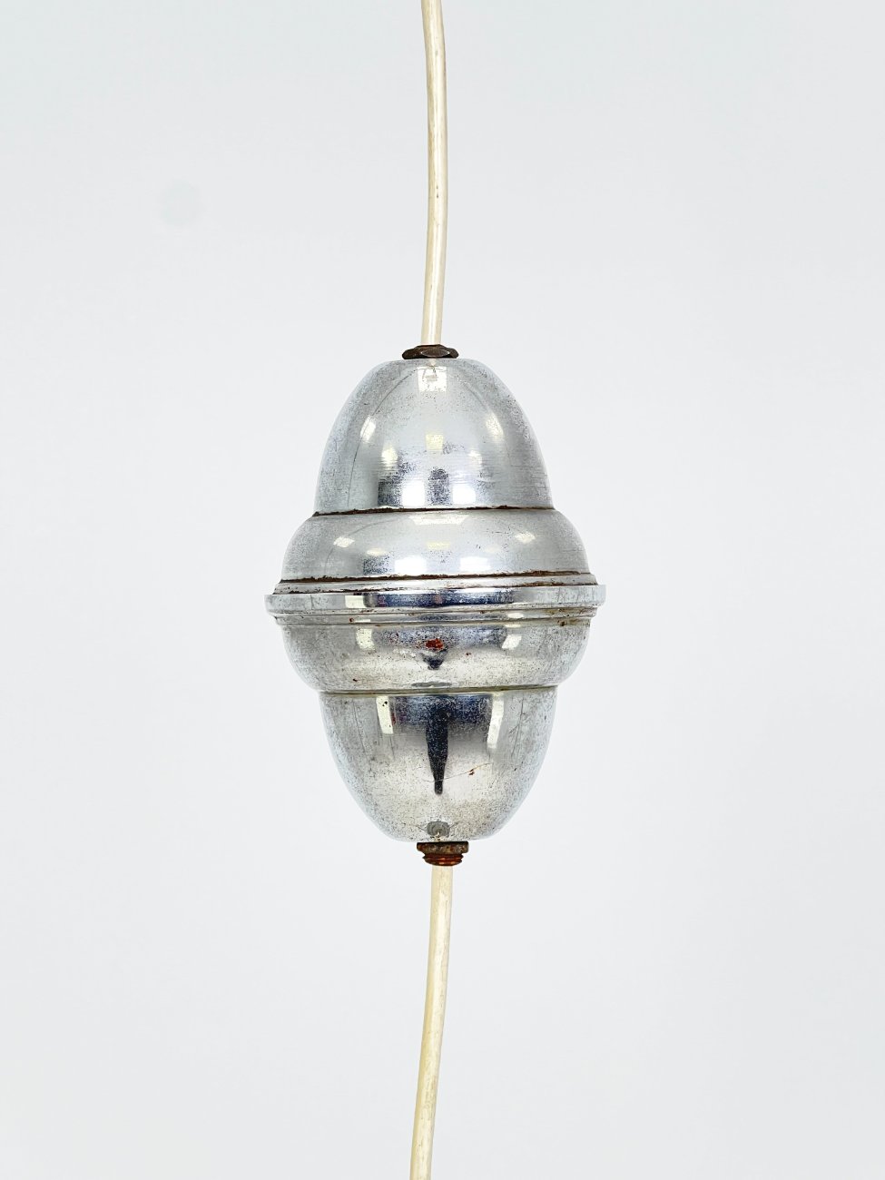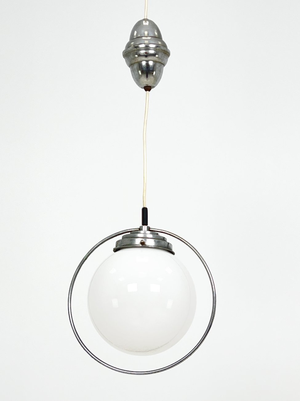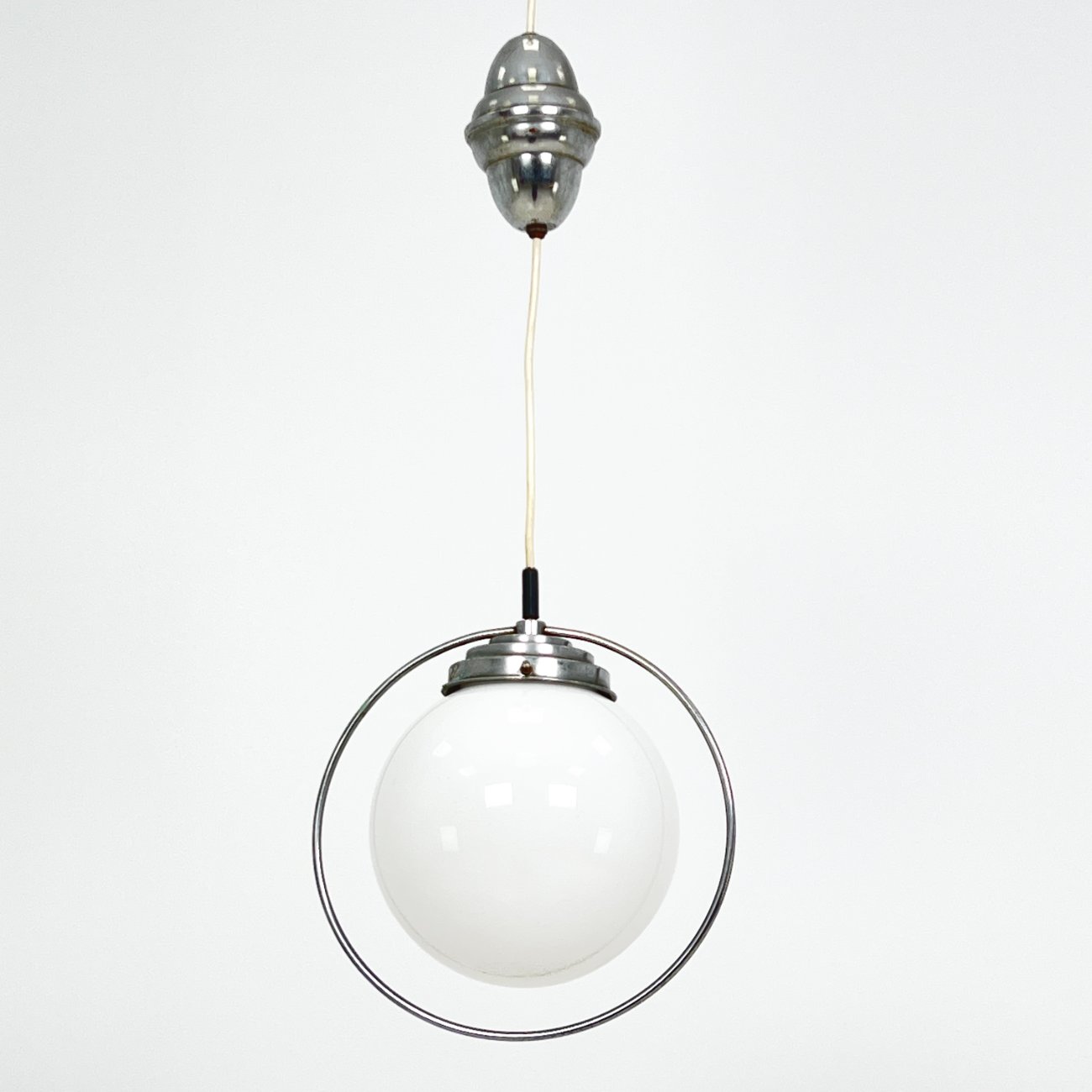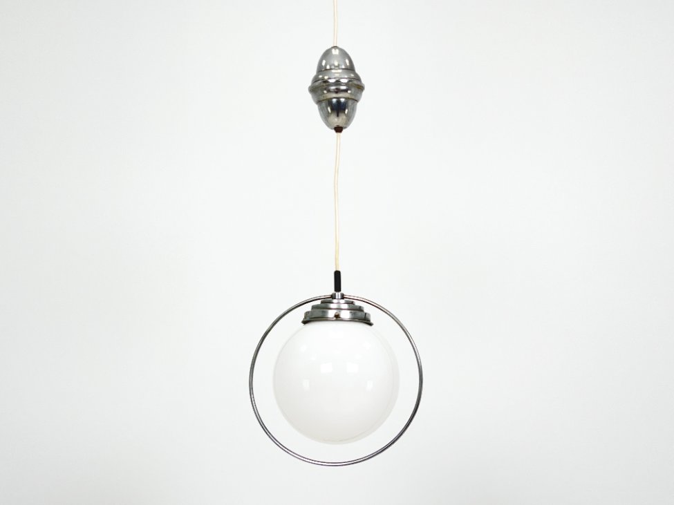 Vintažinis metalinis pakabinamas šviestuvas stikliniu gaubtu.