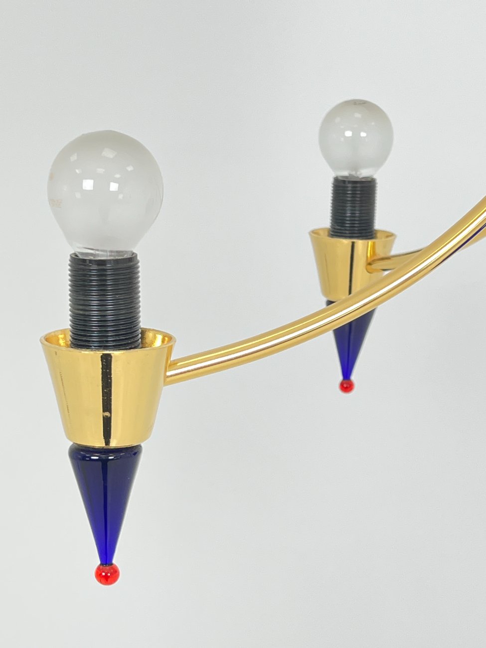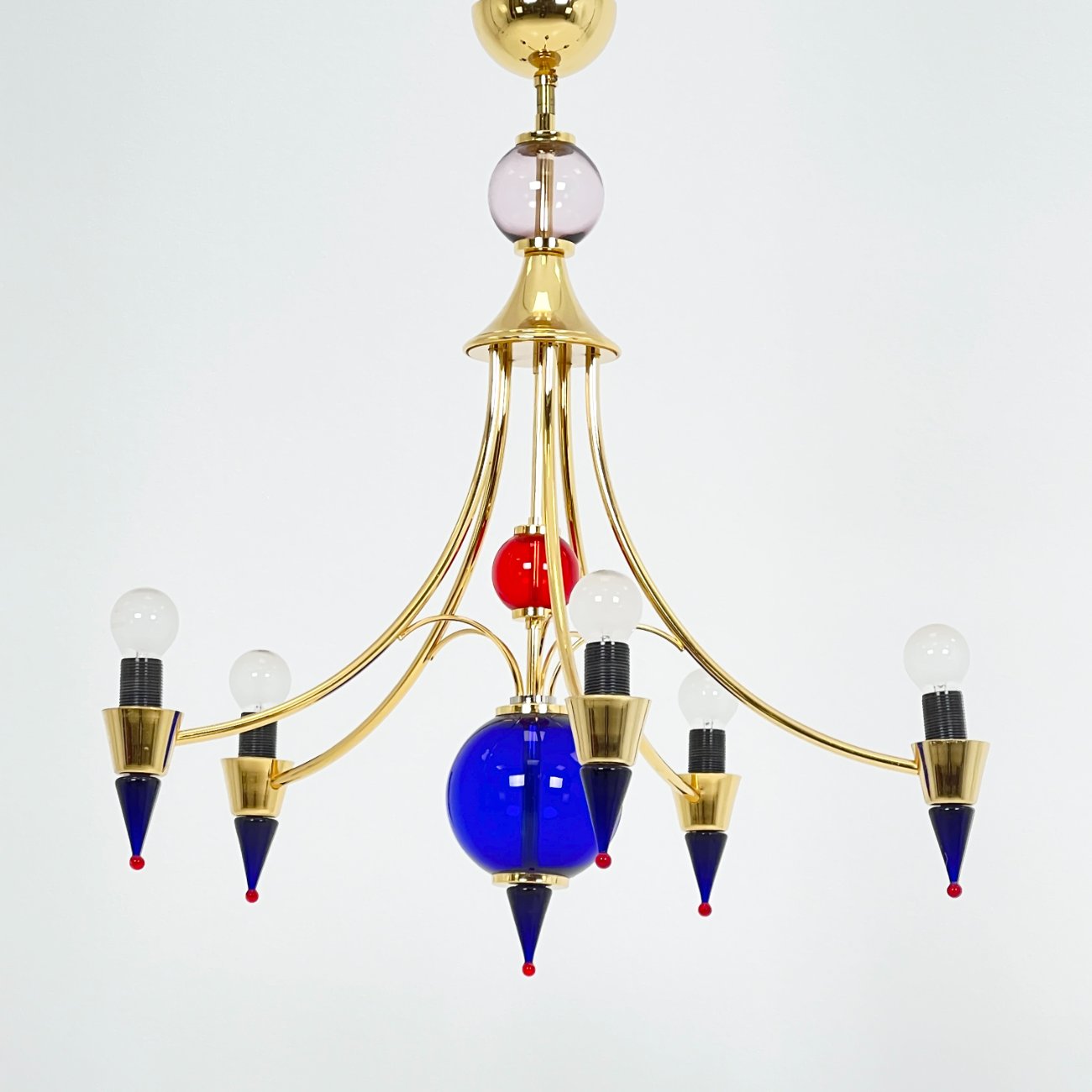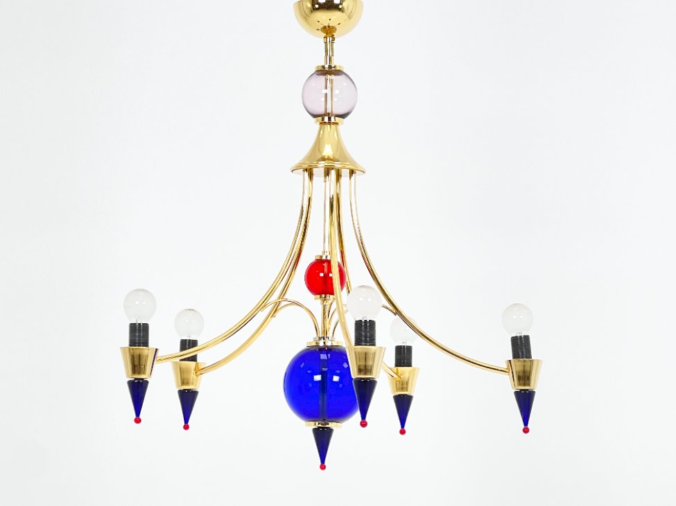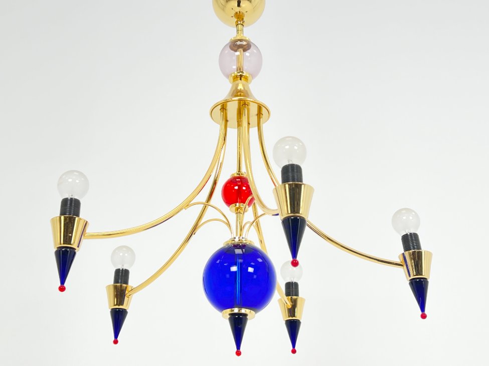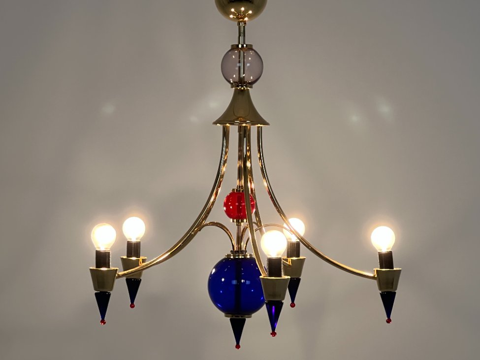 Vintažinis penkių šakų metalinis sietynas su spalvoto stiklo detalėmis.