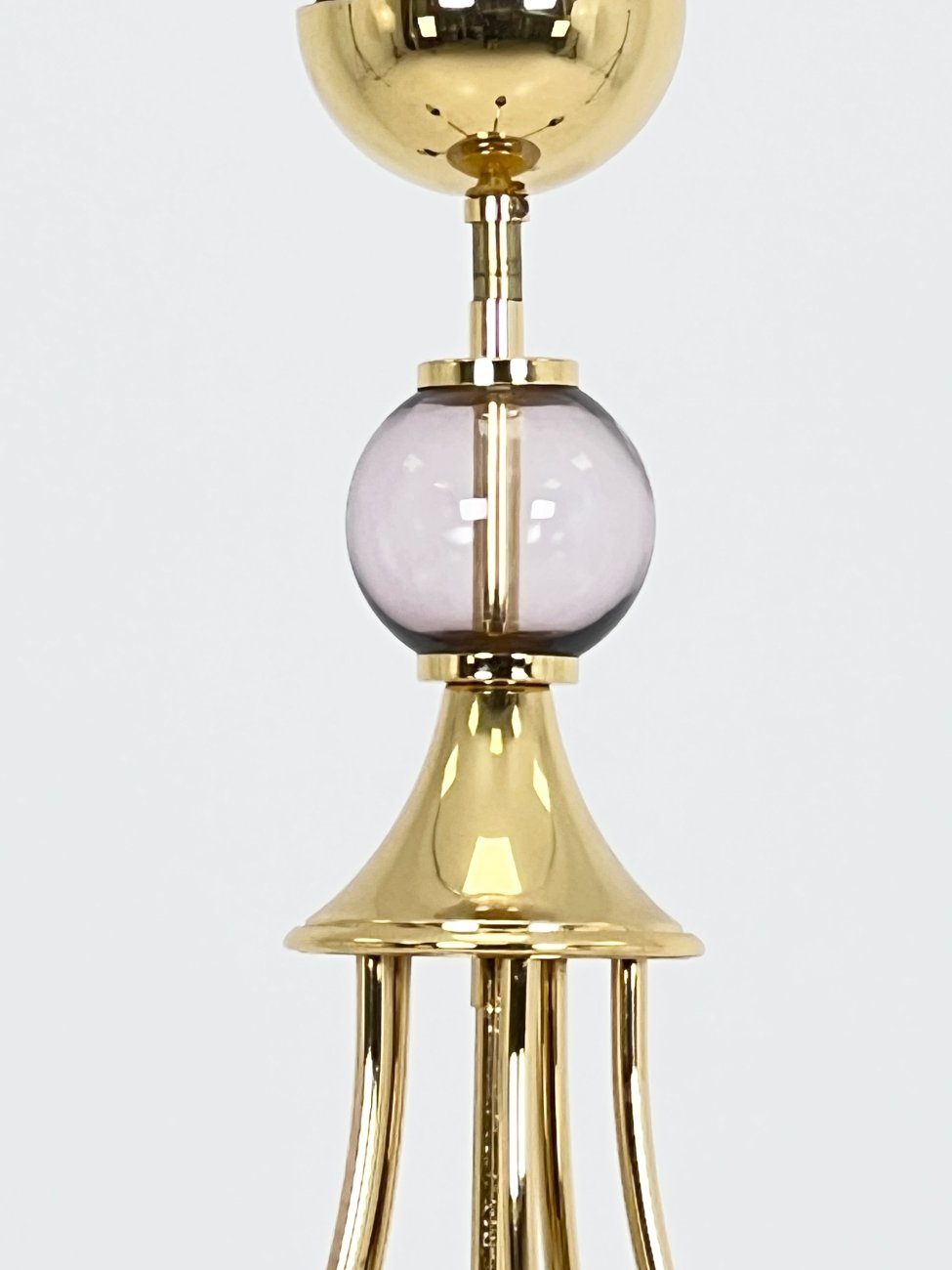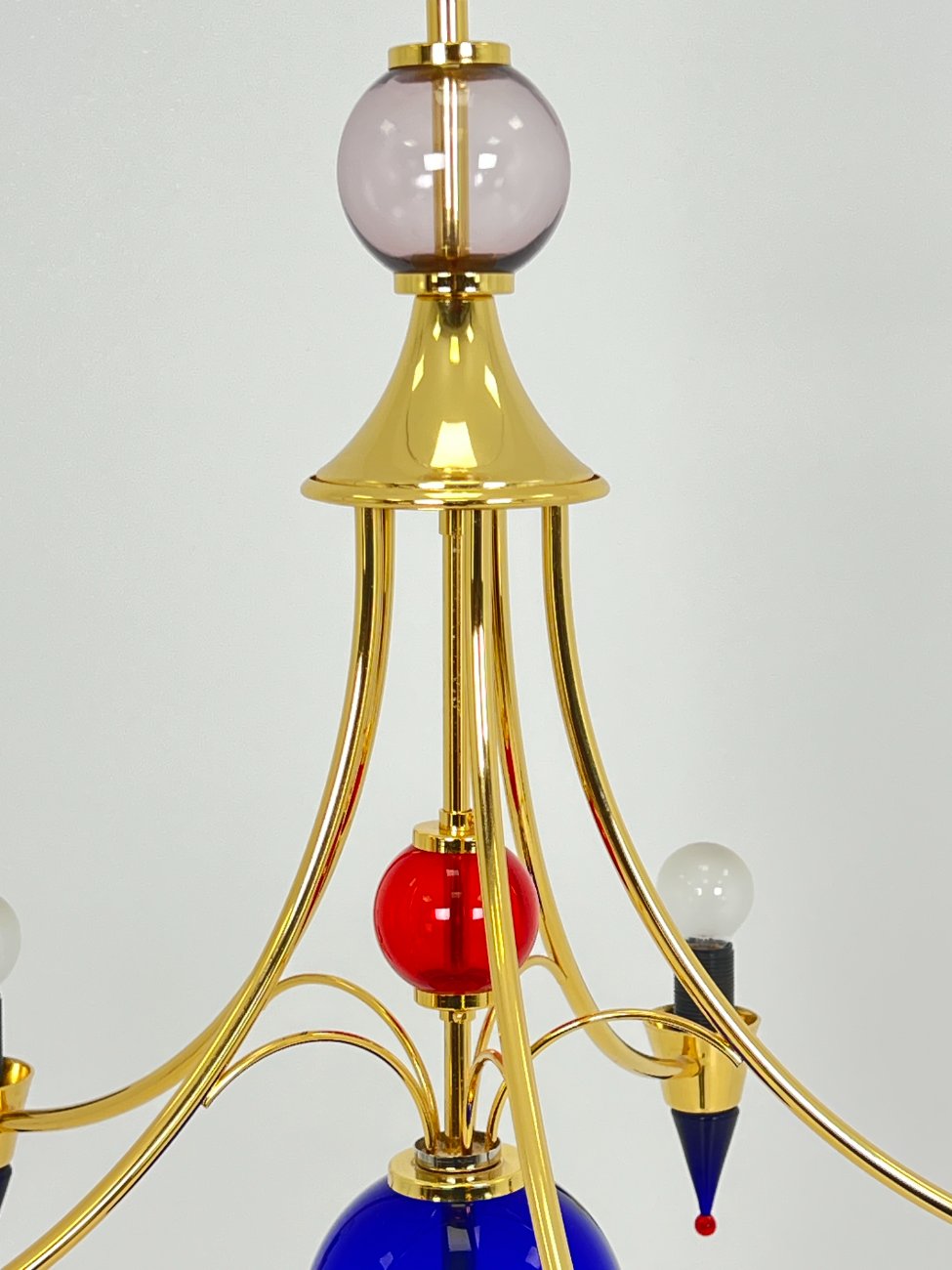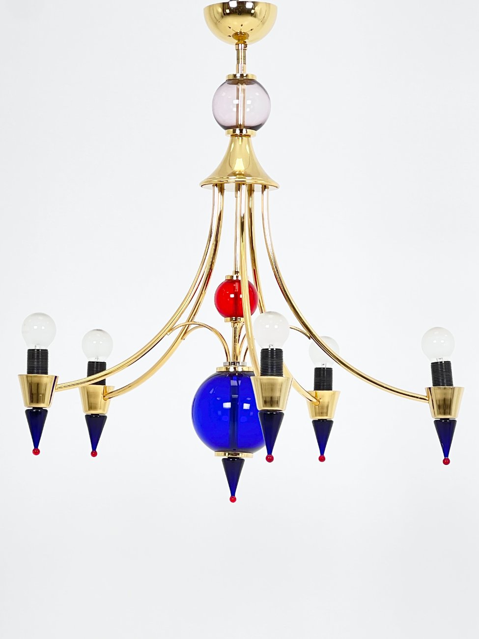 Vintažinis penkių šakų metalinis sietynas su spalvoto stiklo detalėmis.