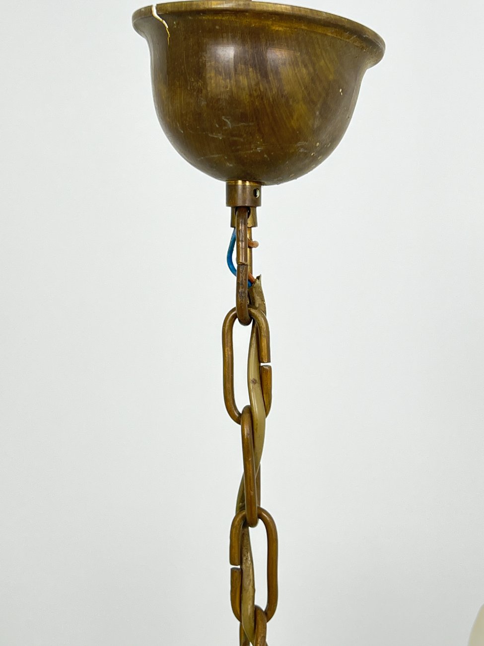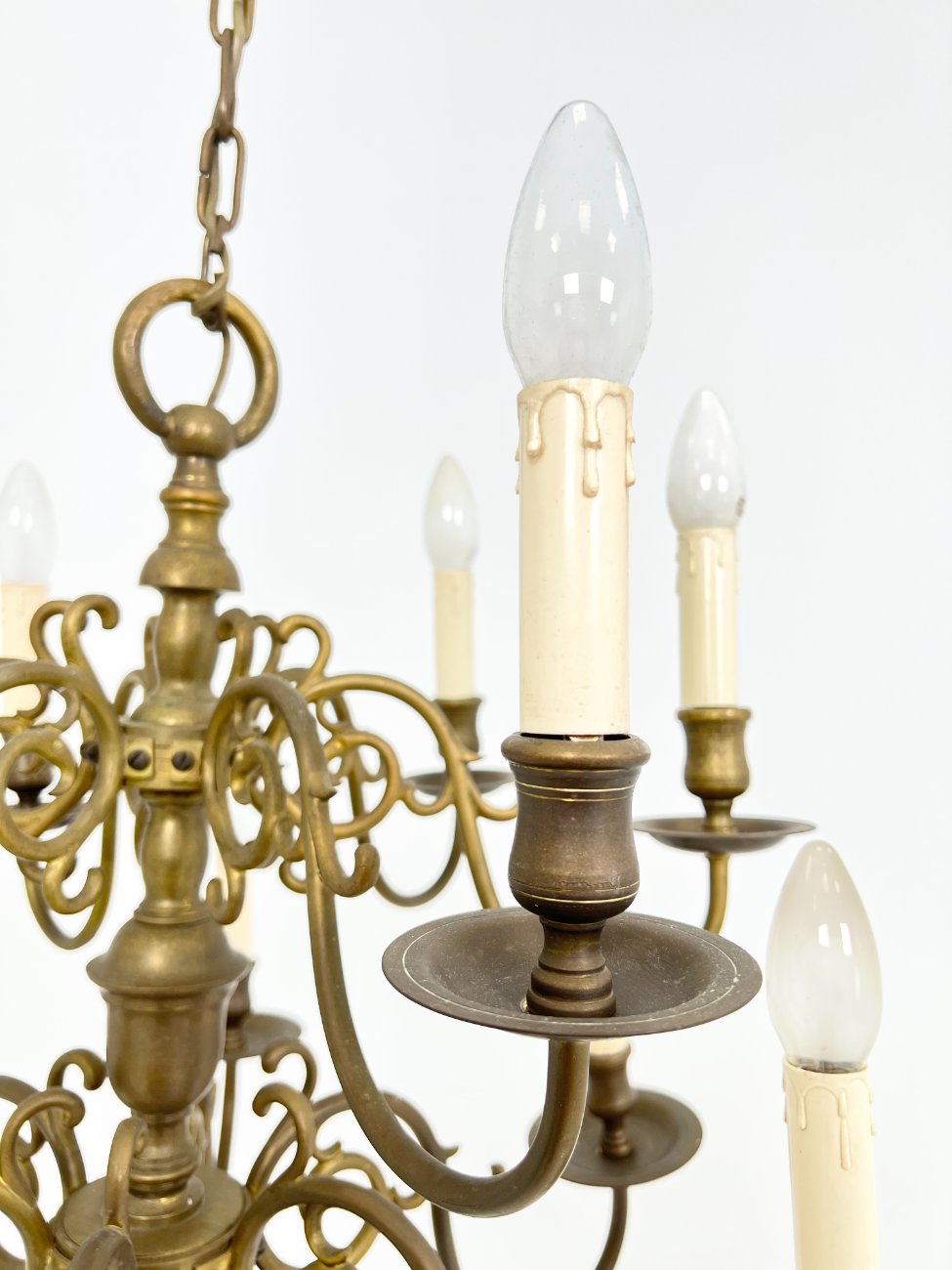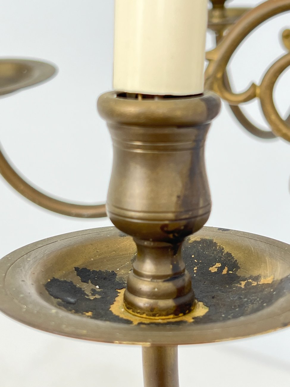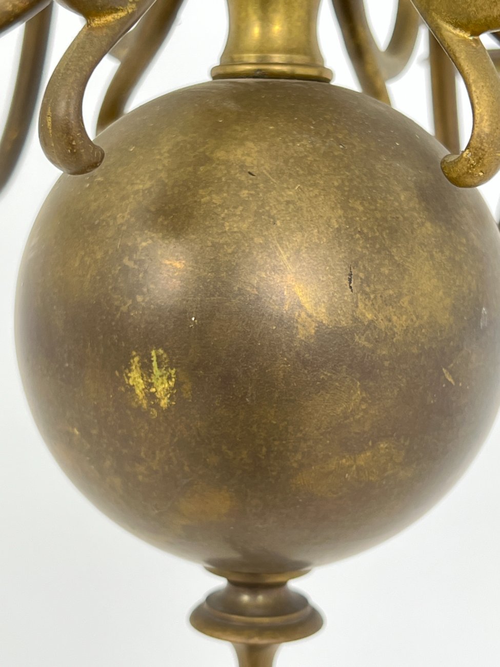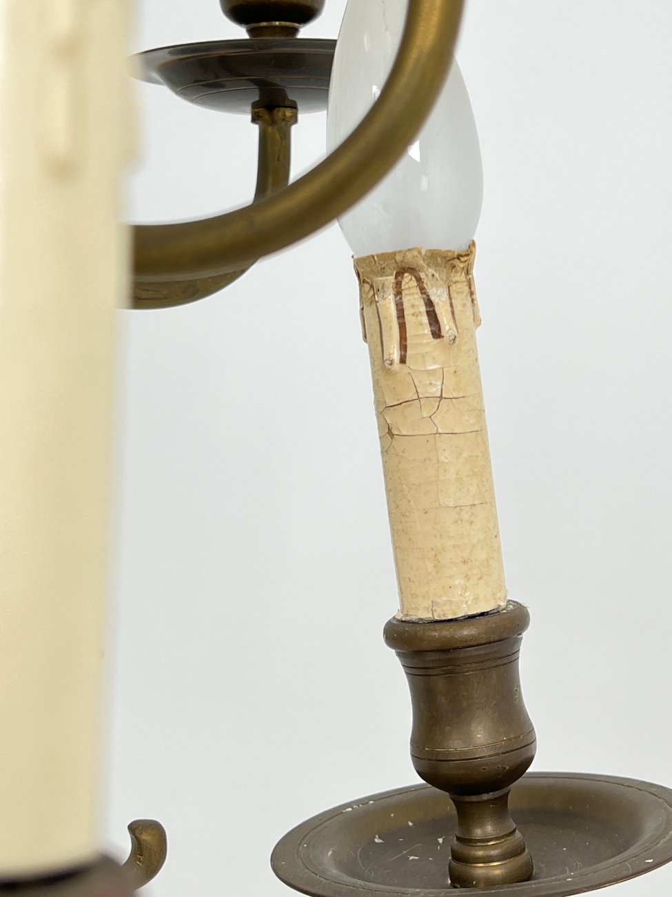 | Papildoma informacija | Suskilinėjusi tvirtinimą prie lubų dengianti detalė. Matoma žalvario oksidacija. Vietomis yra dėmių, pabraižymų. Suskilinėjusi viena žvakės imitacijos detalė. |