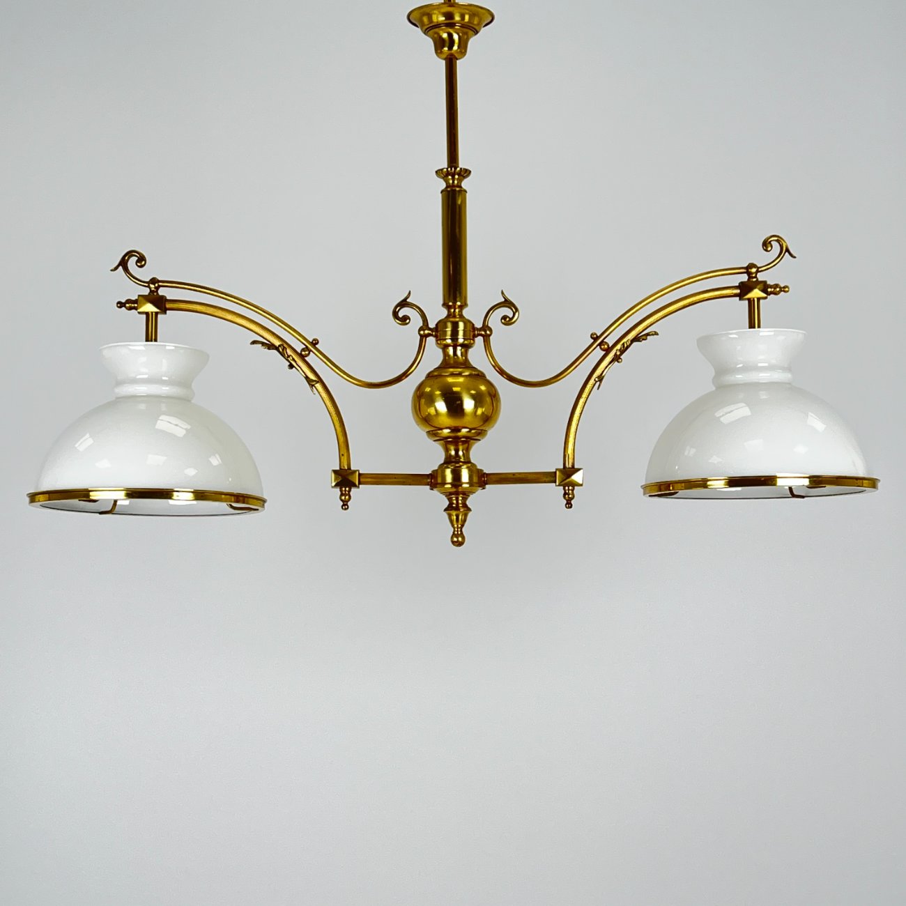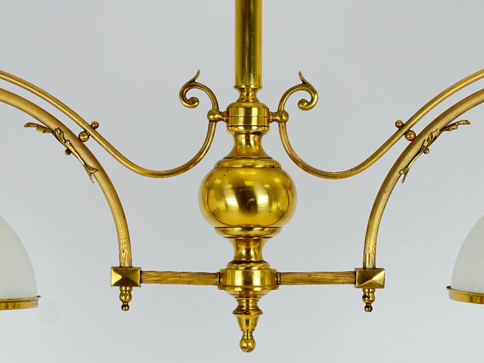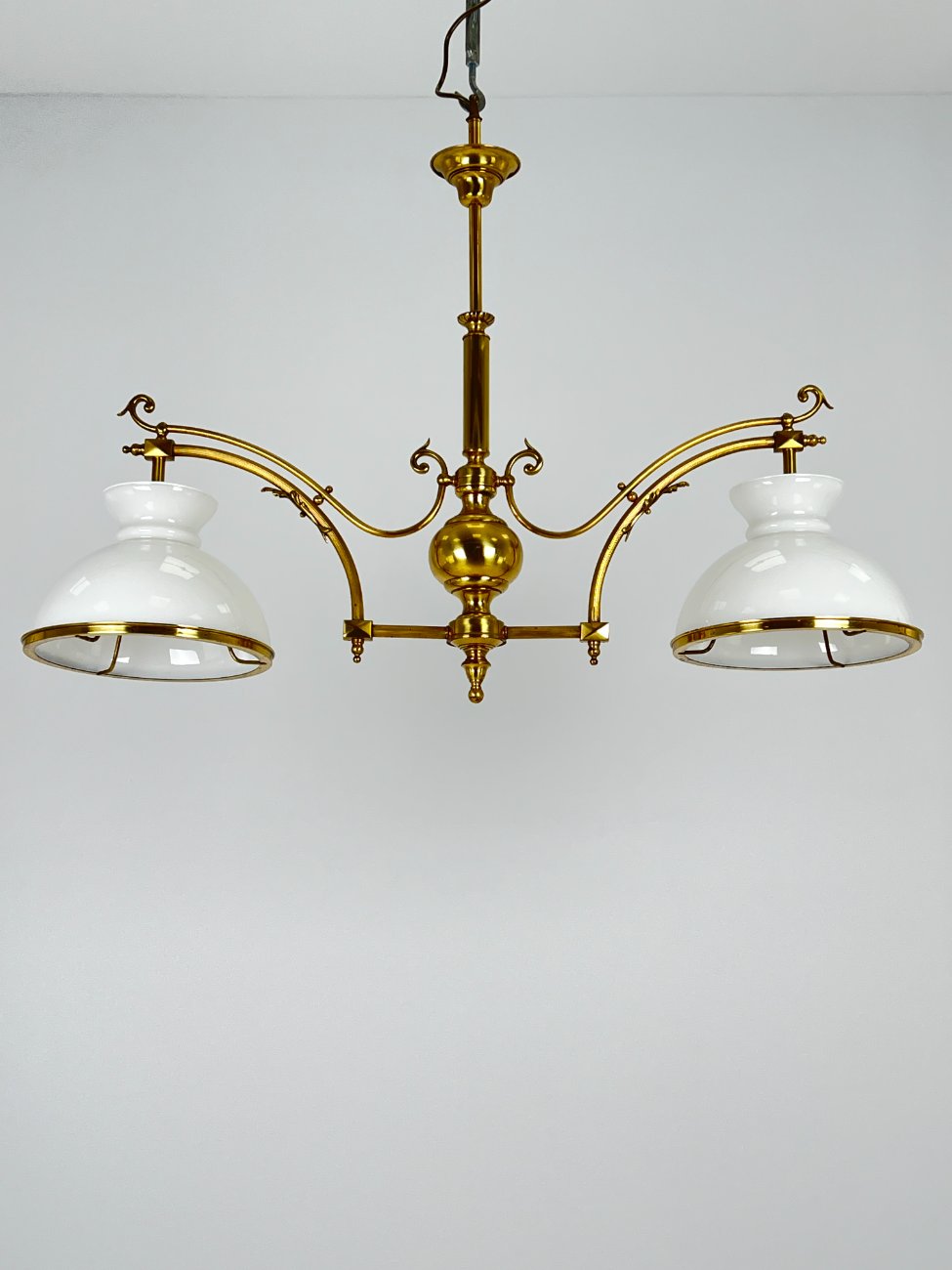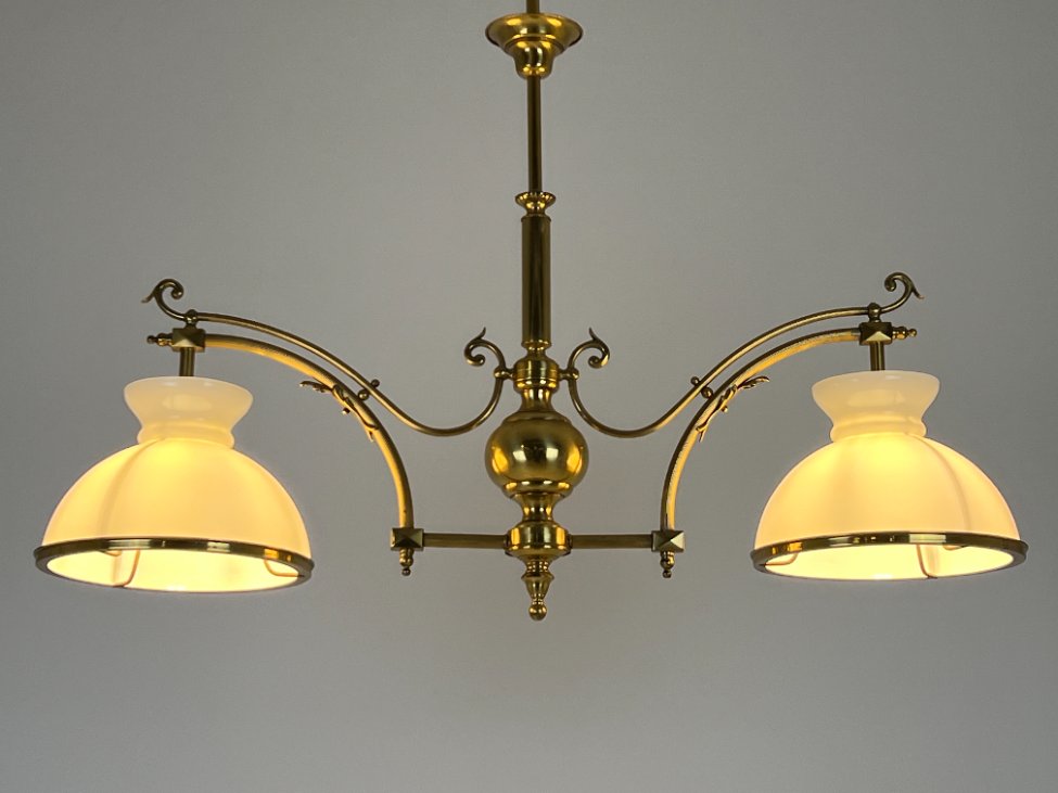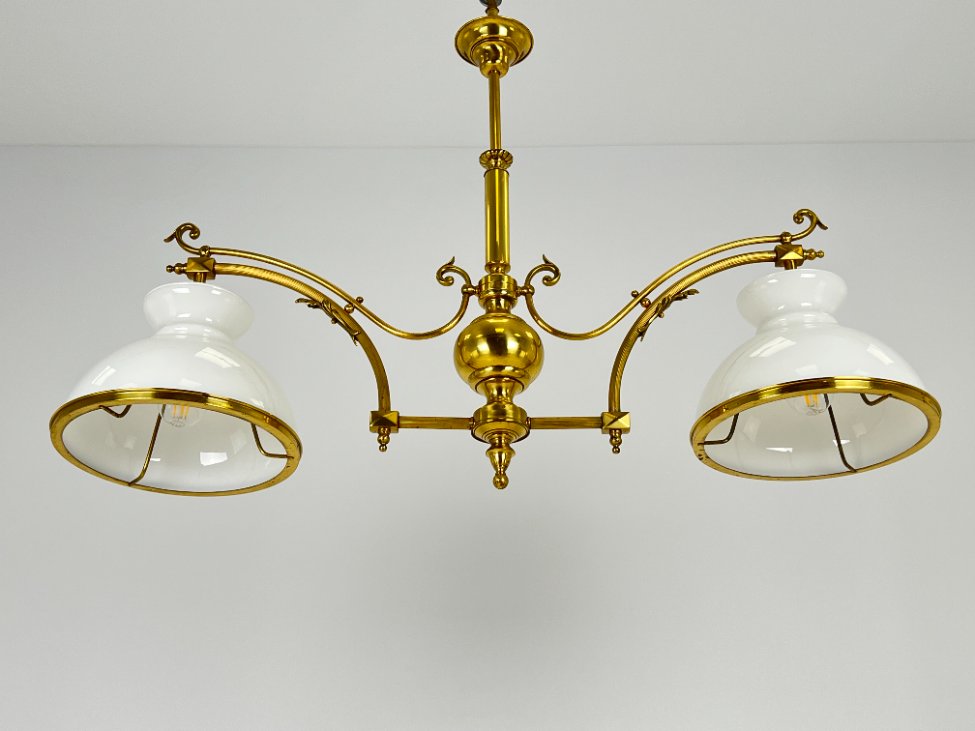 Žalvarinis pakabinamas dviejų šakų sietynas su stiklo gaubtais 26x110x79 cm