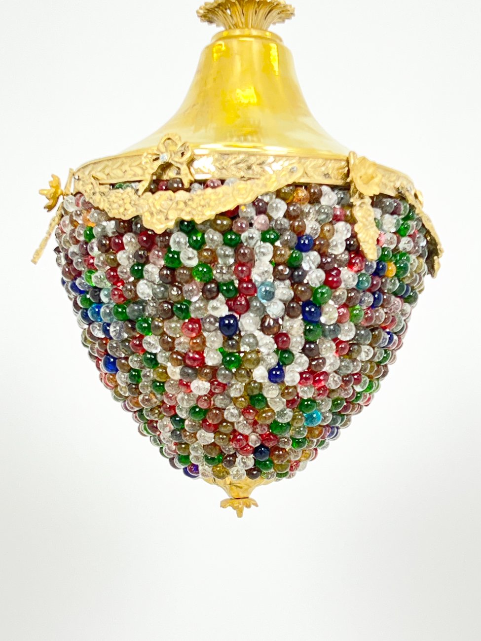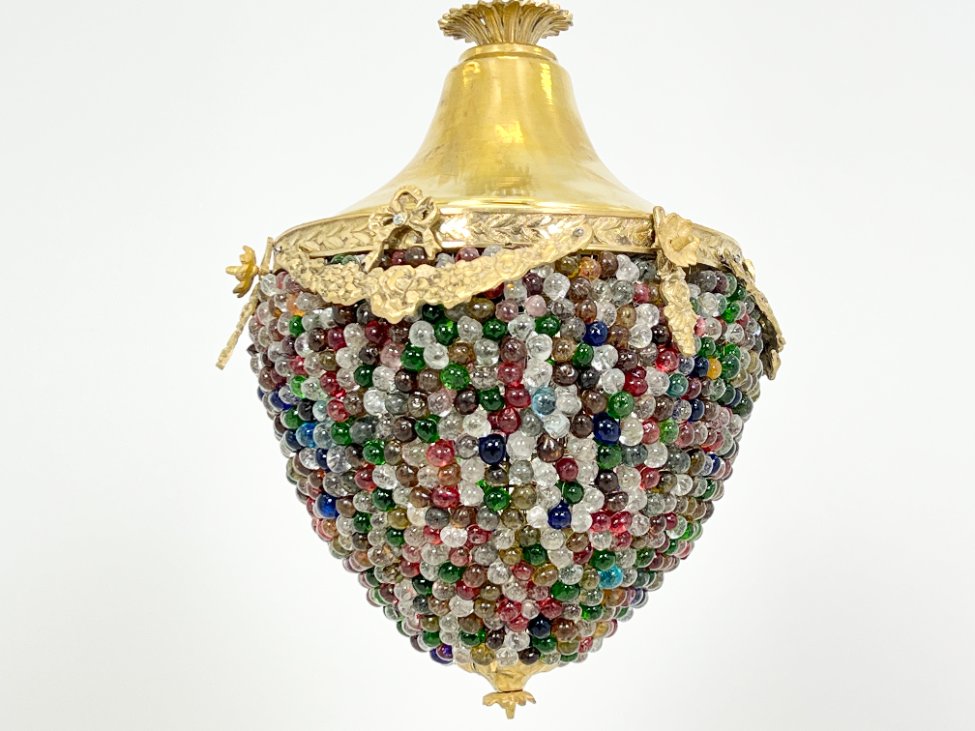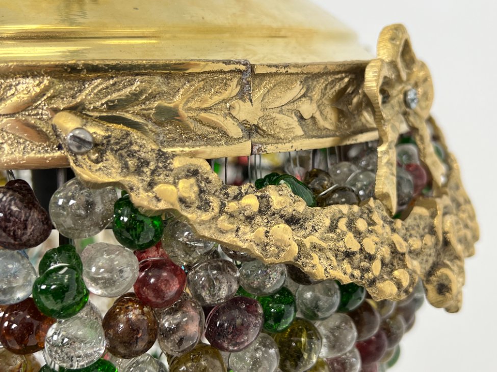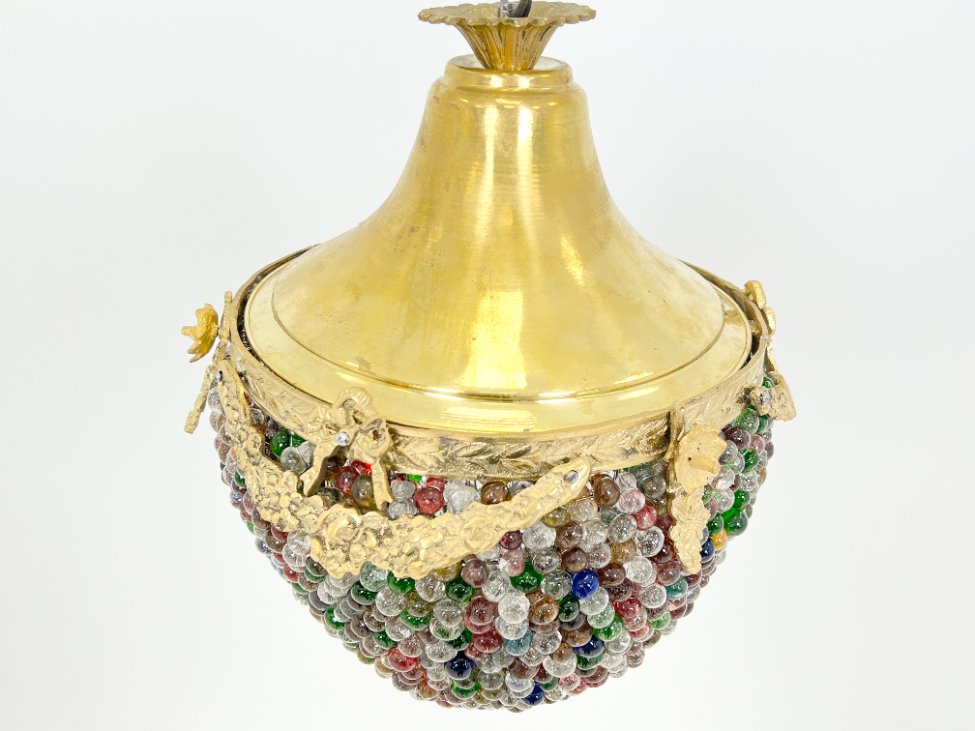 Žalvarinis pakabinamas šviestuvas su spalvoto stiklo karoliukais.