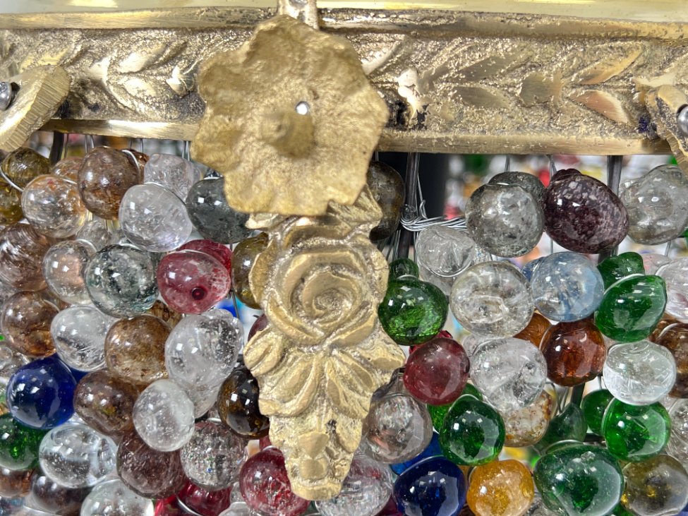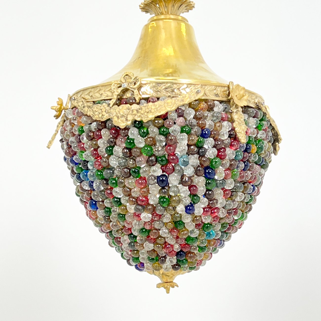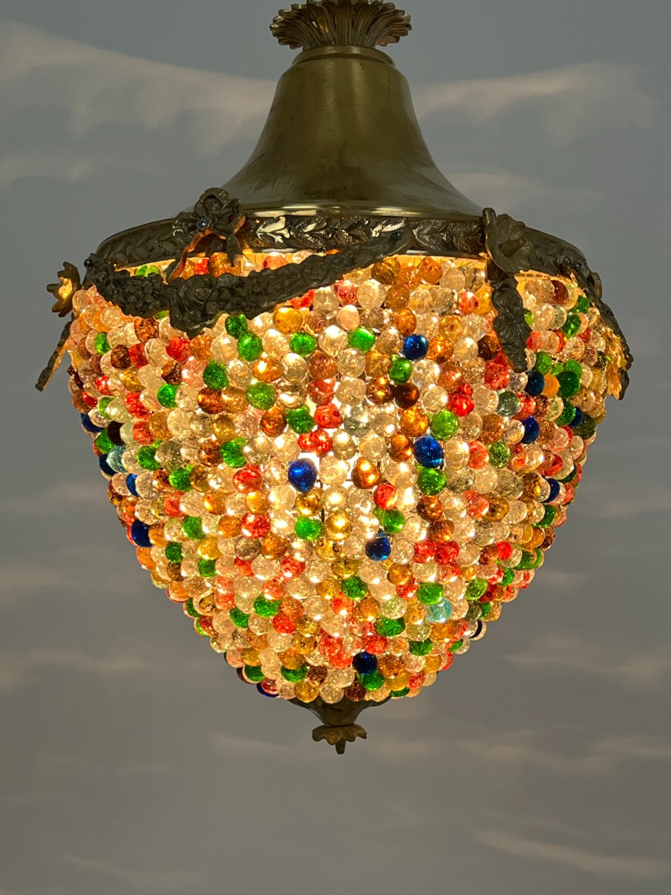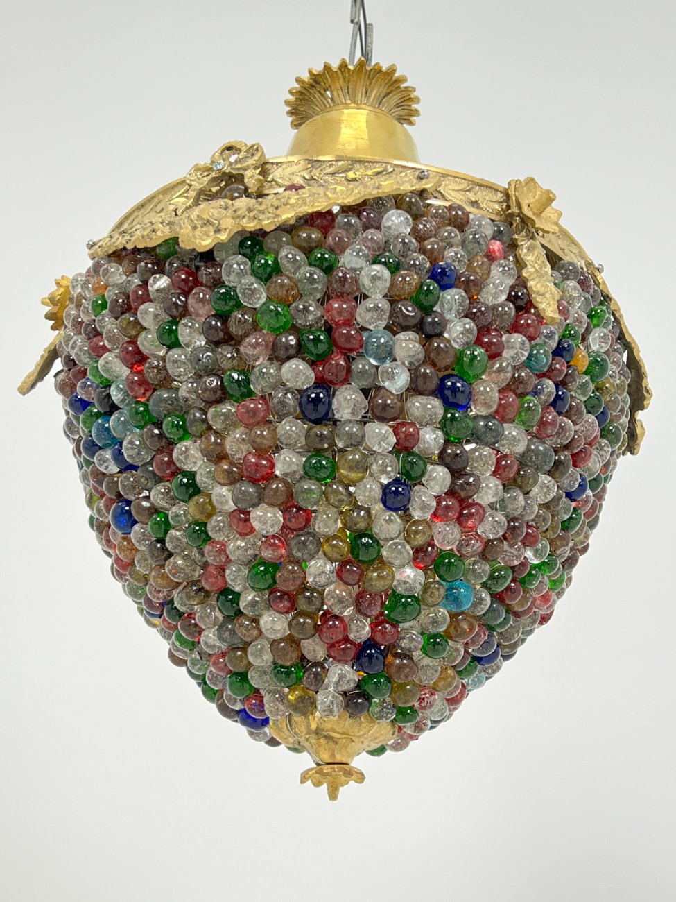 Žalvarinis pakabinamas šviestuvas su spalvoto stiklo karoliukais.