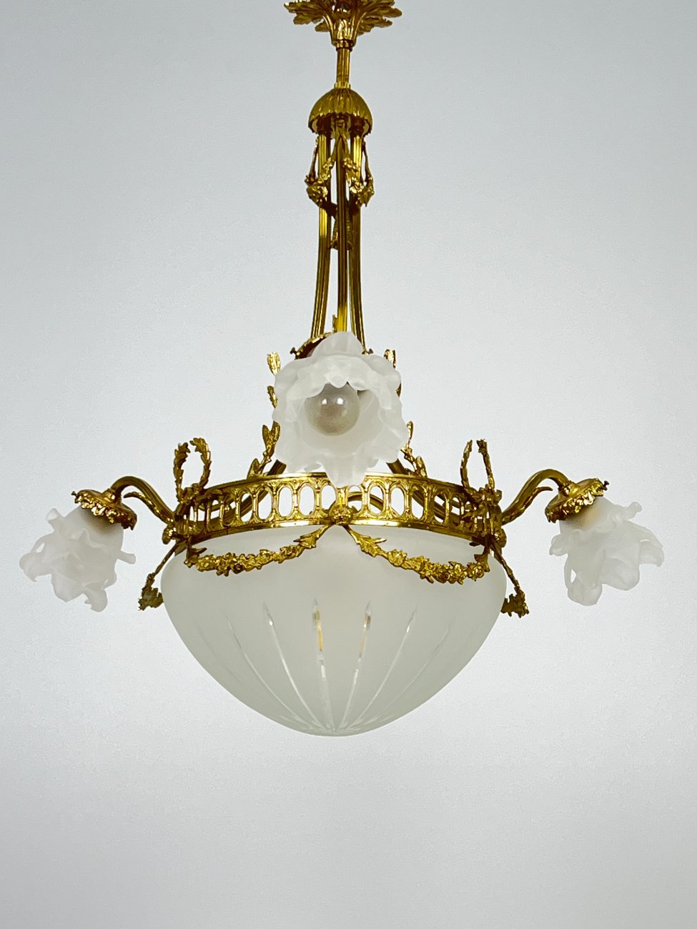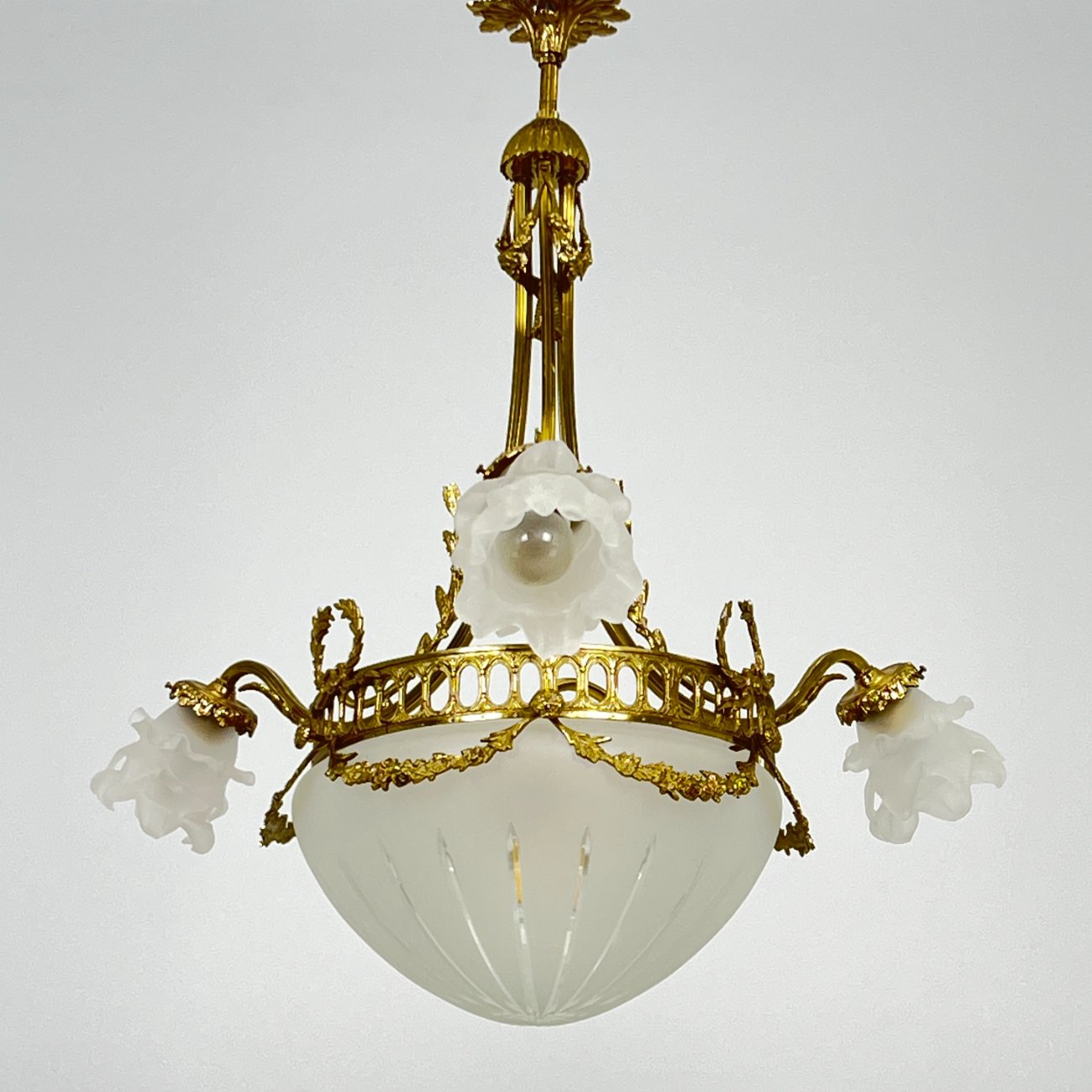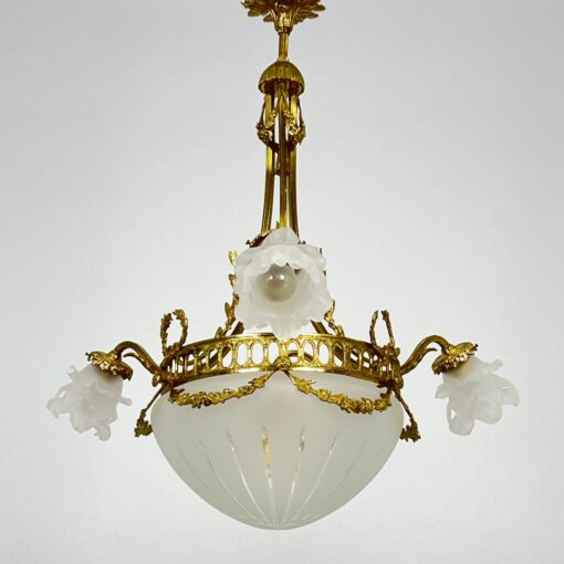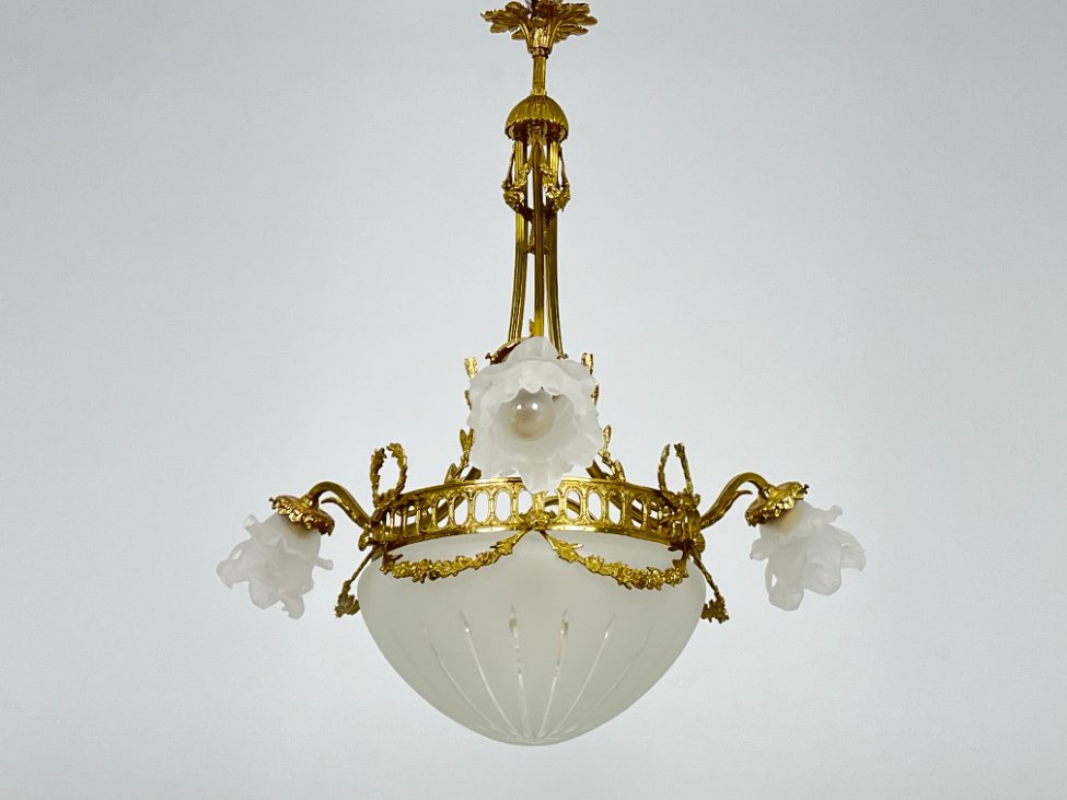 Žalvarinis pakabinamas trijų šakų sietynas su stiklo gaubtais.