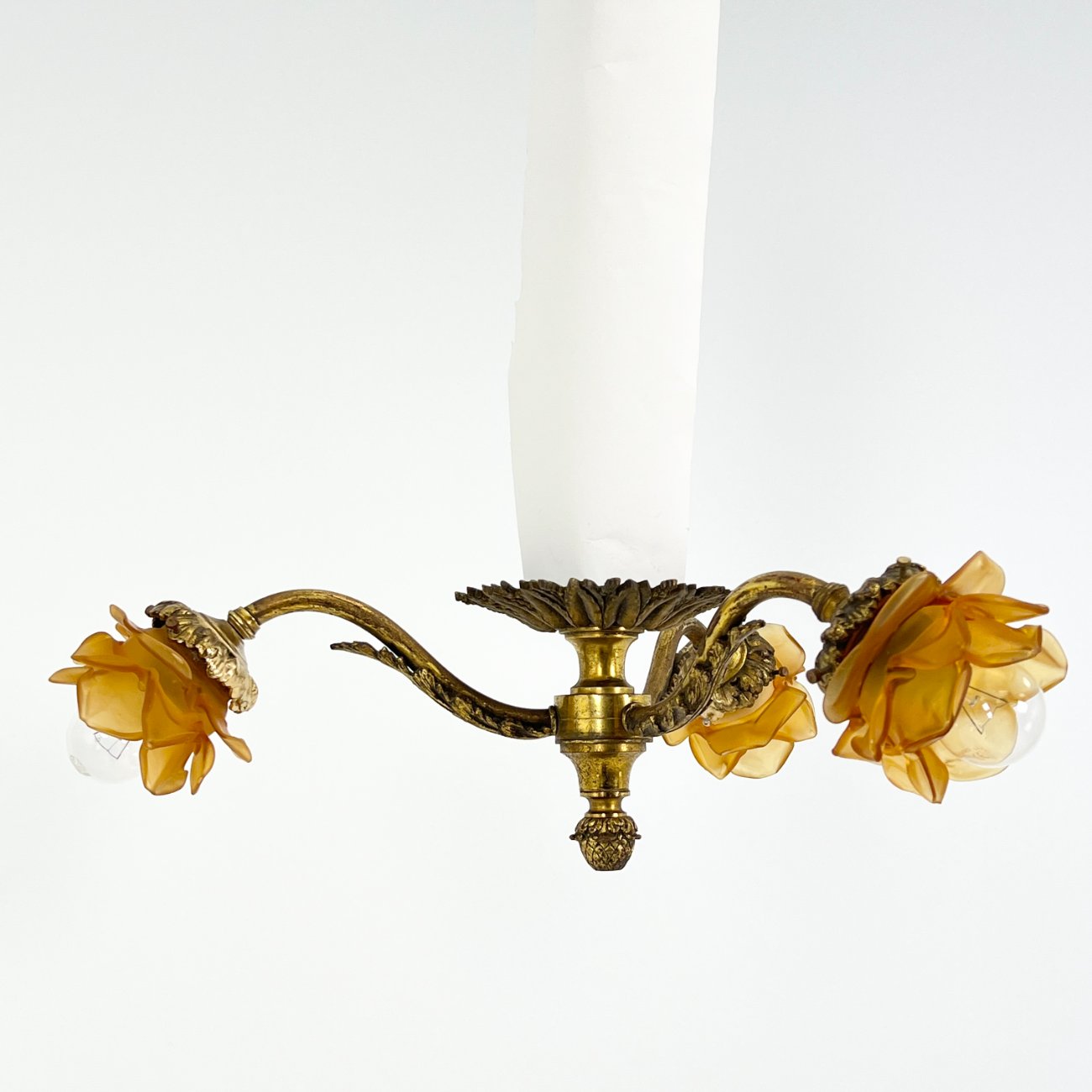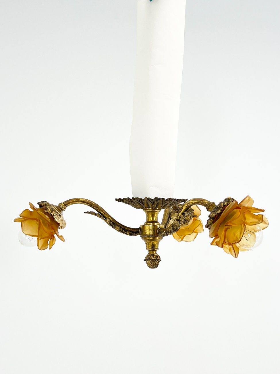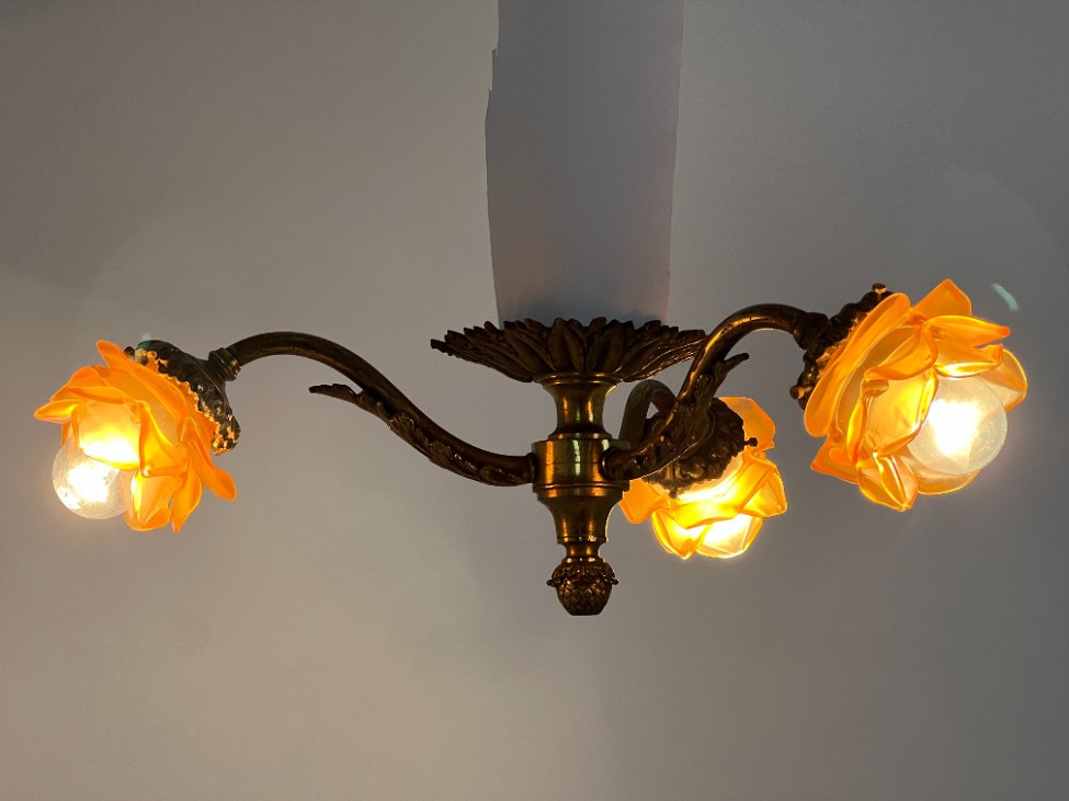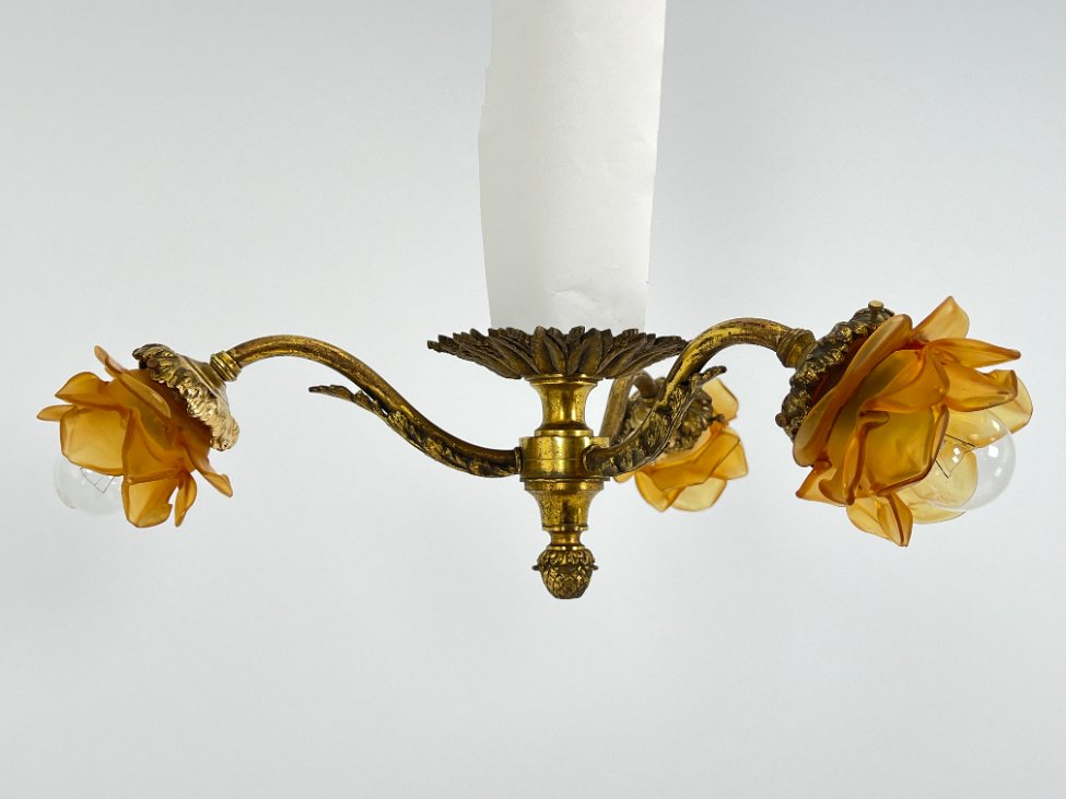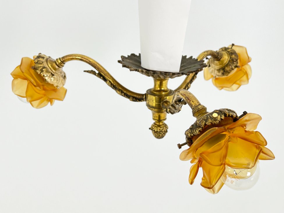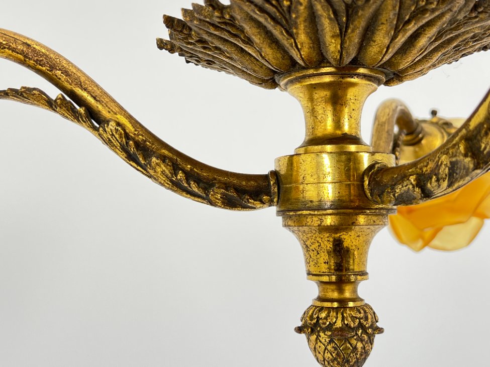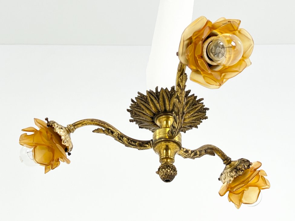 Žalvarinis pakabinamas trijų šakų šviestuvas su stiklo gaubtais 52x52x18 cm