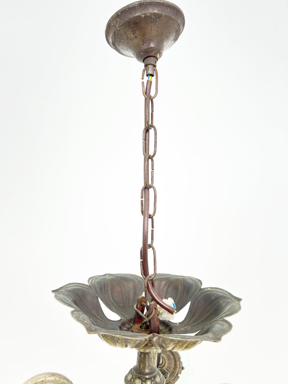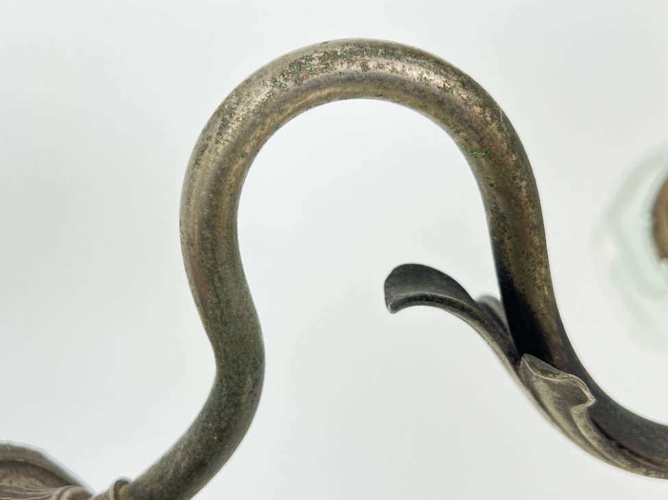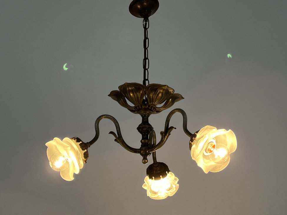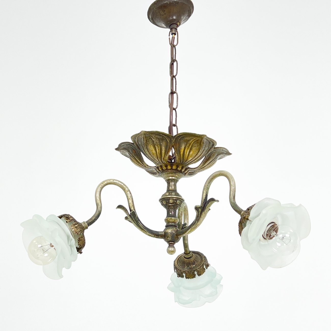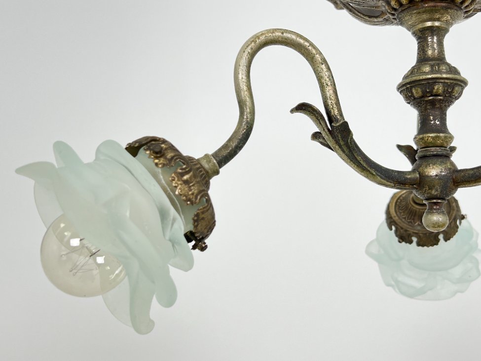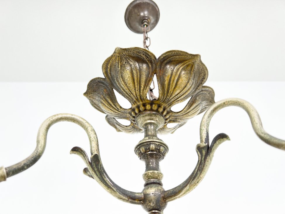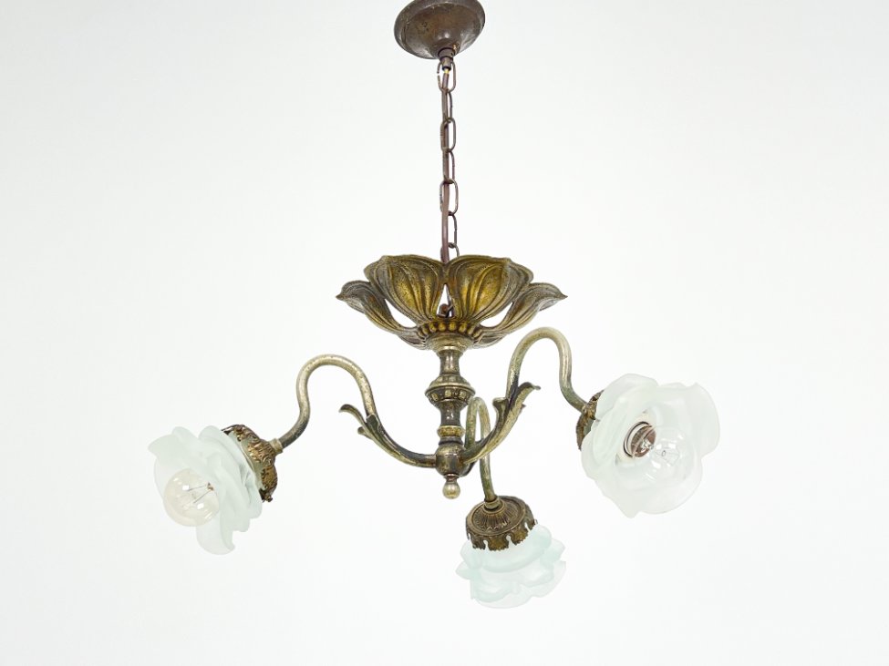 Žalvarinis trijų šakų sietynas su gėlės žiedo formos stiklo gaubtais.