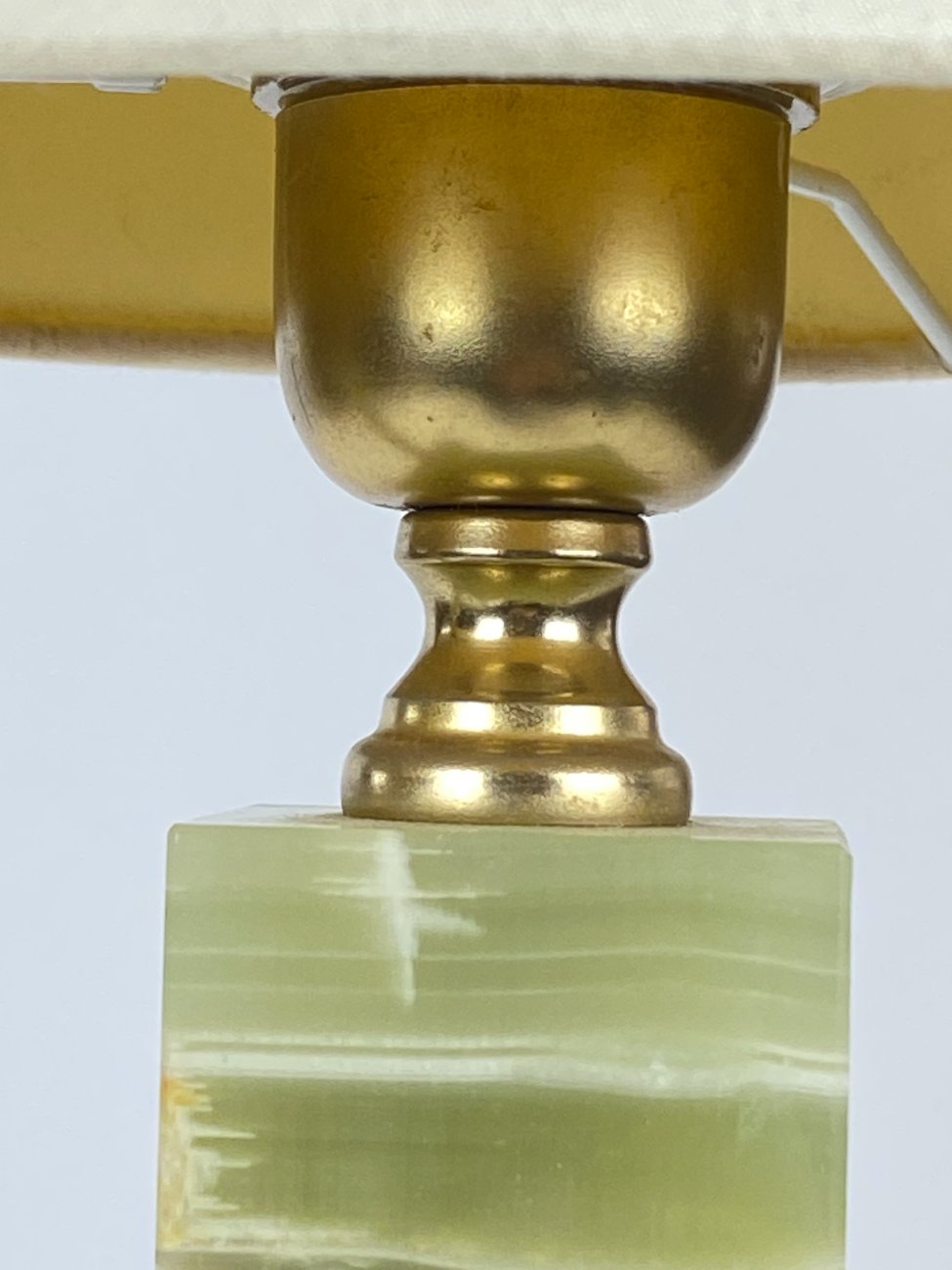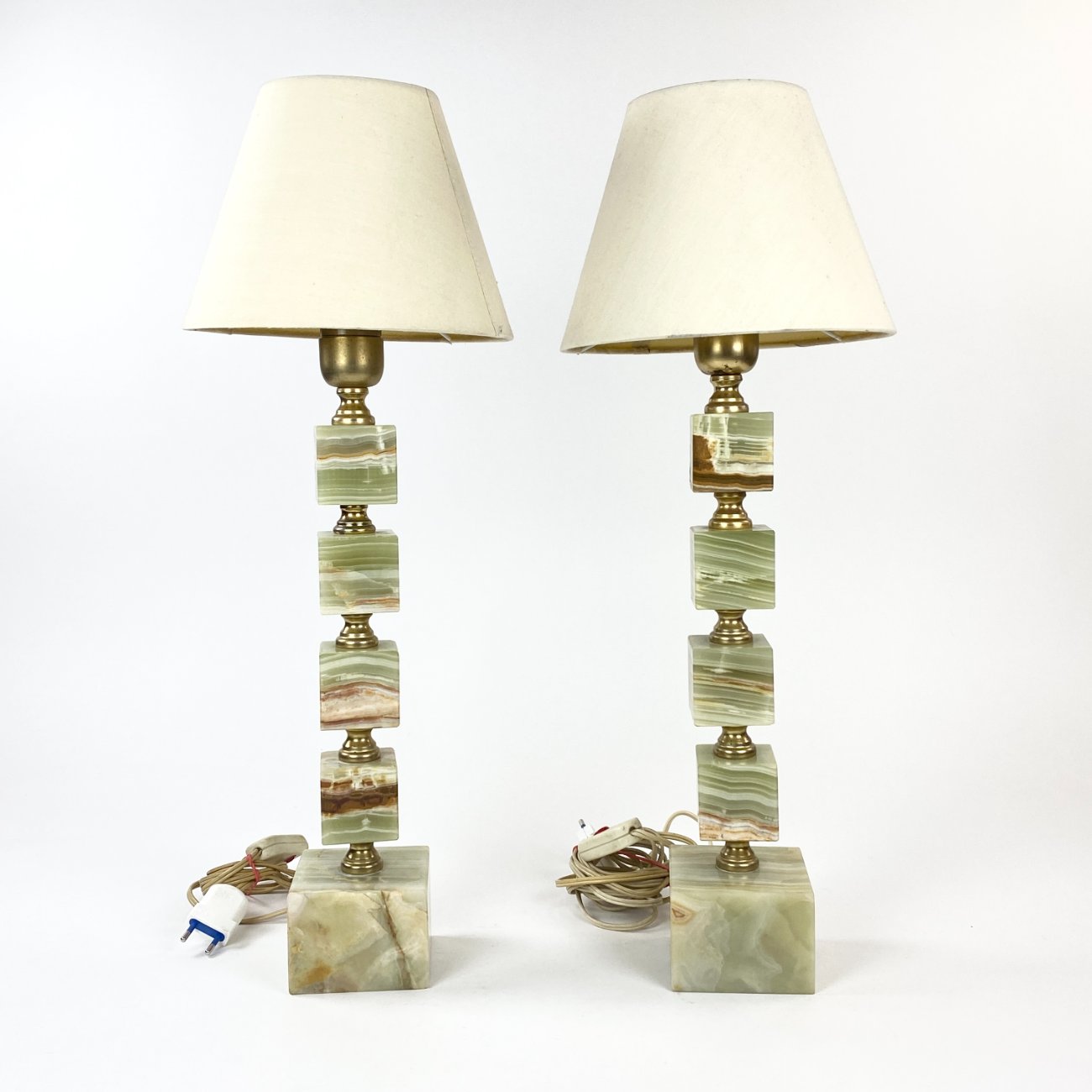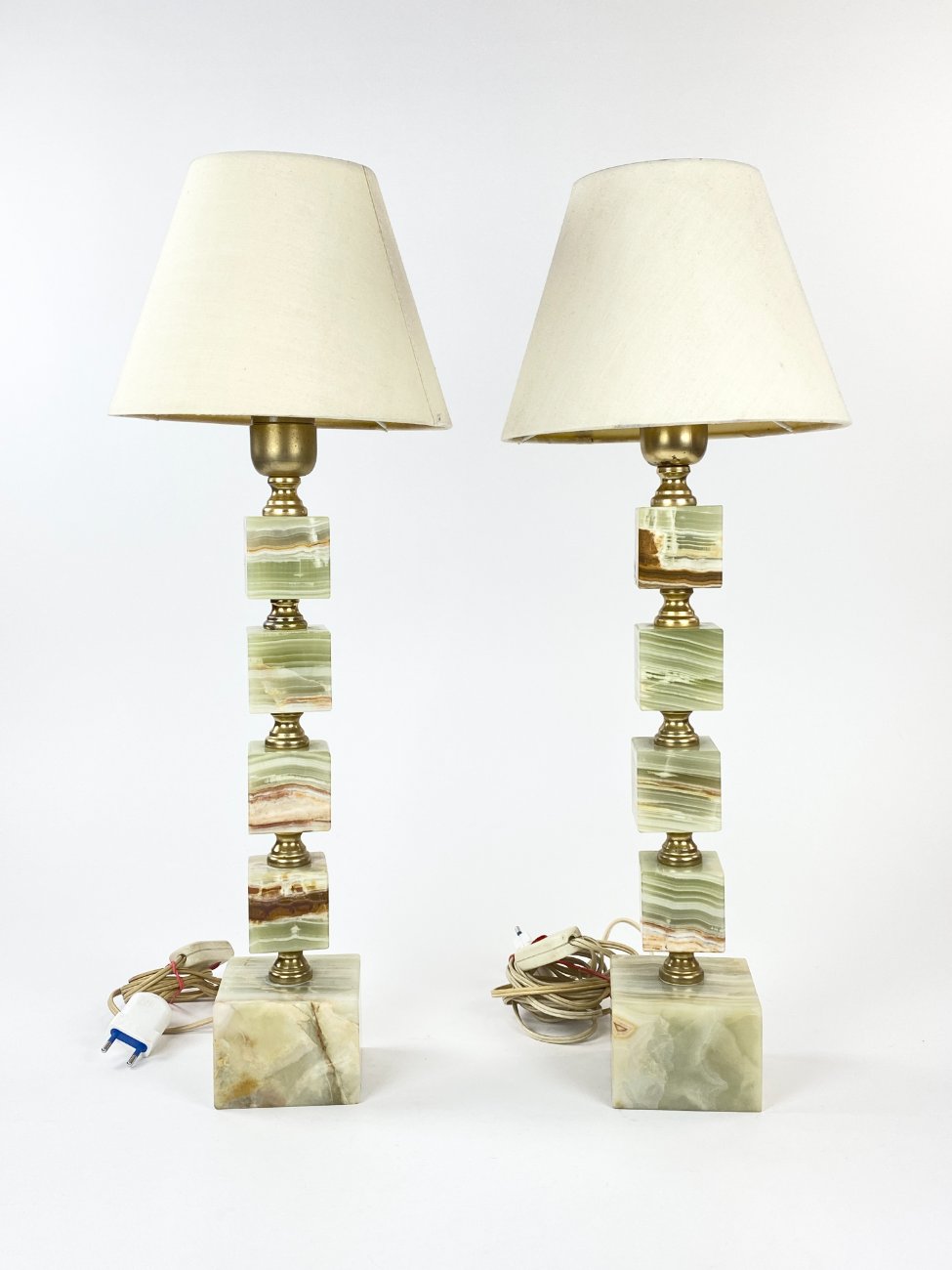 Staliniai šviestuvai iš onikso ir žalvario su šviesiais tekstilės gaubtais 2 vnt. komplektas.