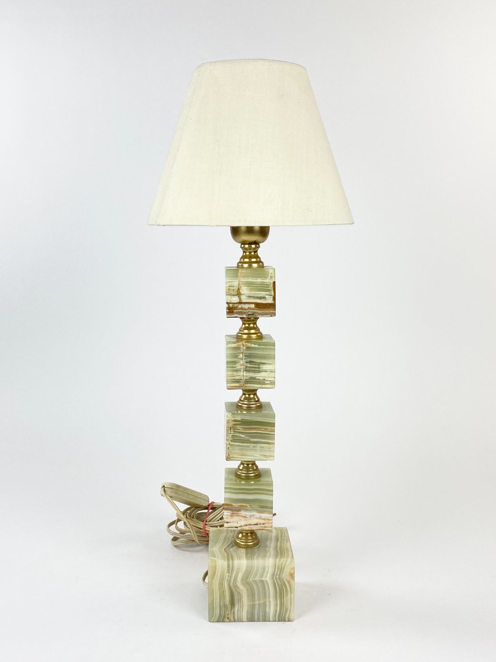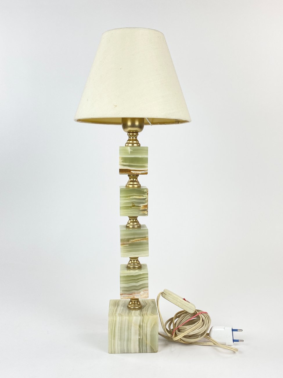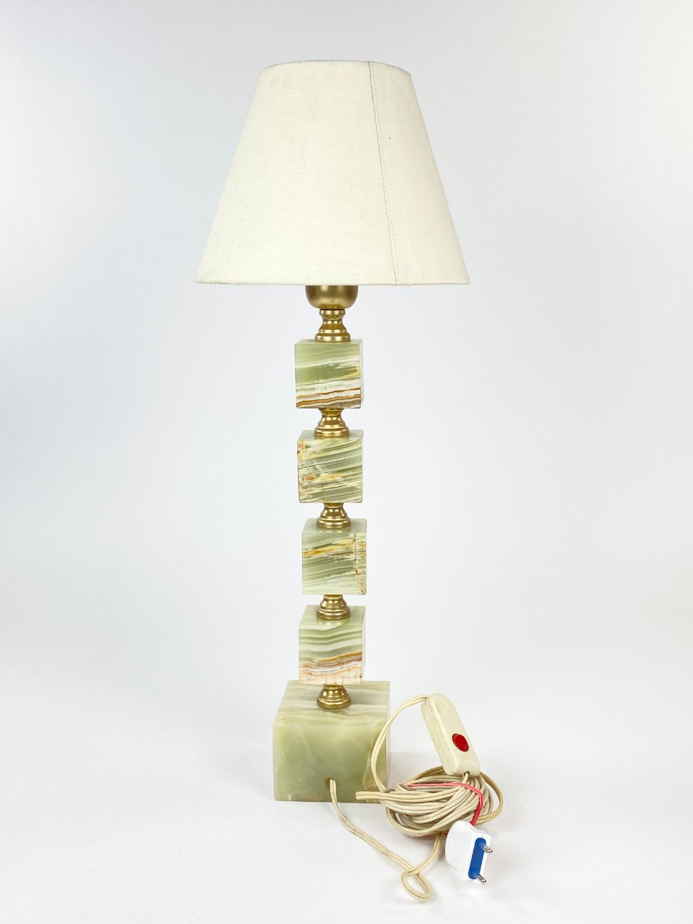Staliniai šviestuvai iš onikso ir žalvario su šviesiais tekstilės gaubtais 2 vnt. komplektas.