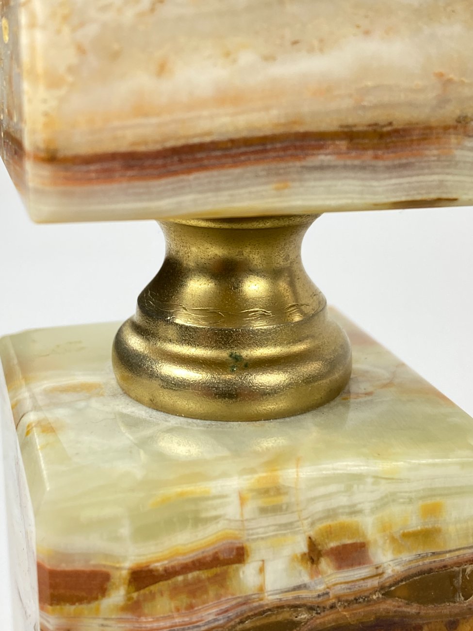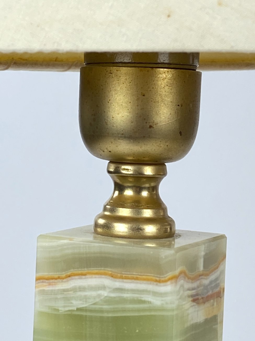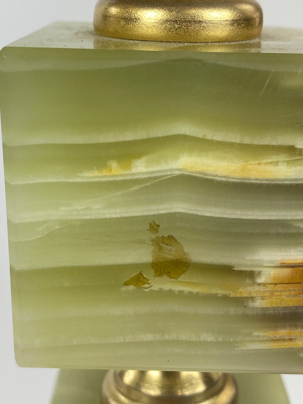 | Papildoma informacija | Ant abiejų šviestuvų vietomis yra nuskeltų onikso kampukų. Ant abiejų šviestuvų matoma žalvario oksidacija. Ant abiejų šviestuvų gaubtų yra dėmių. |