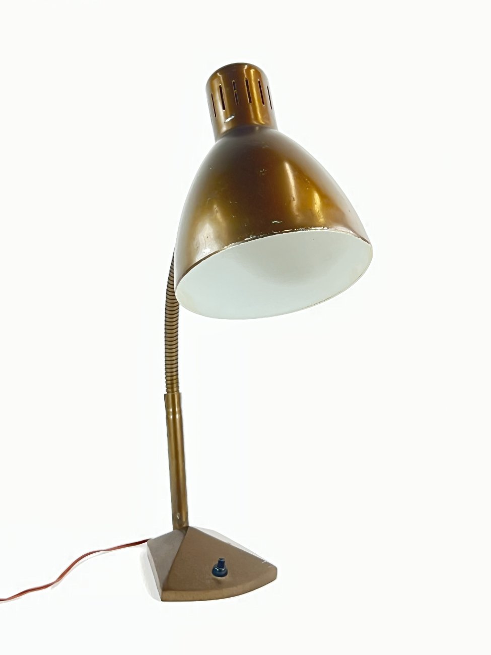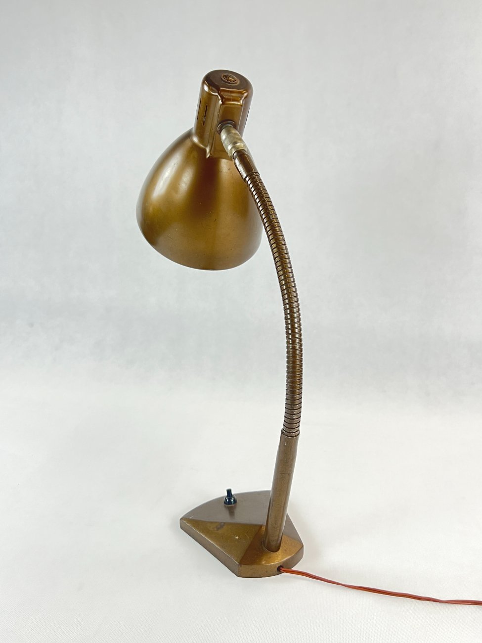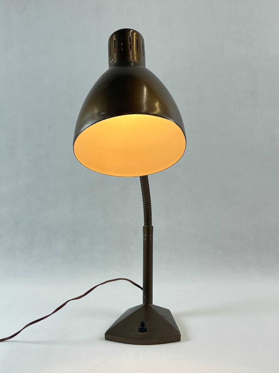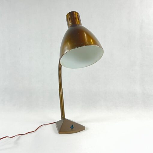 Vintažinis bronzos spalvos reguliuojamas stalinis šviestuvas.