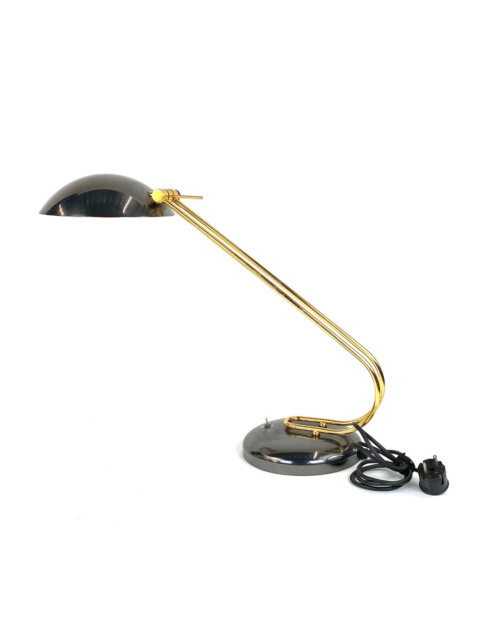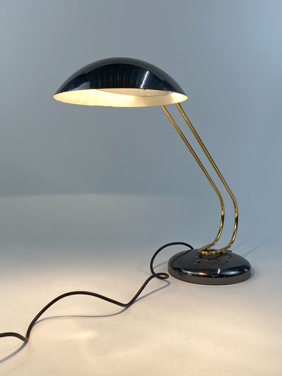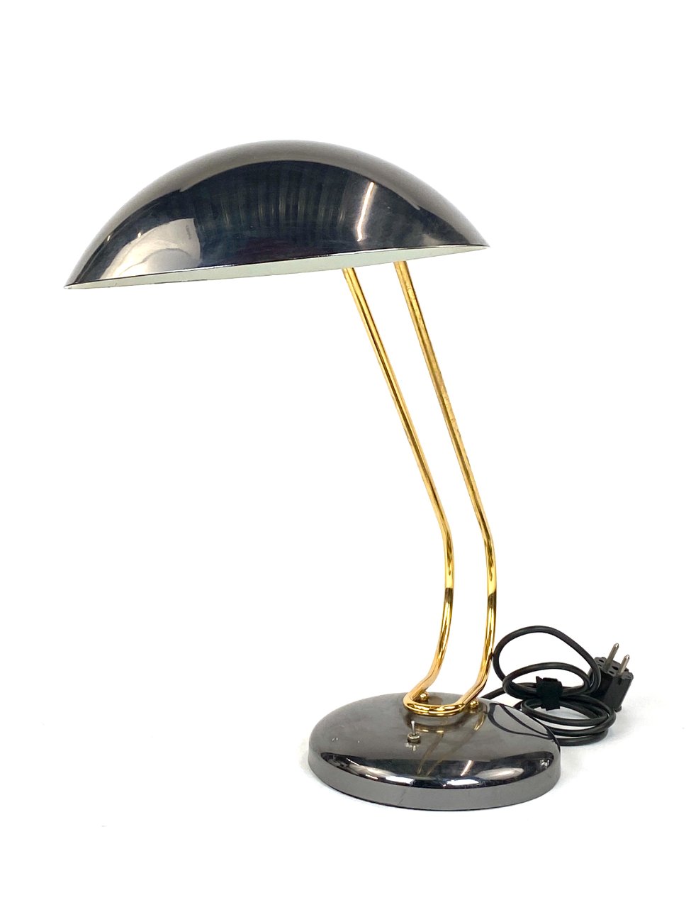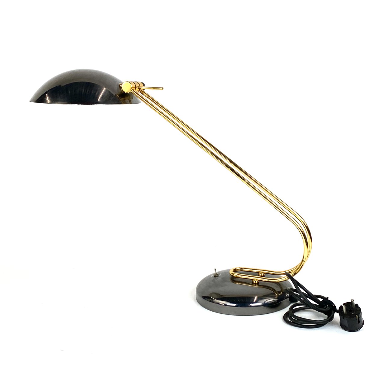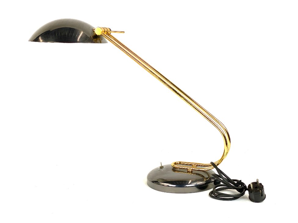 Vintažinis metalinis stalinis šviestuvas reguliuojamo kampo gaubtu.
