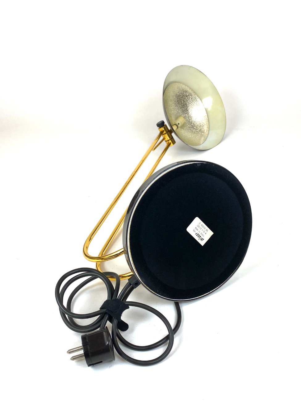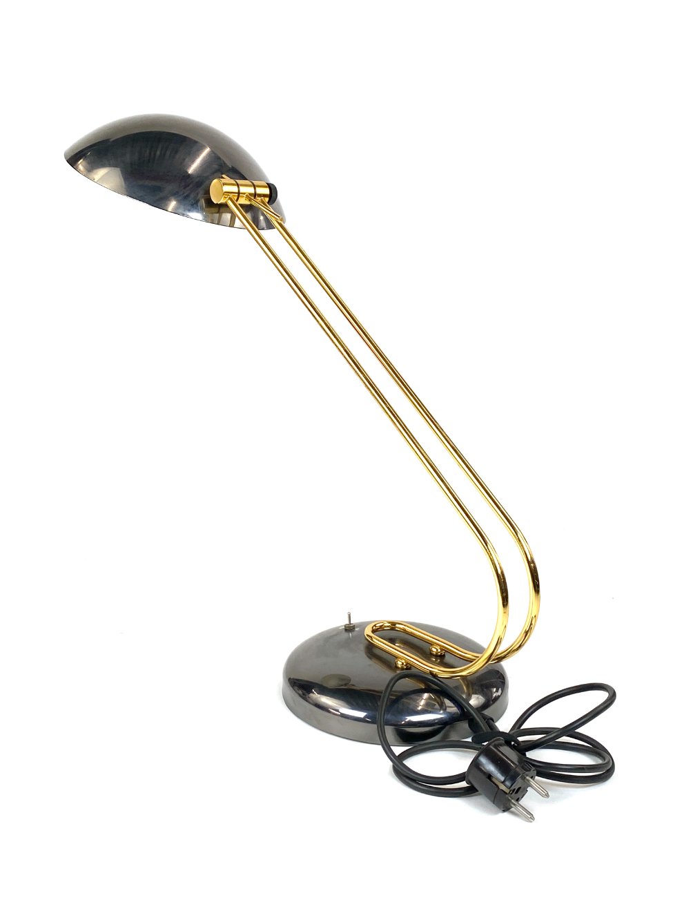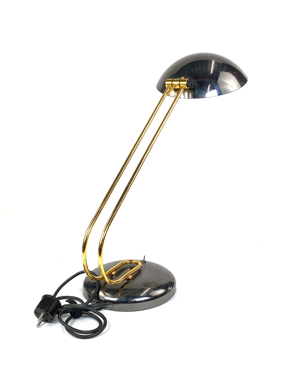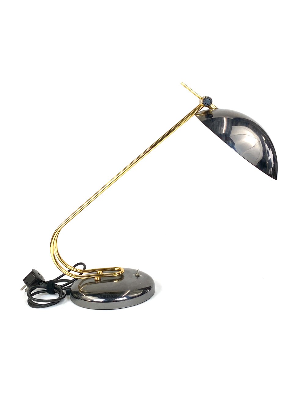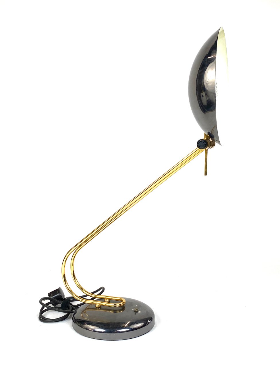Vintažinis metalinis stalinis šviestuvas reguliuojamo kampo gaubtu.