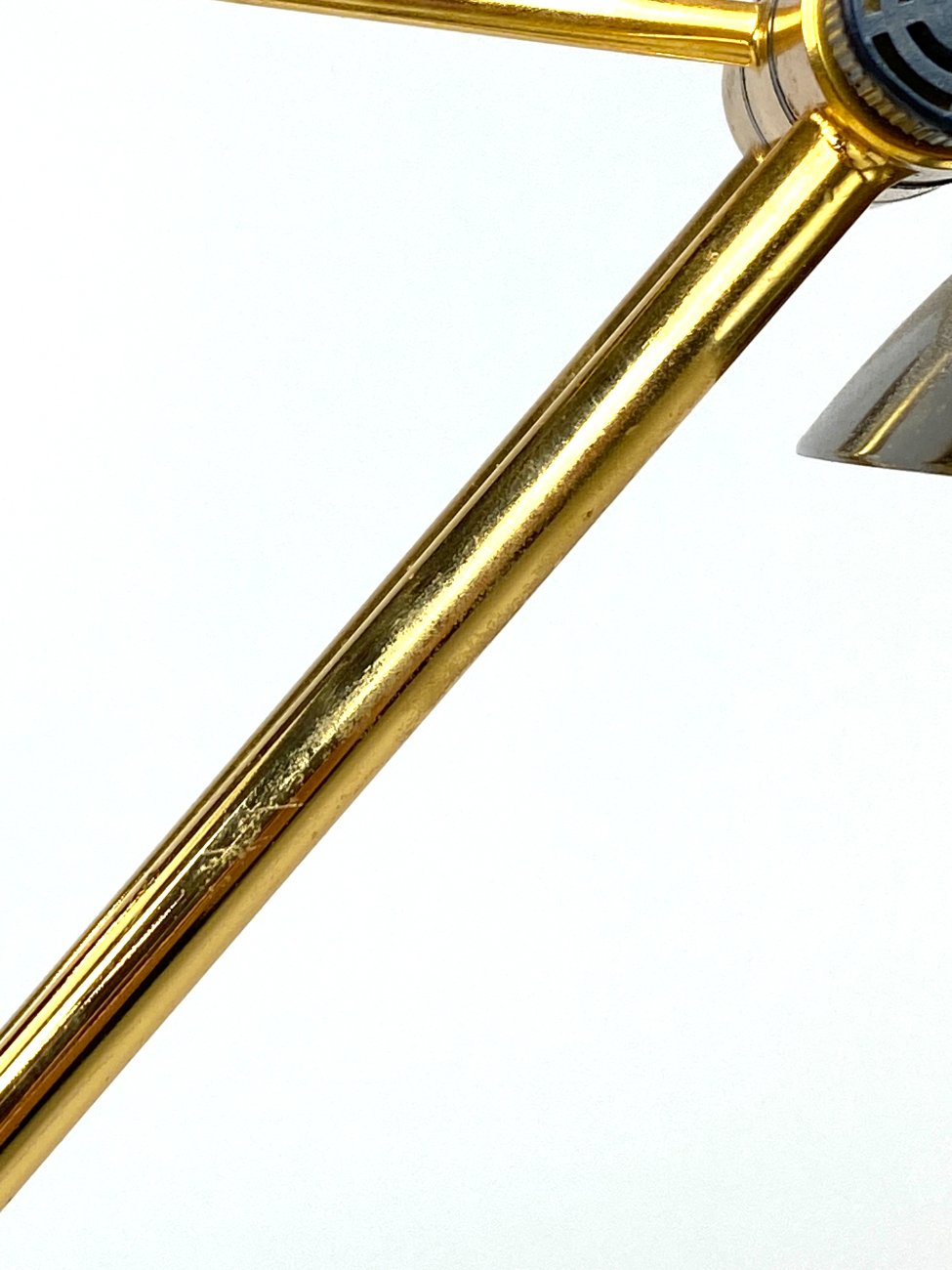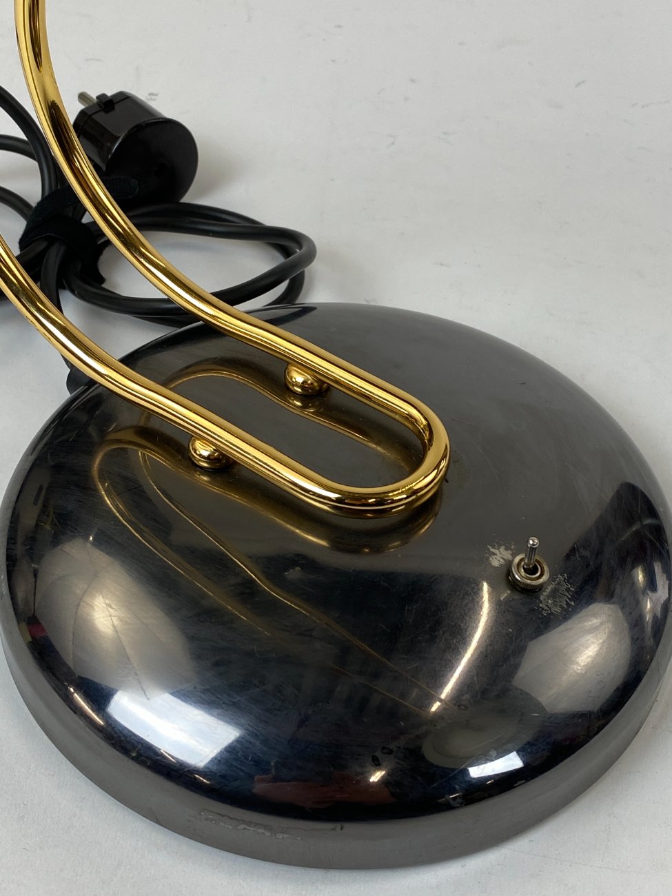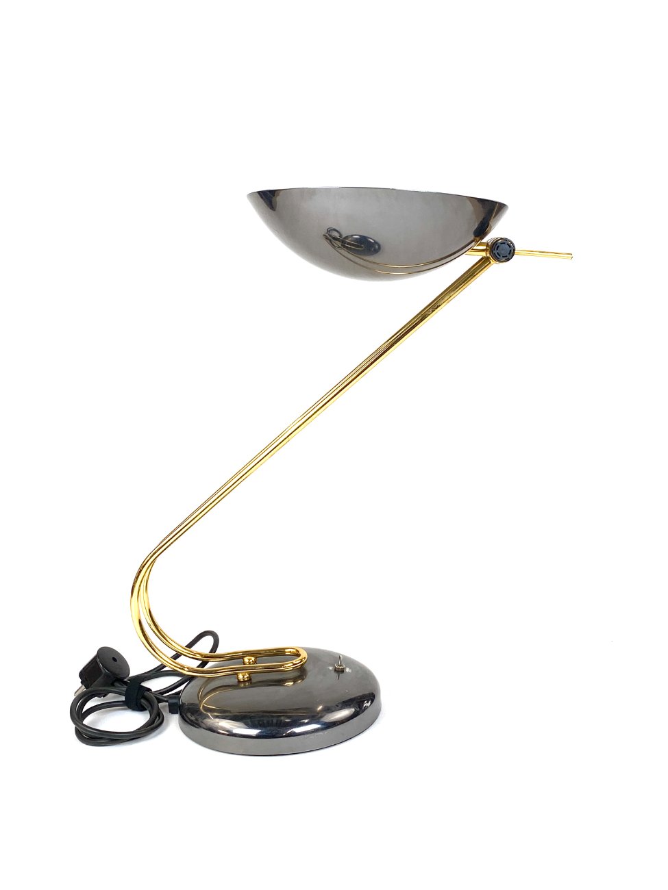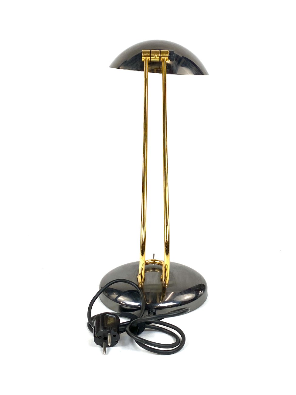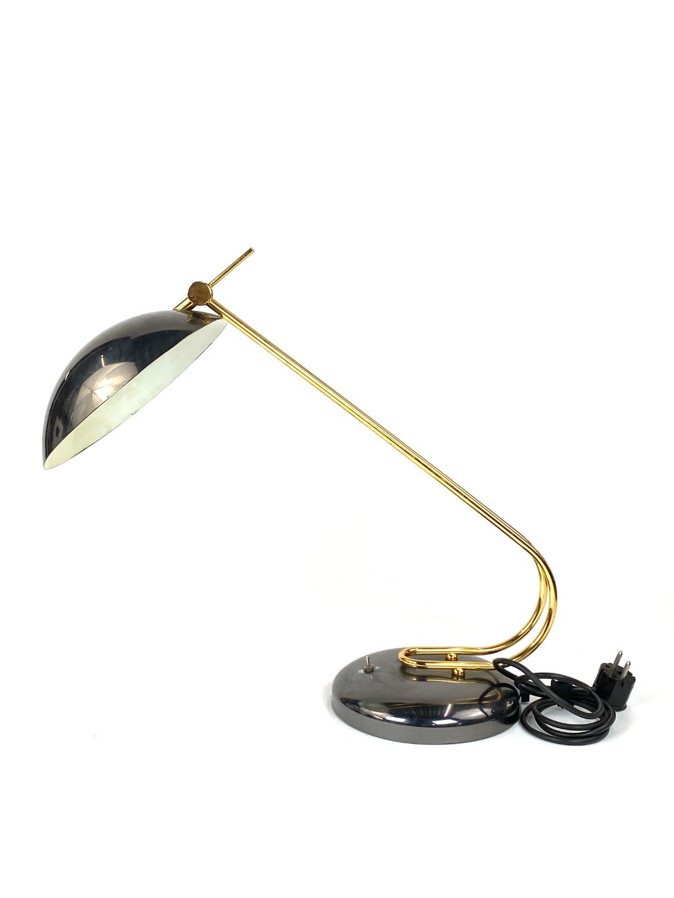 Vintažinis metalinis stalinis šviestuvas reguliuojamo kampo gaubtu.
