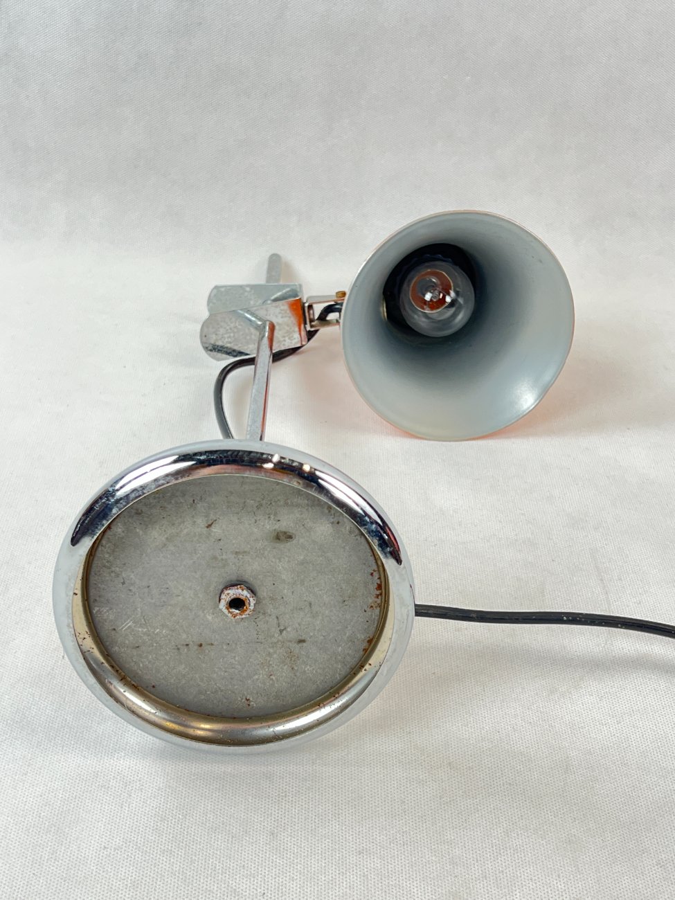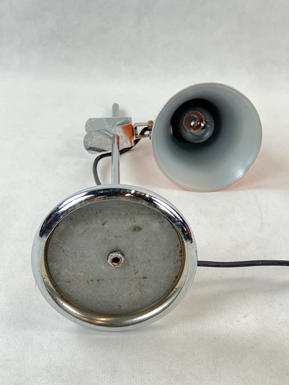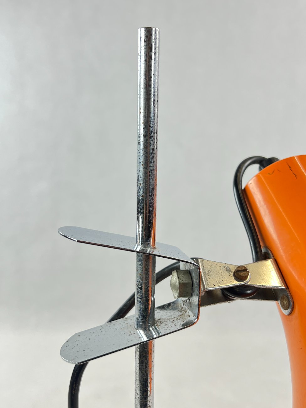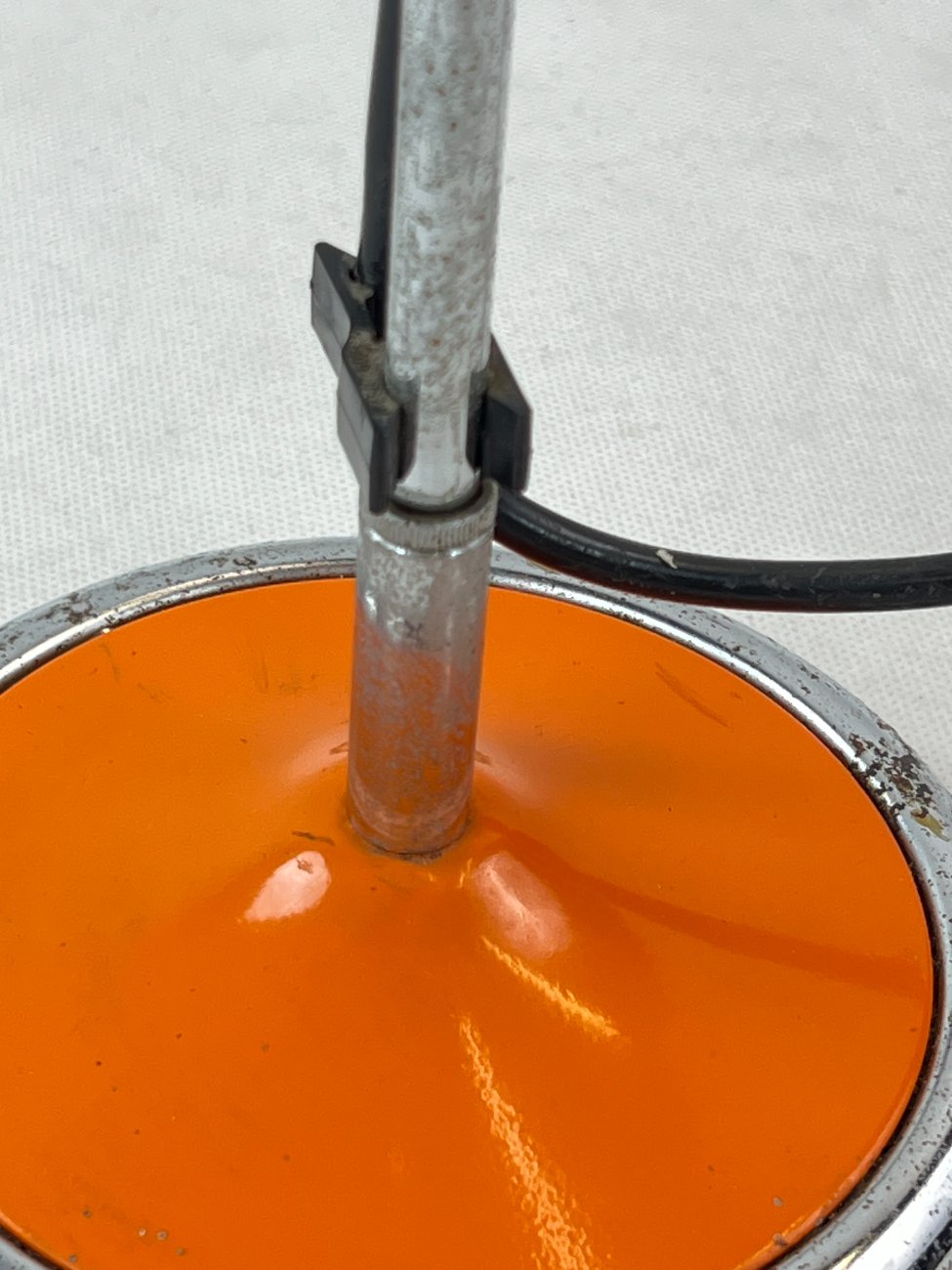 Vintažinis oranžinis reguliuojamo kampo stalinis šviestuvas.