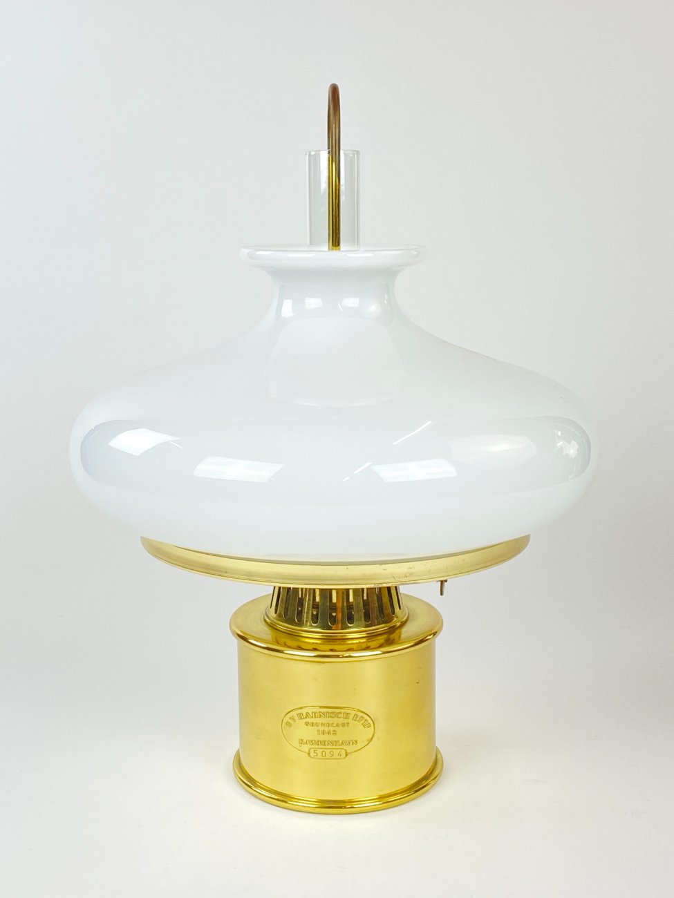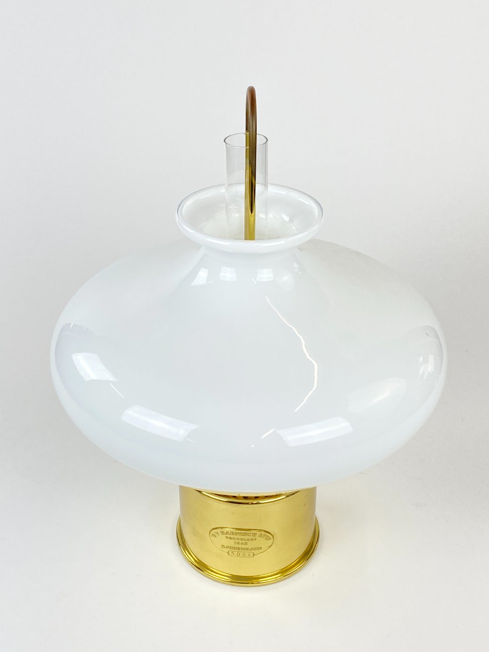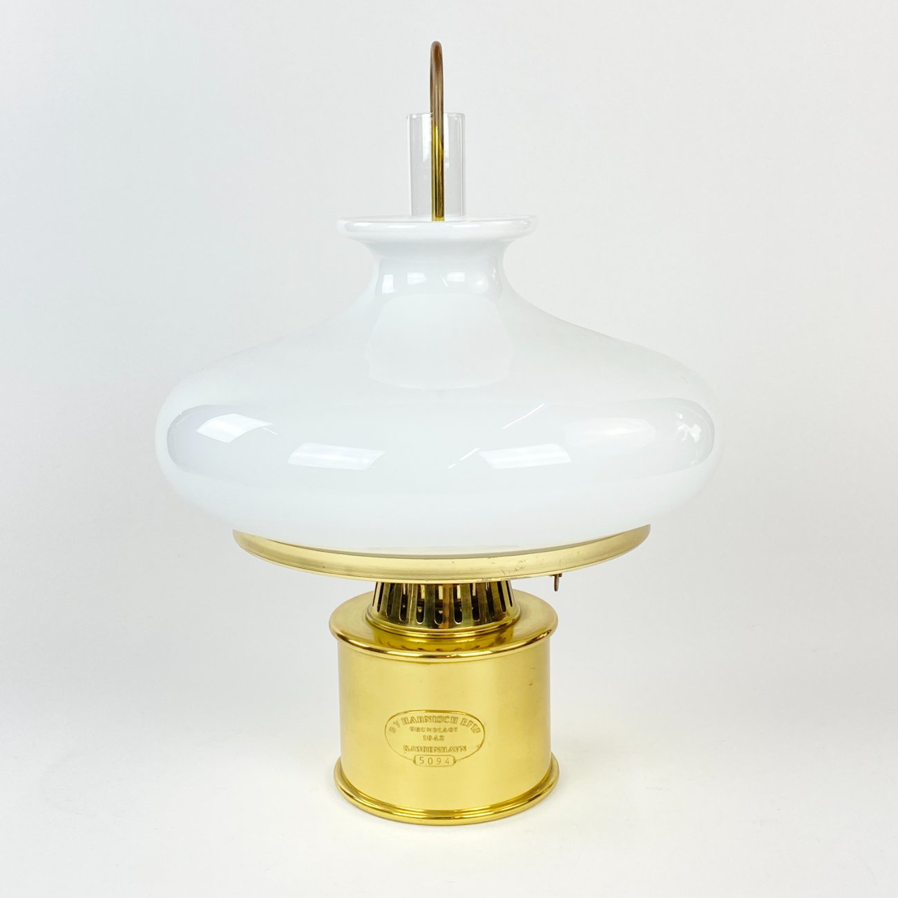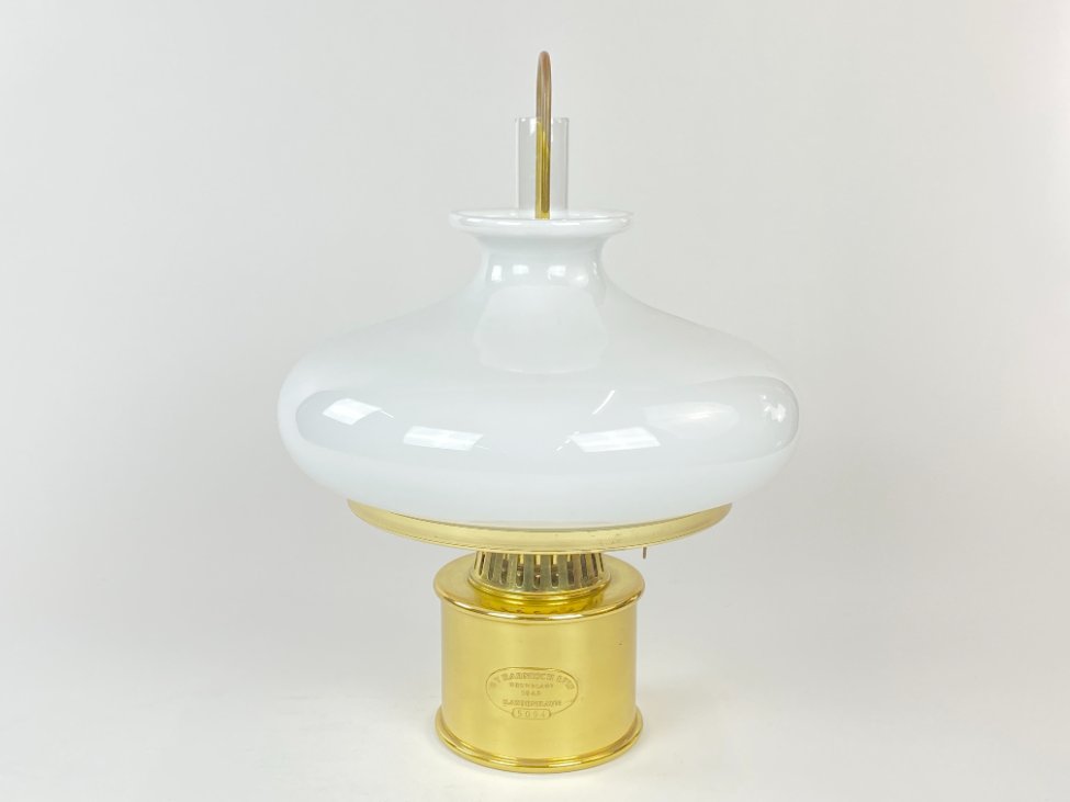 Daniška G.V. Harnisch Eftf. žalvarinė žibalinė lempa stikliniu gaubtu.