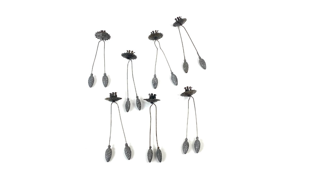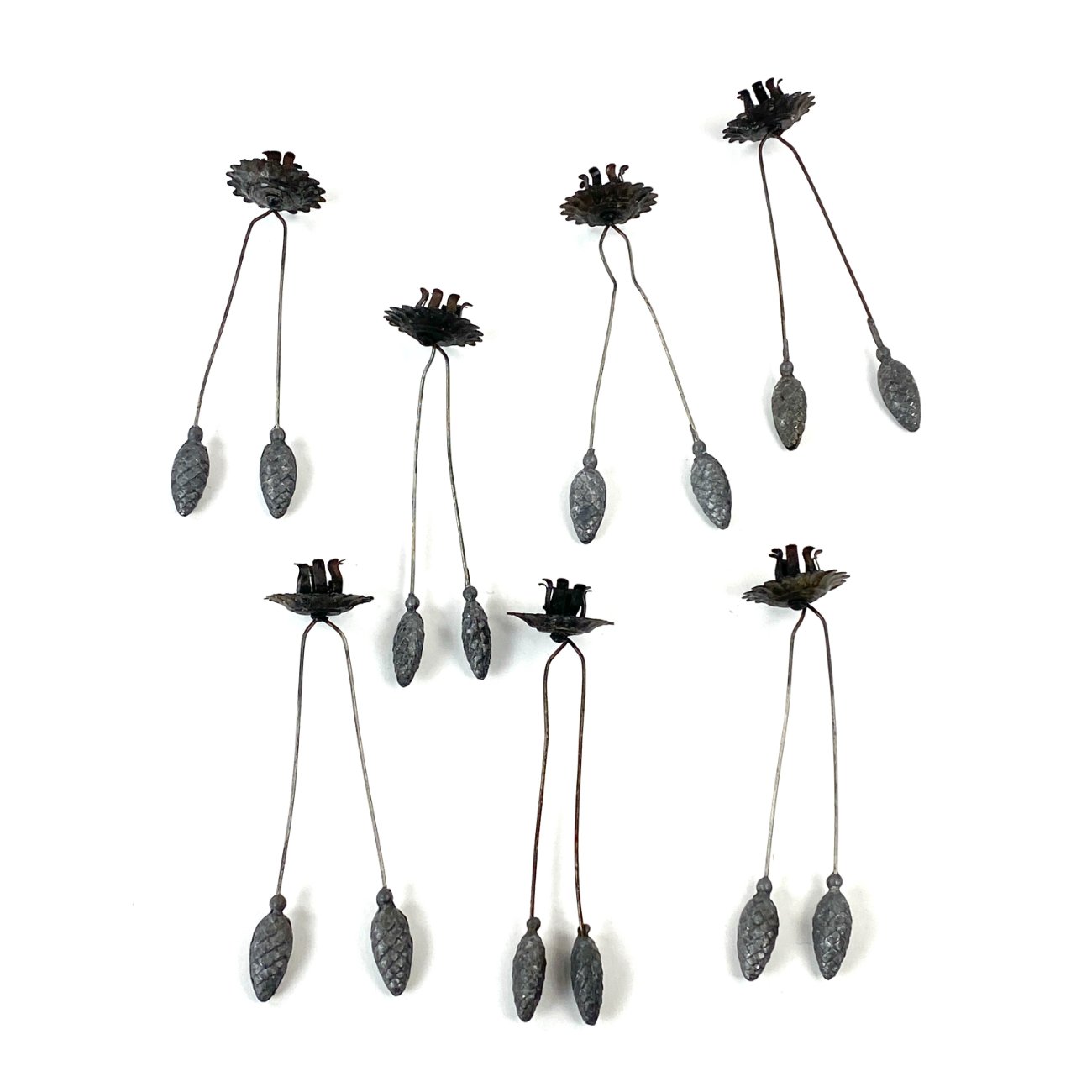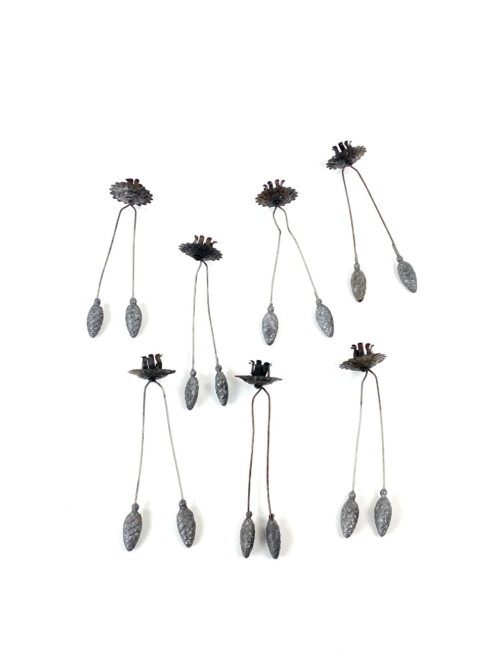 Pakabinamos žvakidės su alaviniais konkorėžio formos svareliais 7 vnt. komplektas.