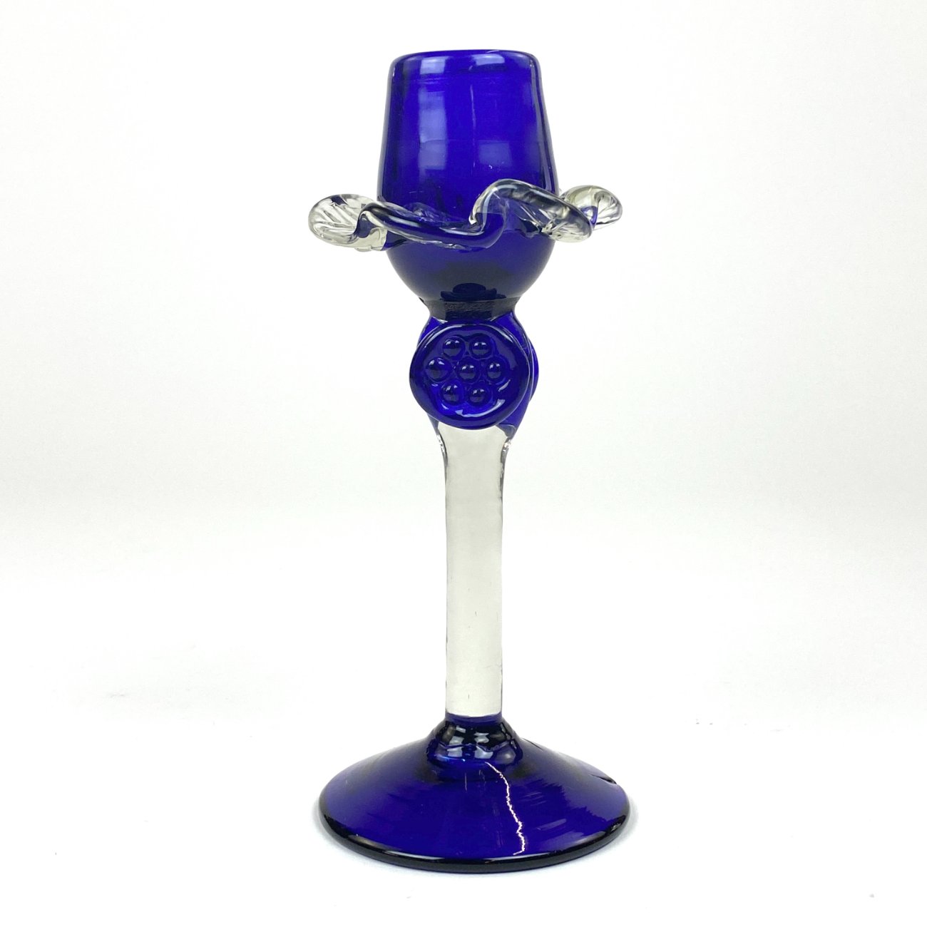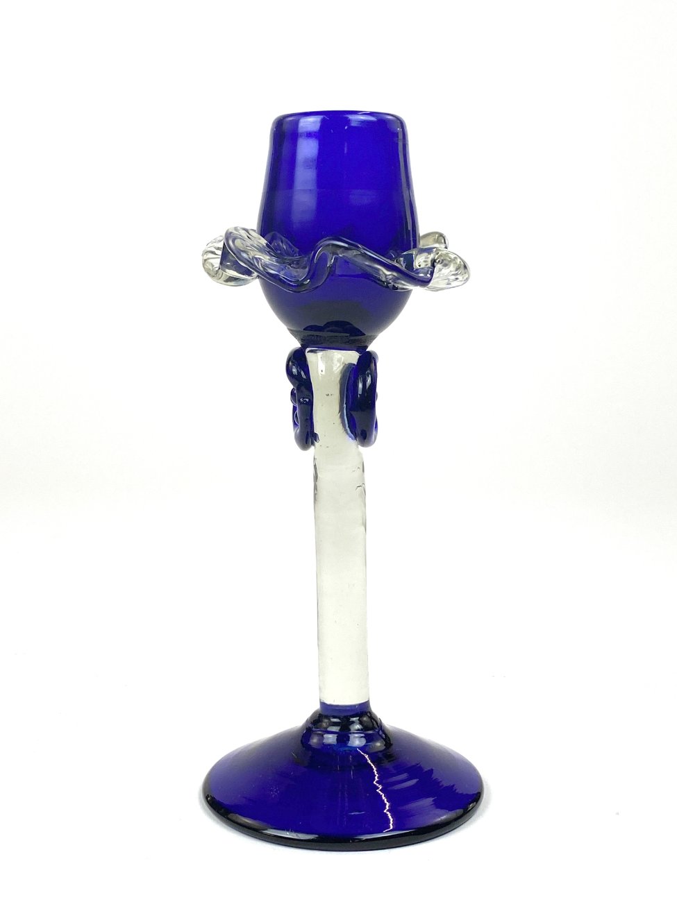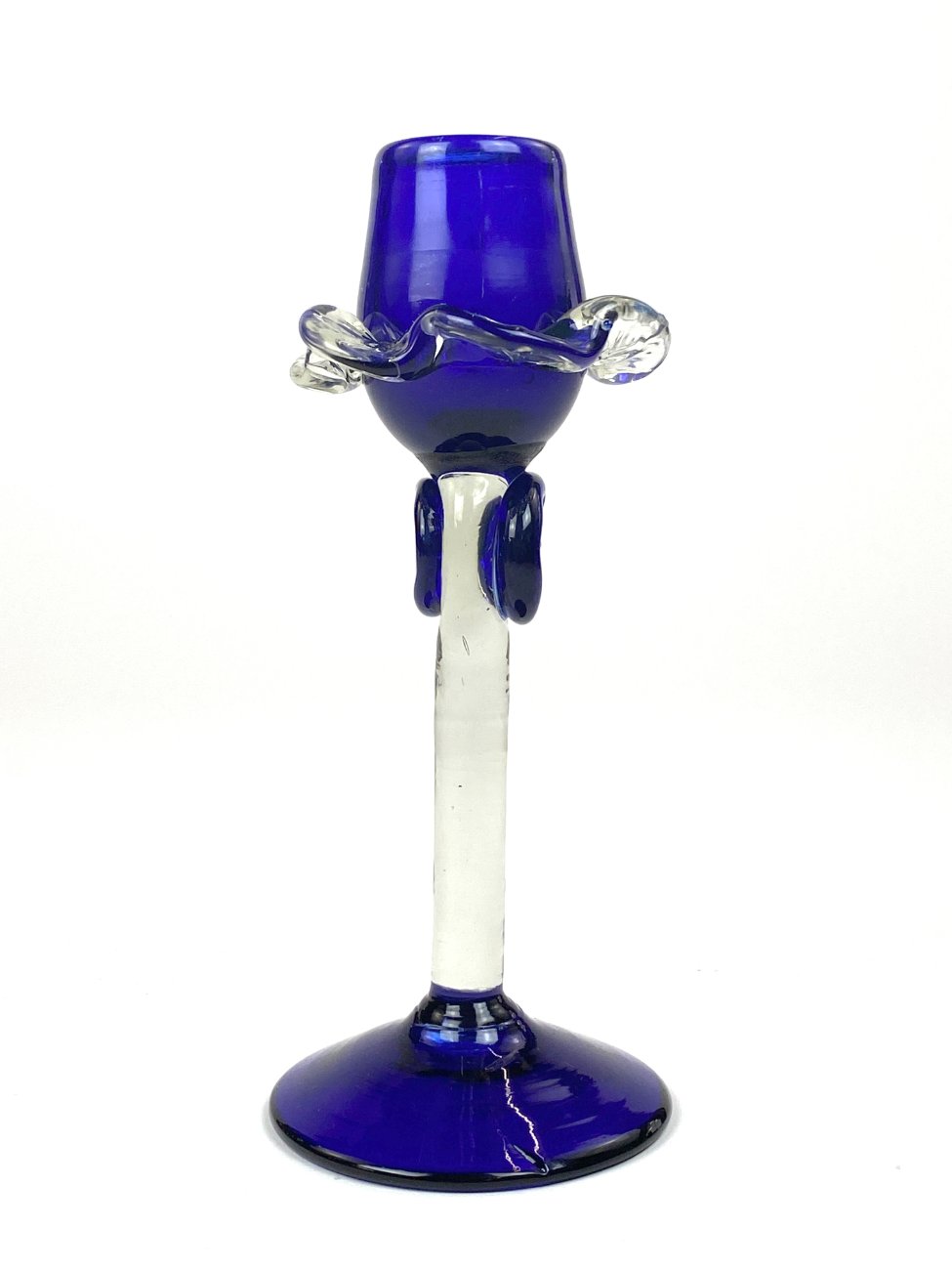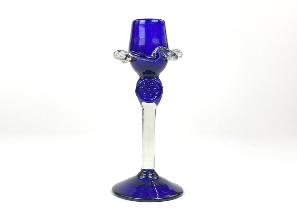 Skaidraus ir mėlynos spalvos stiklo žvakidė.