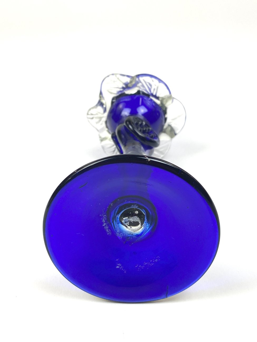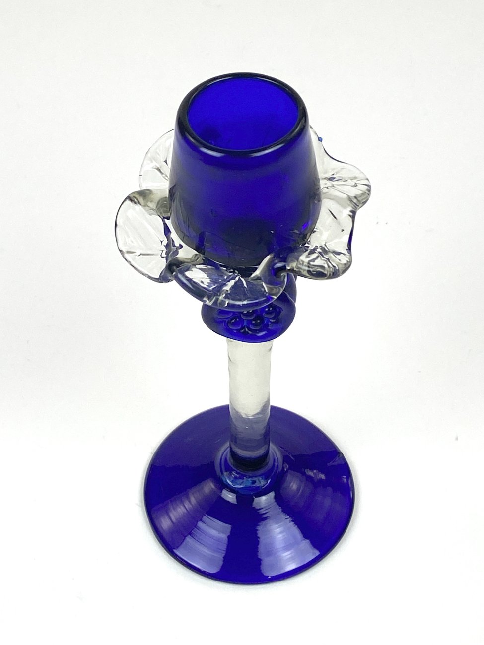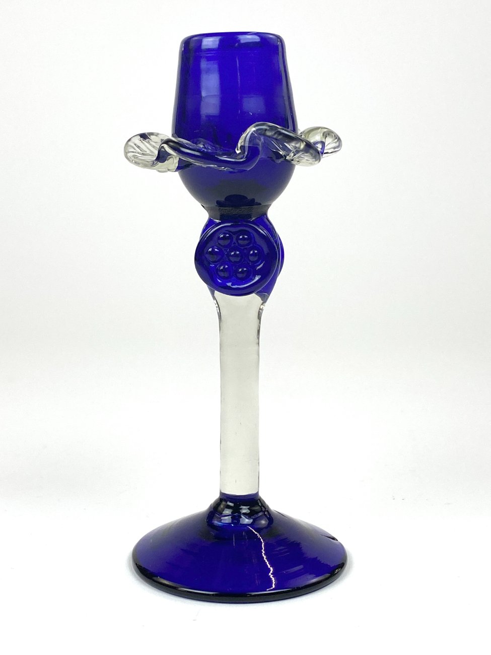 Skaidraus ir mėlynos spalvos stiklo žvakidė.