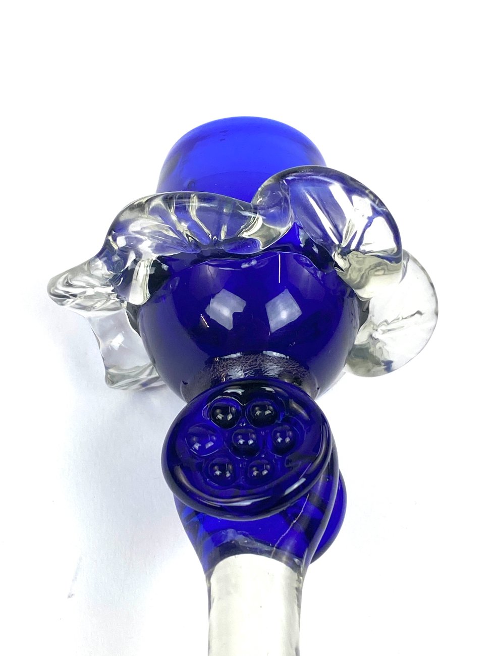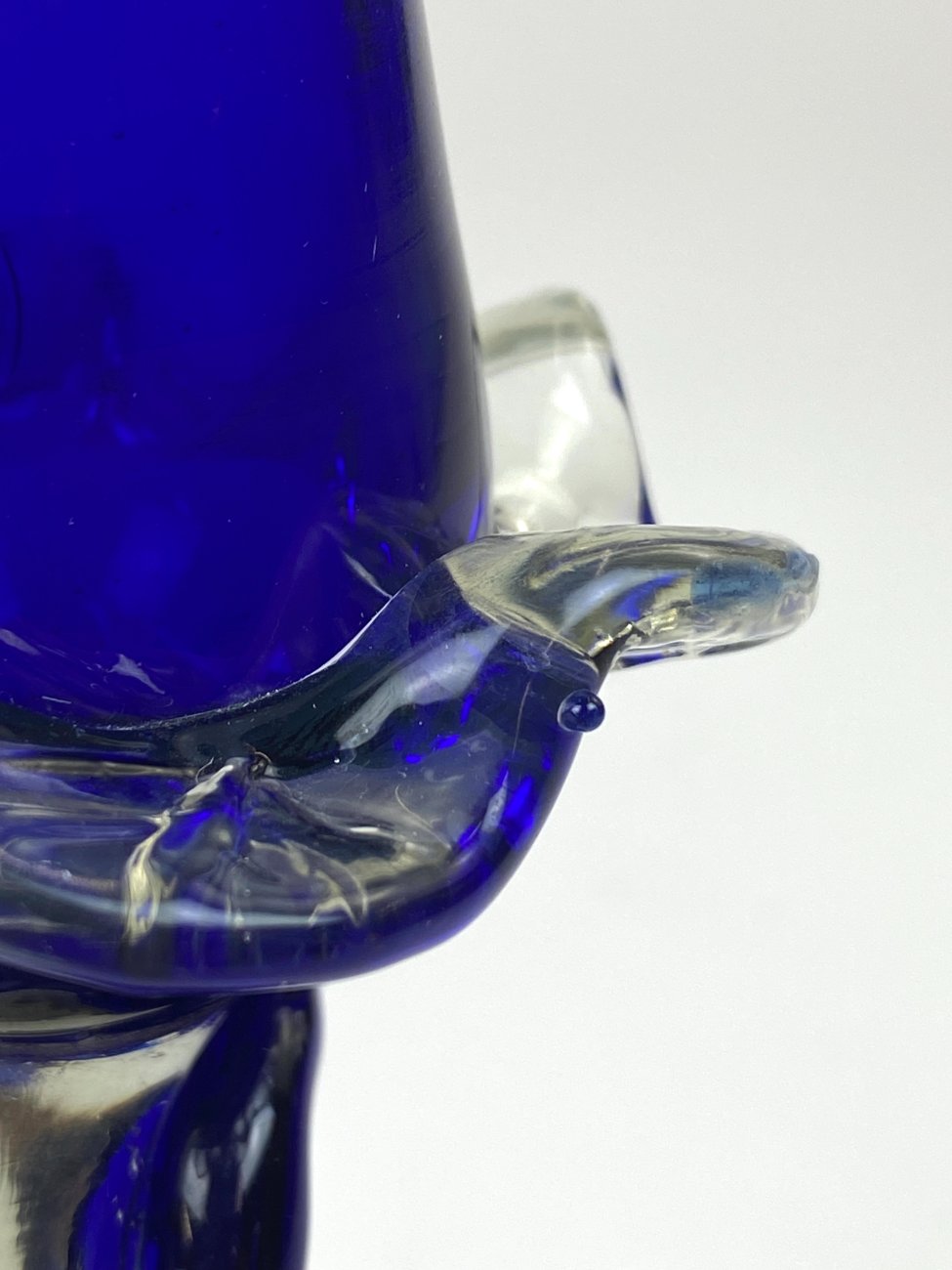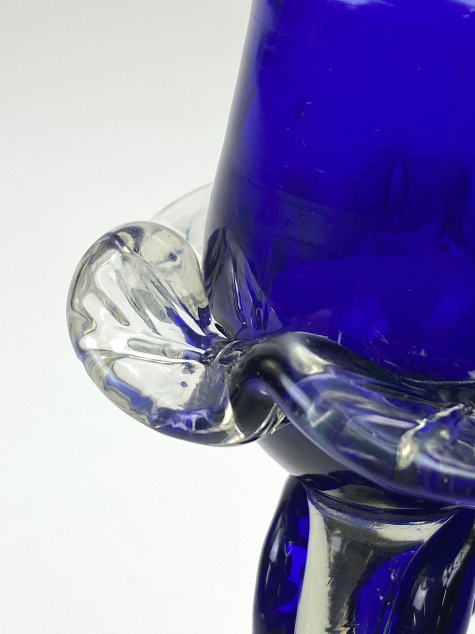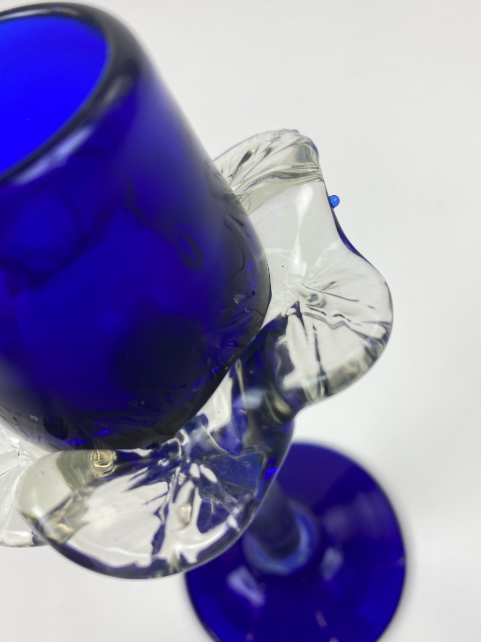 Skaidraus ir mėlynos spalvos stiklo žvakidė.