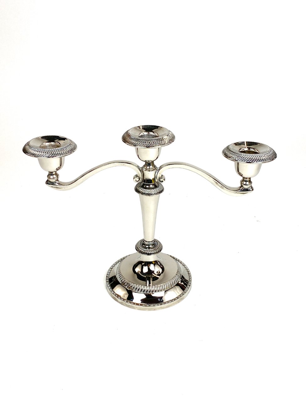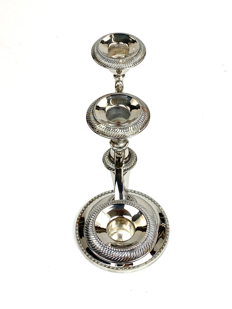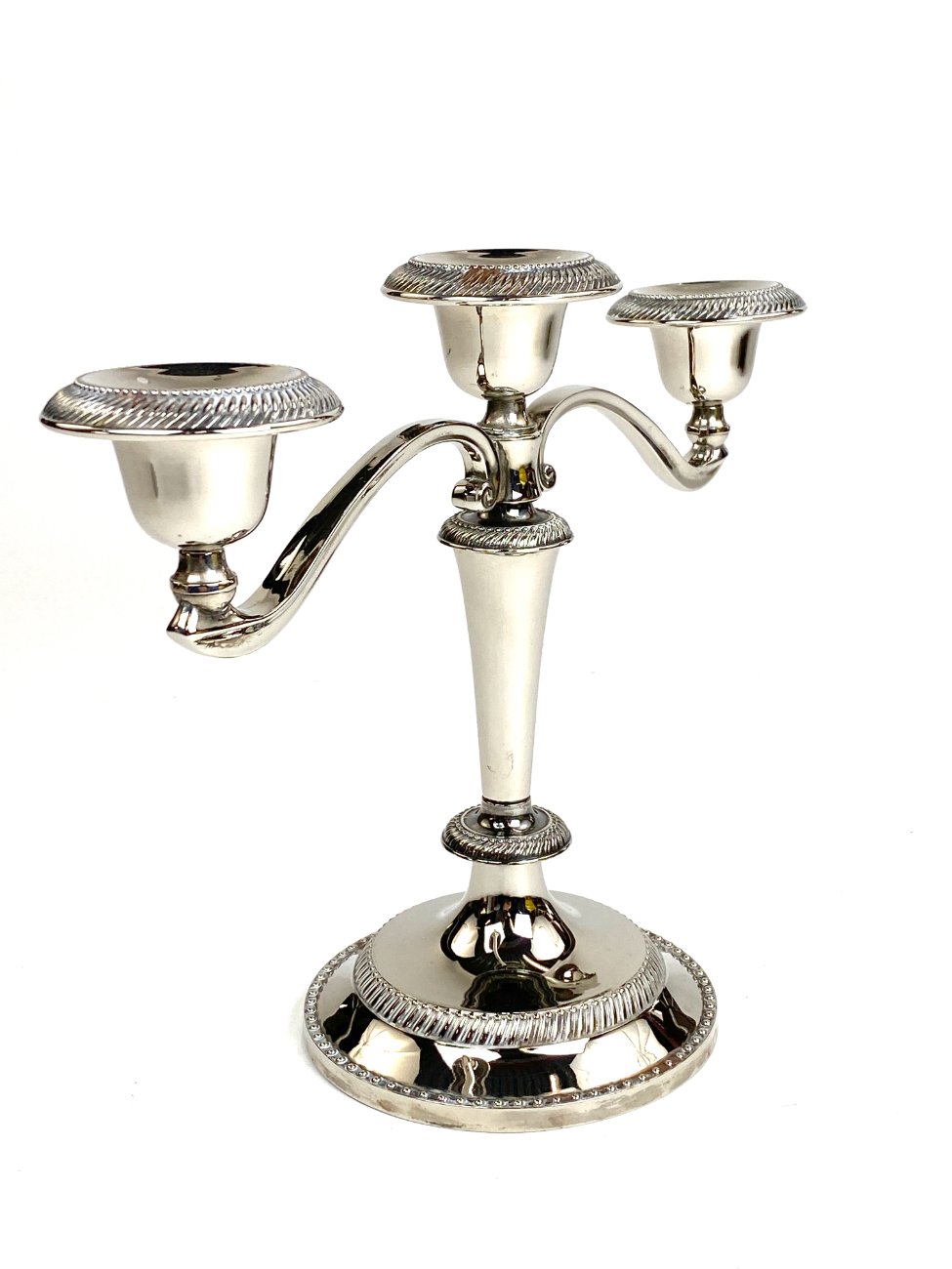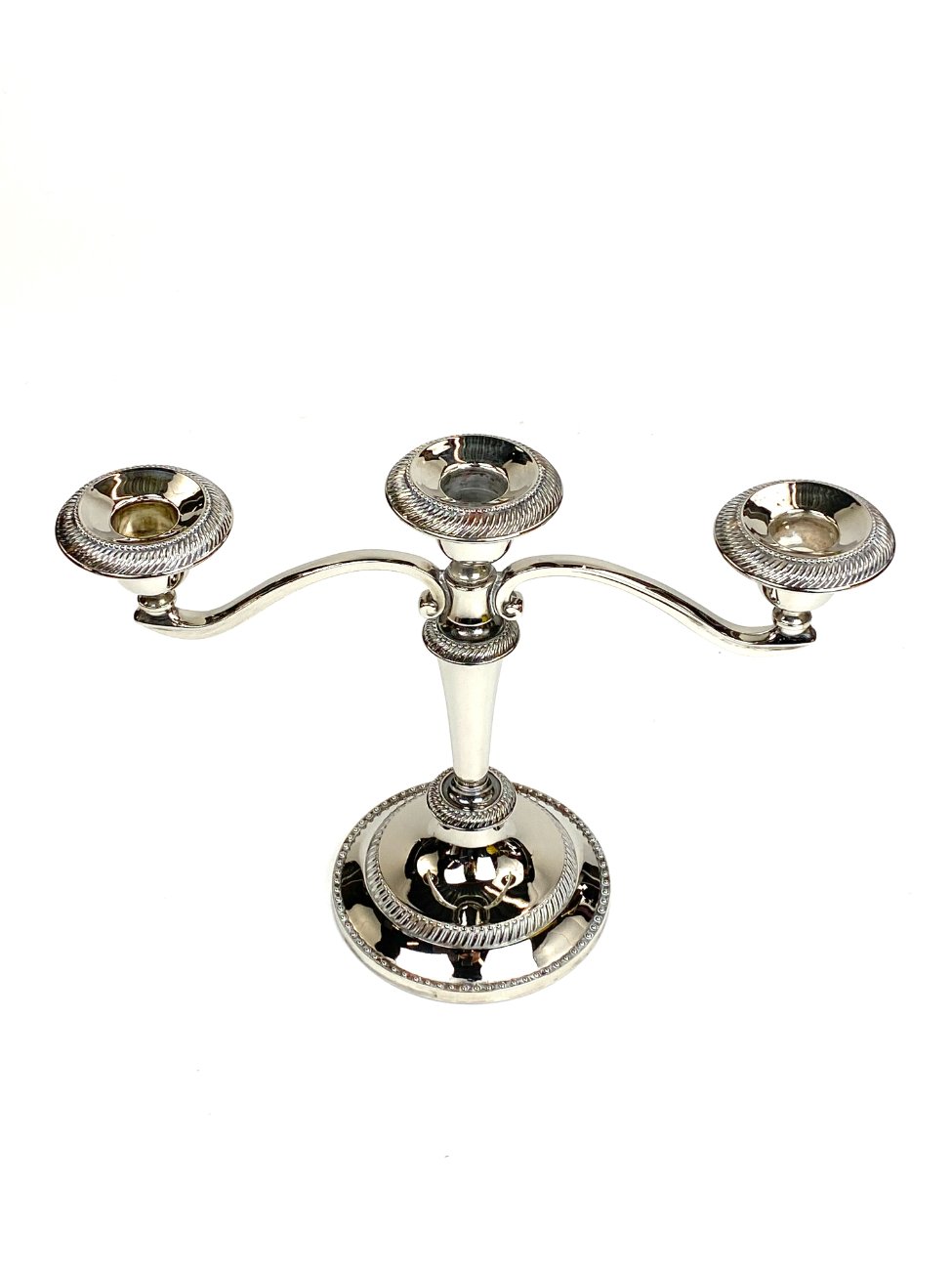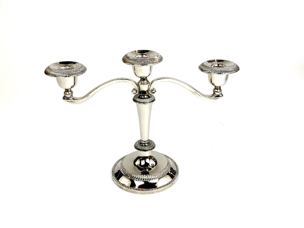 Trijų šakų žvakidė iš sidabruoto metalo.