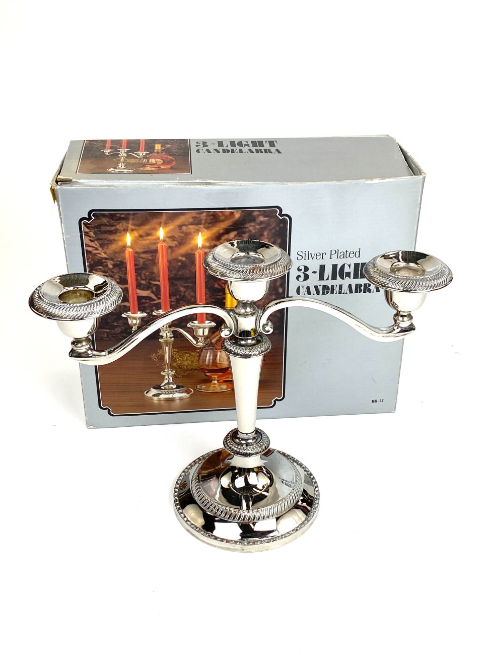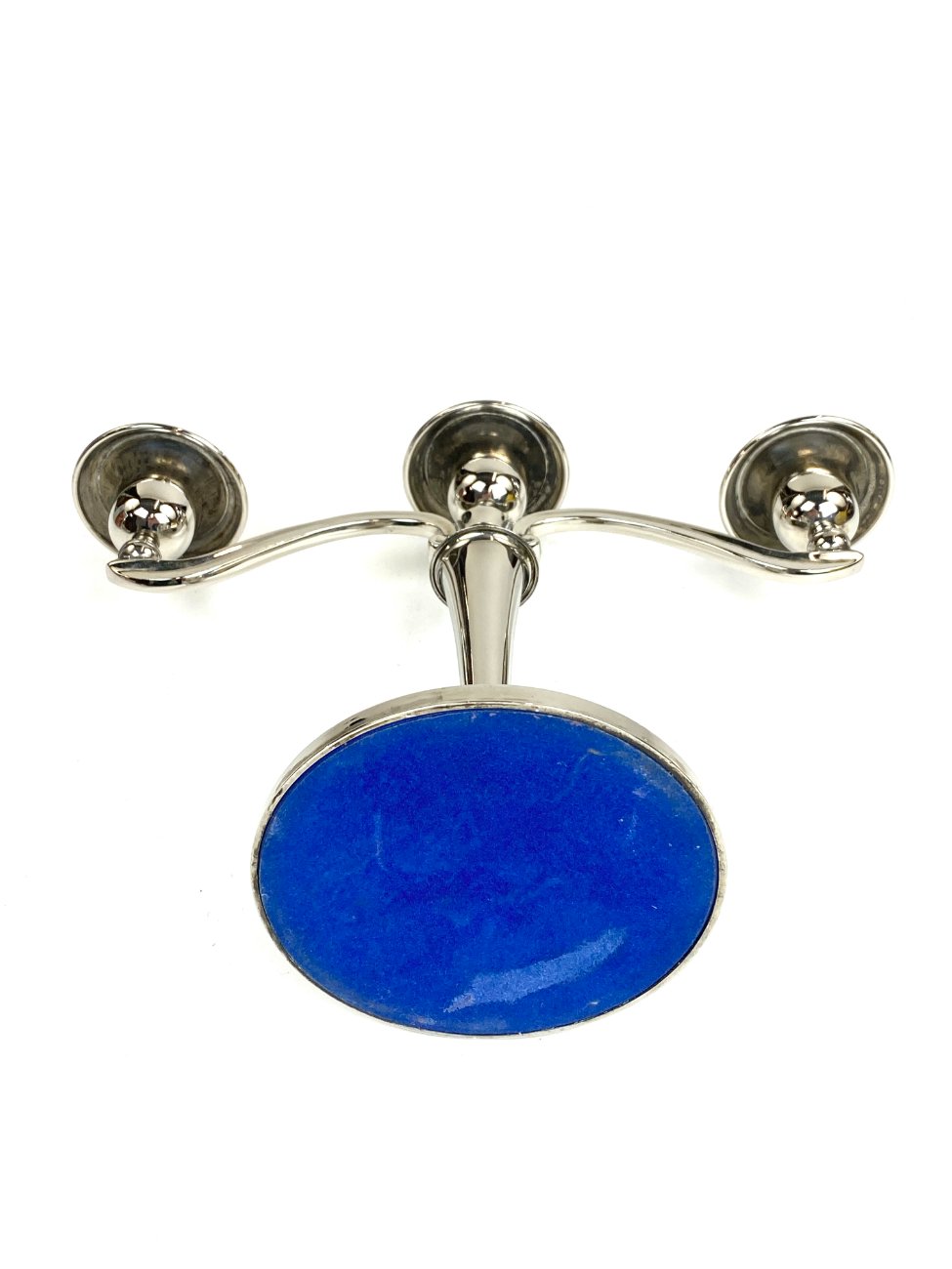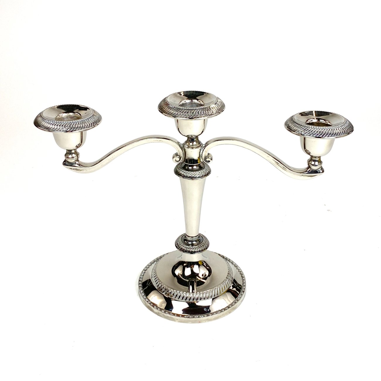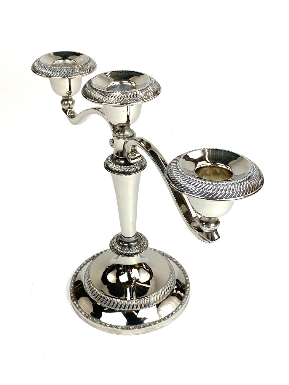 Trijų šakų žvakidė iš sidabruoto metalo.