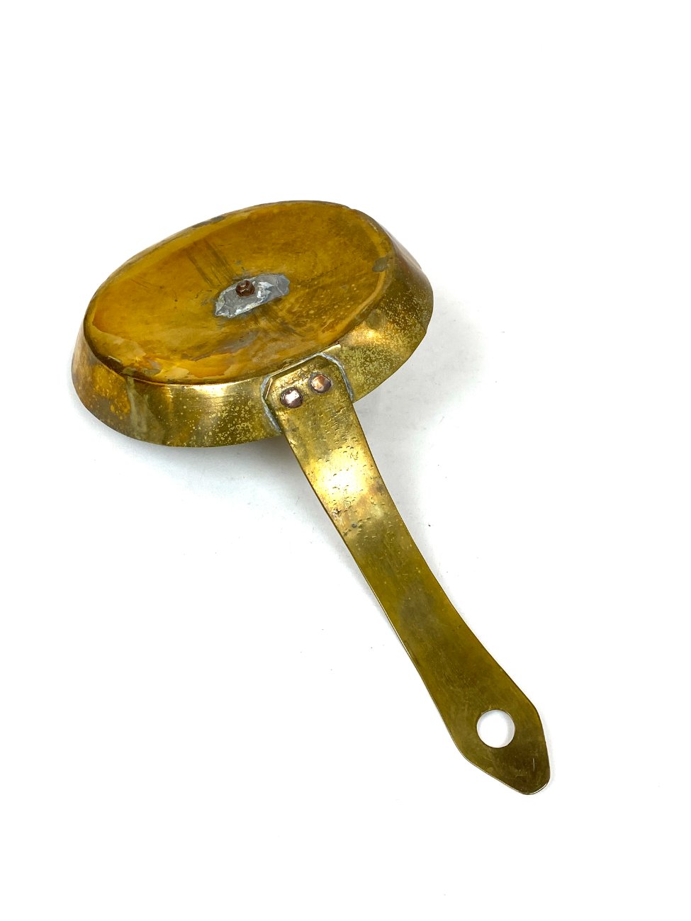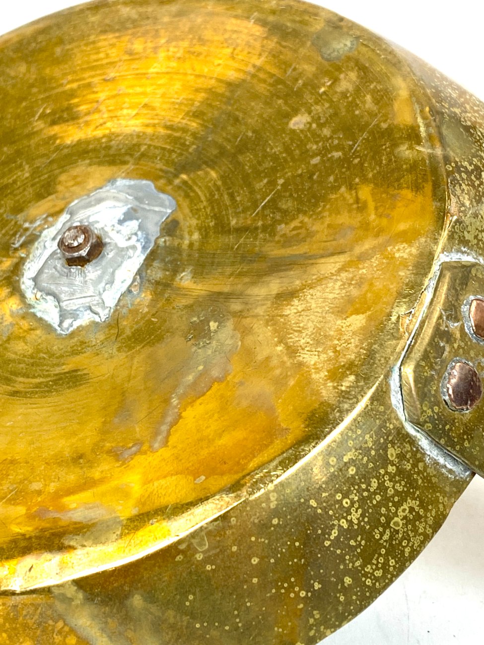| Papildoma informacija | Matoma žalvario oksidacija, lėkštės deformacija. Ties rankena lūžęs lėkštės pagrindas. |