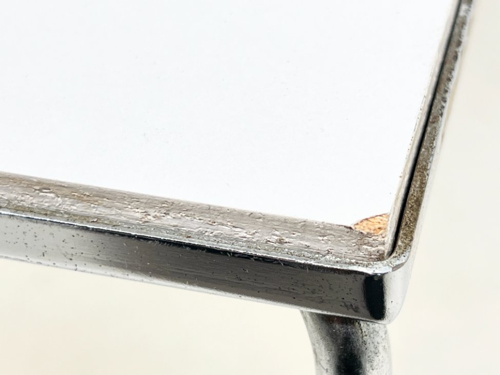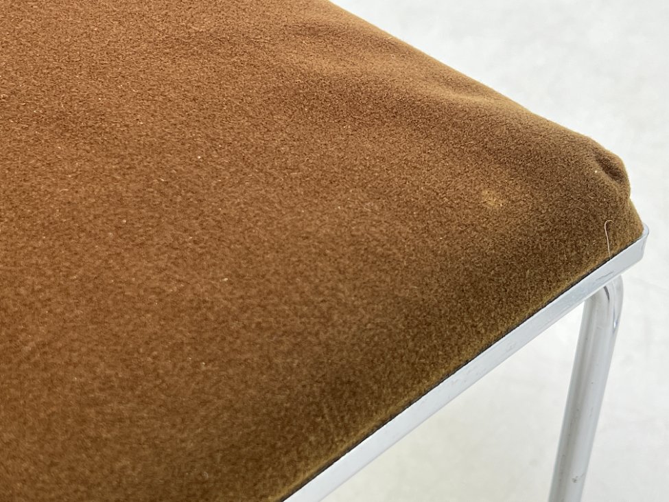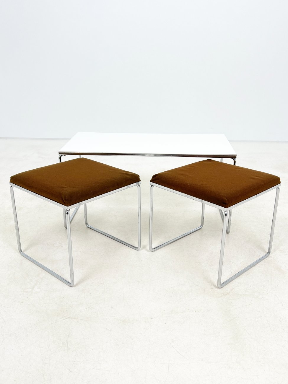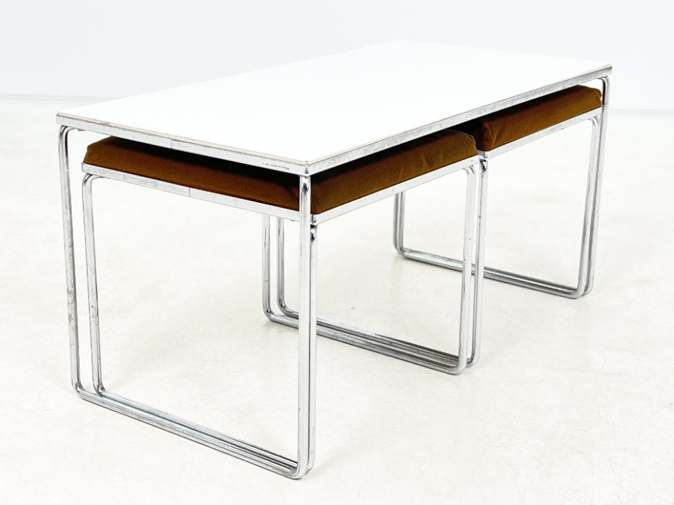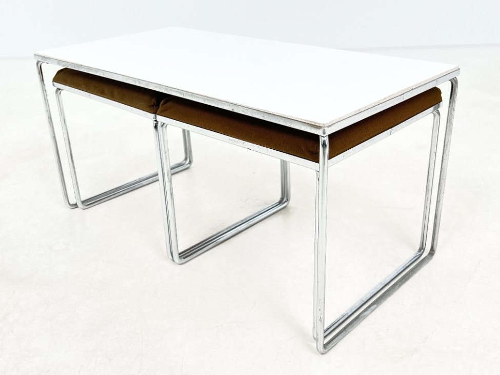 | Papildoma informacija | Ant staliuko ir abiejų pufų metalinių rėmų ir kojų yra pabraižymų, oksidacijos dėmių. Apdaužyti staliuko stalviršio kampai, stalviršis pabraižytas. Abiejų pufų gobelenai turi dėmių. |