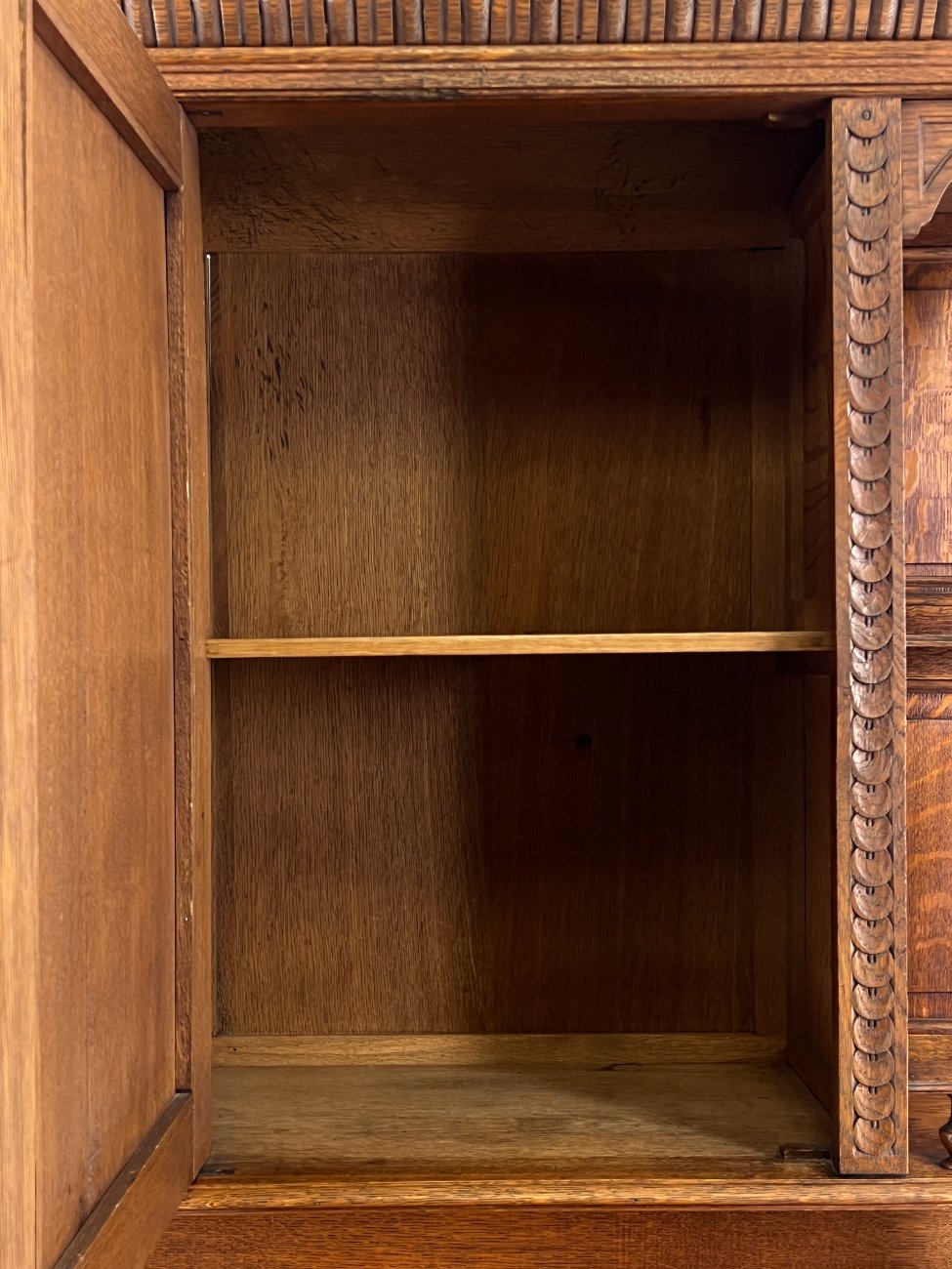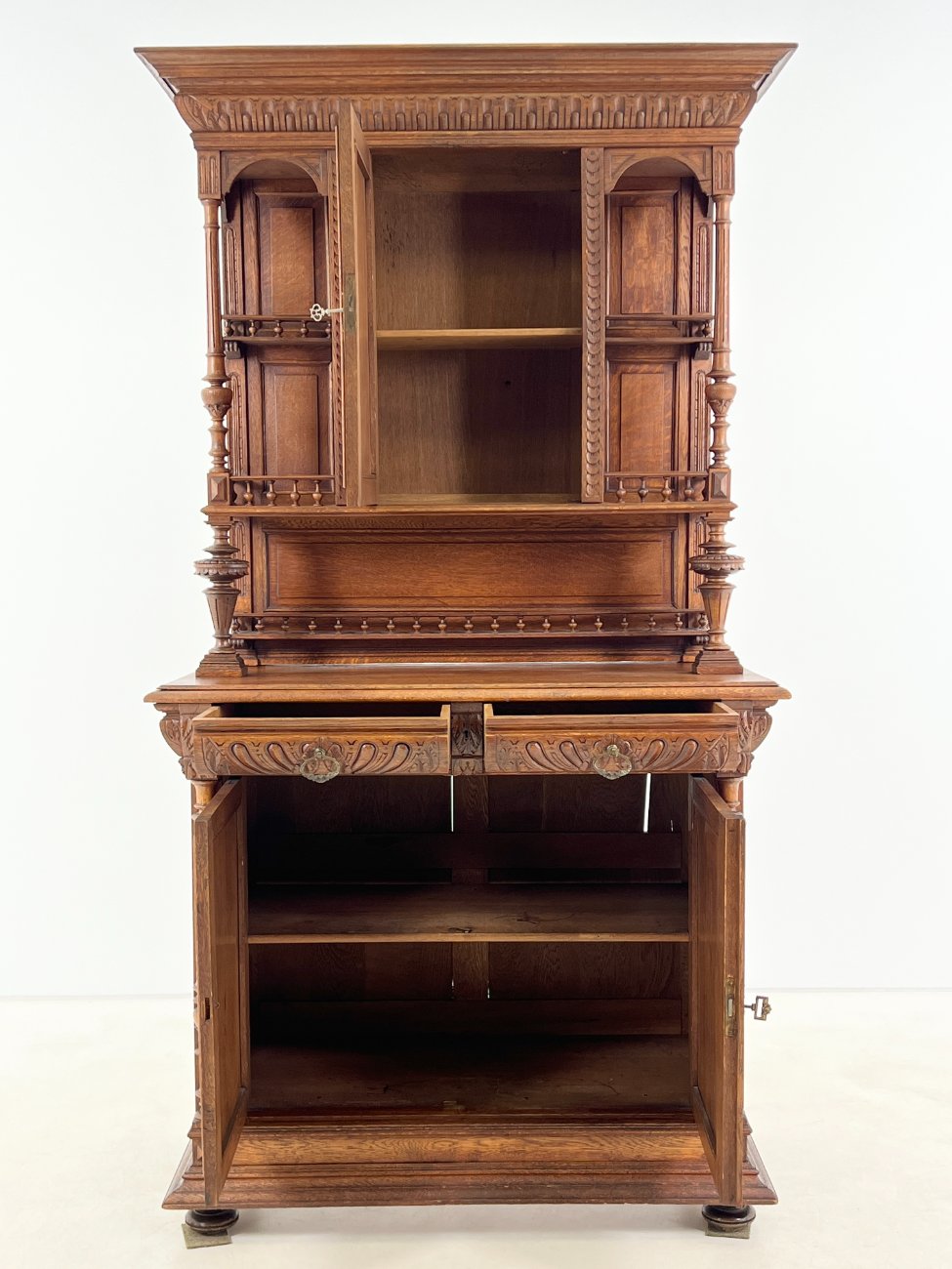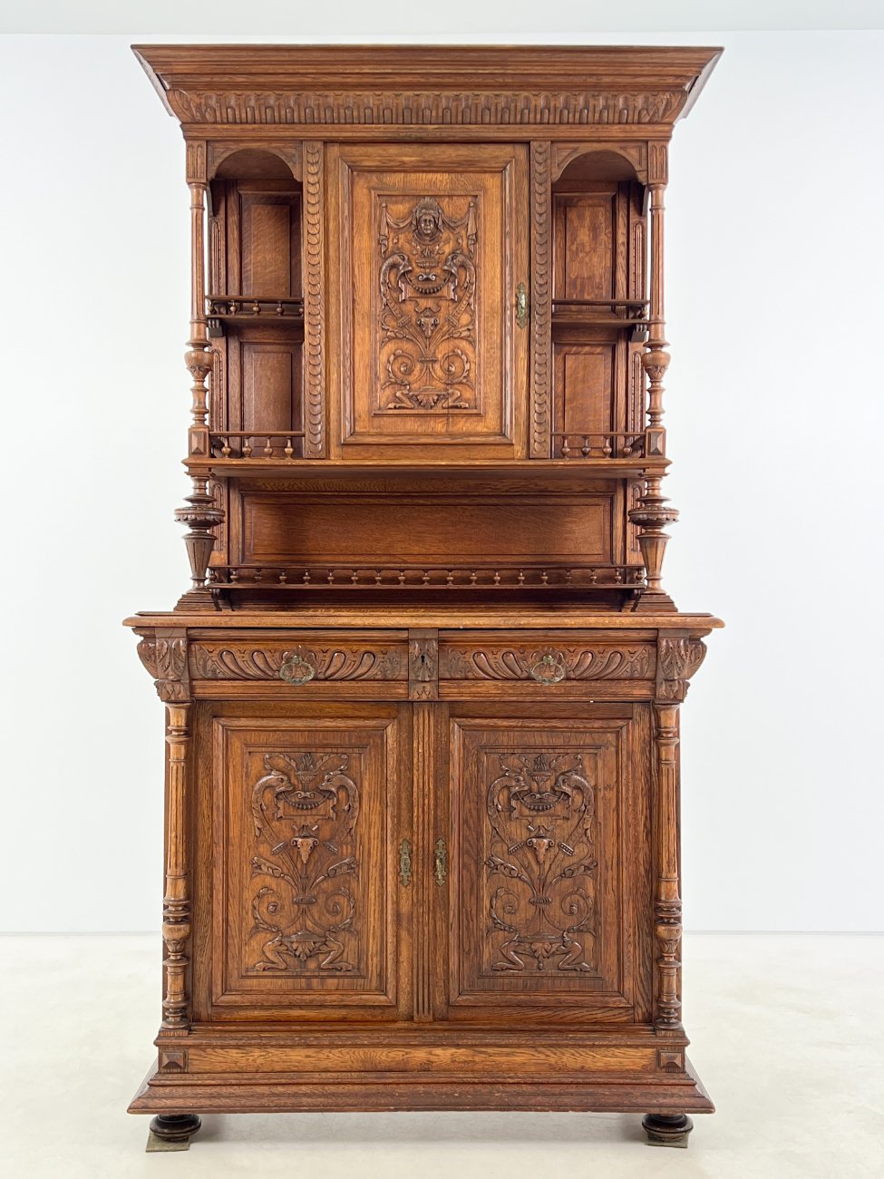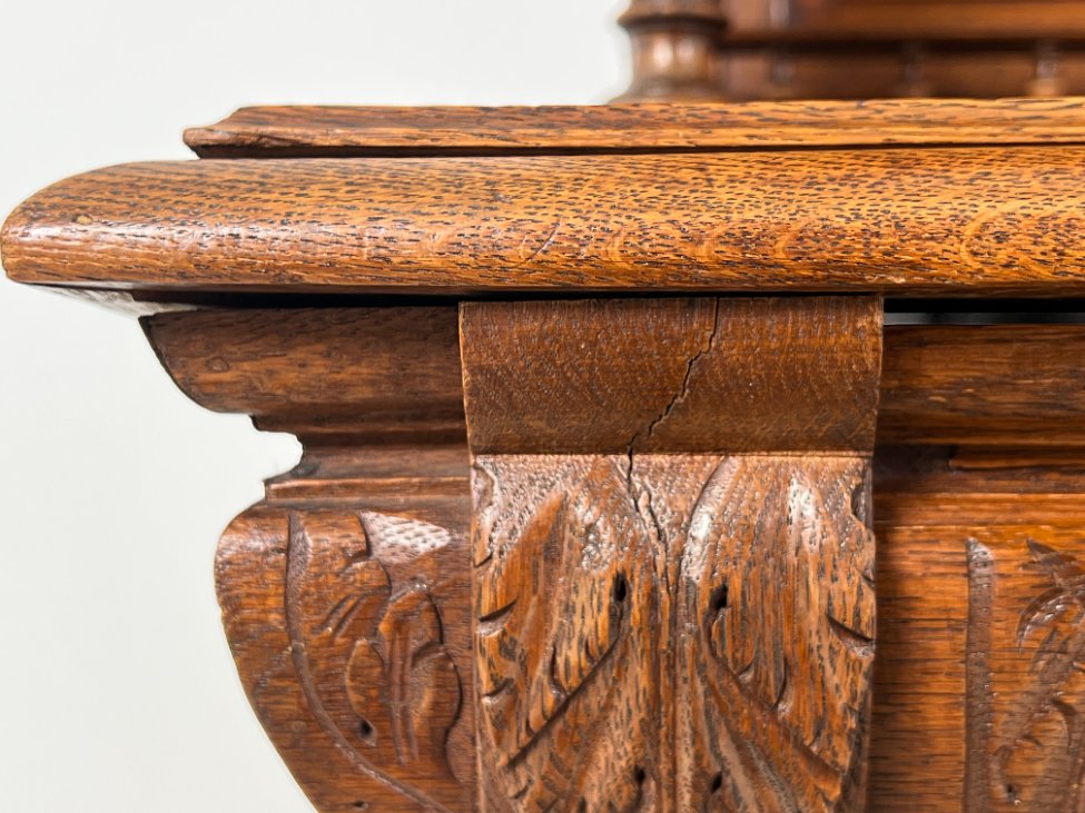 Ąžuolinis drožinėtas dviejų dalių bufetas.