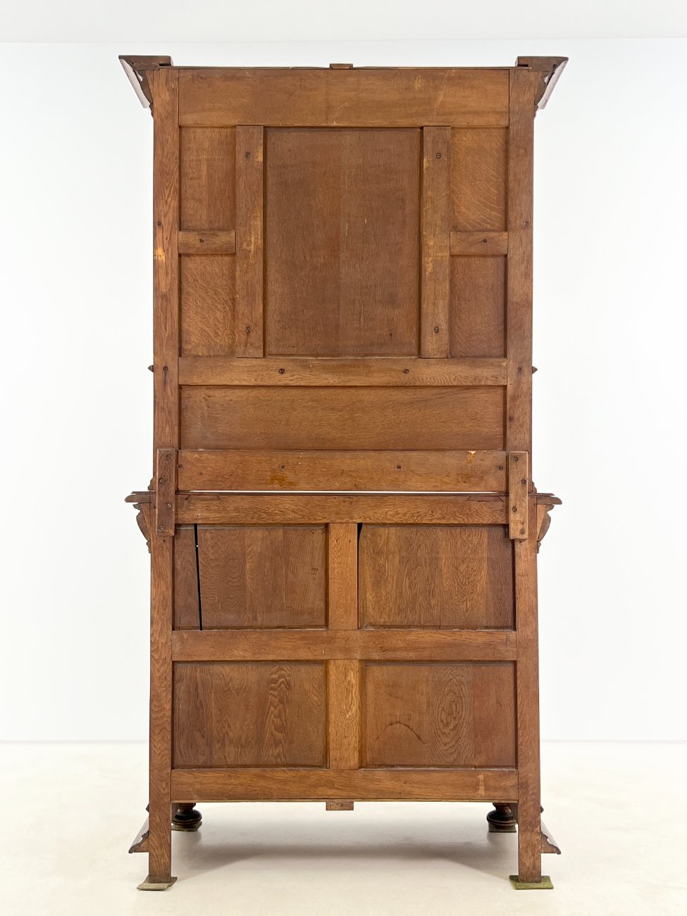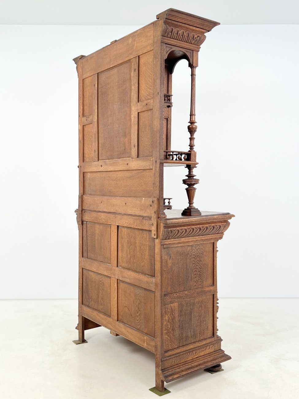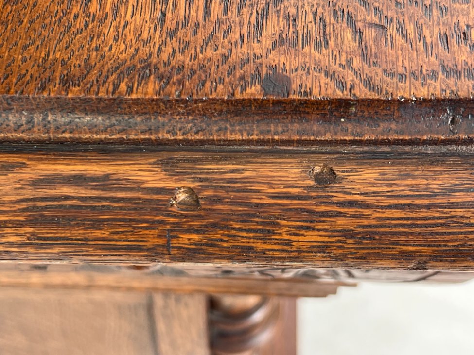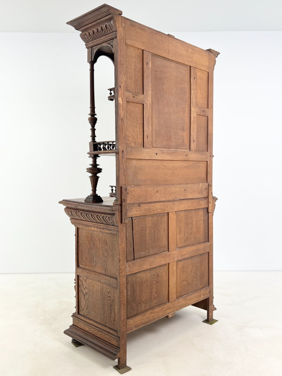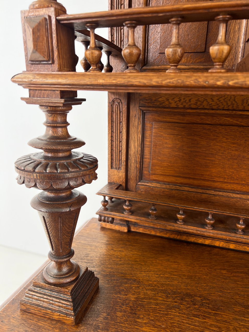 Ąžuolinis drožinėtas dviejų dalių bufetas.