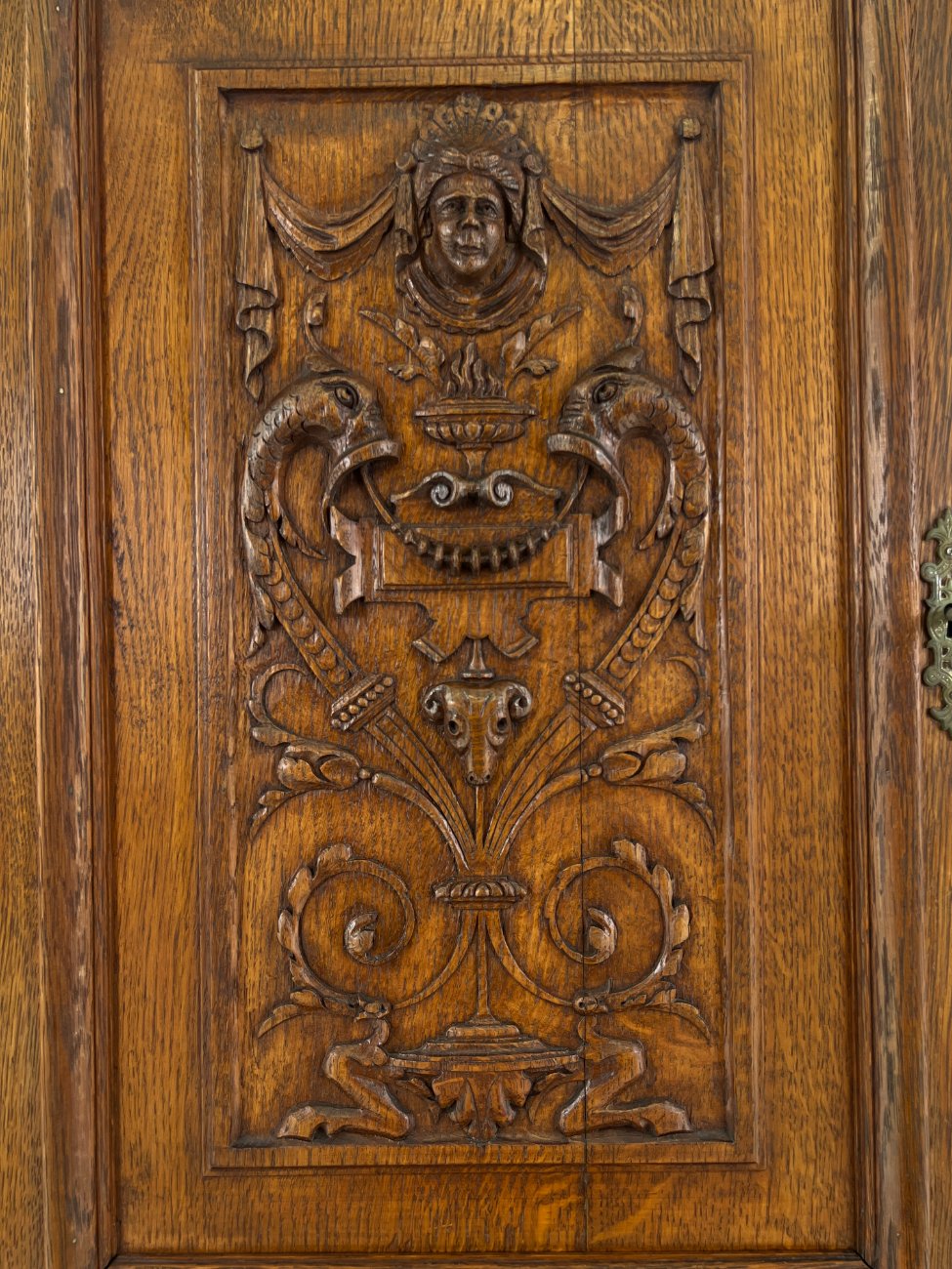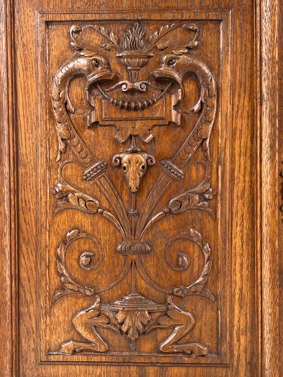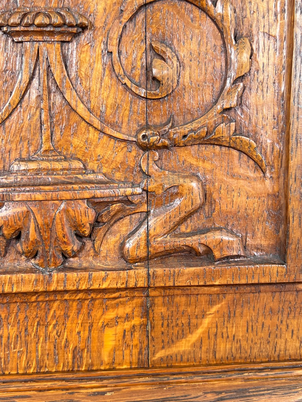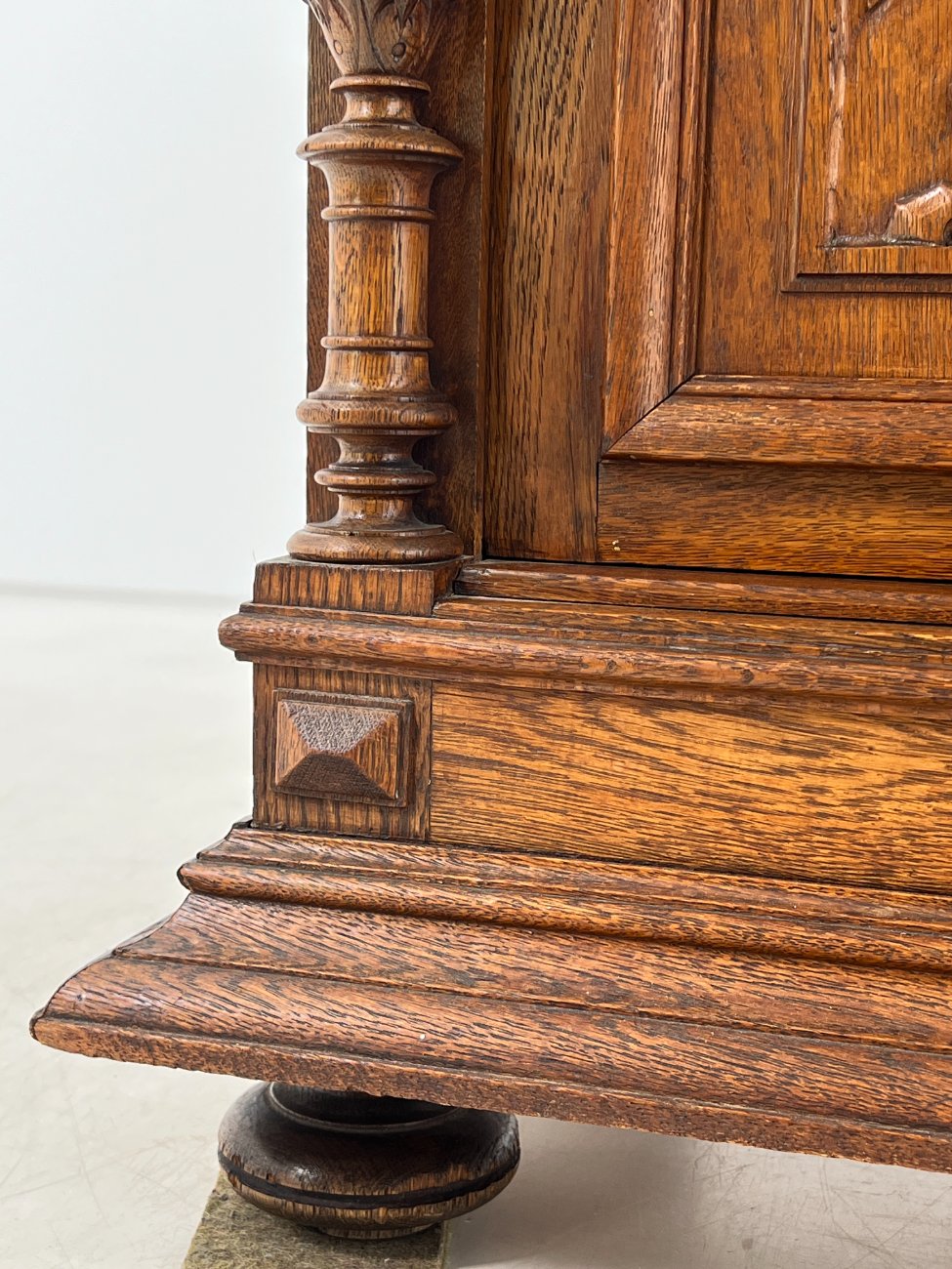 Ąžuolinis drožinėtas dviejų dalių bufetas.