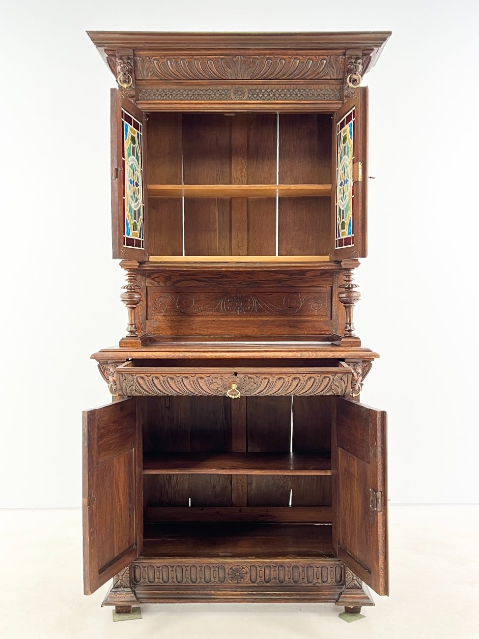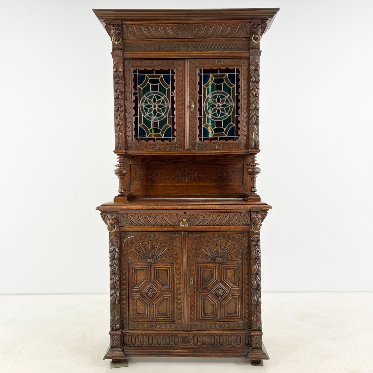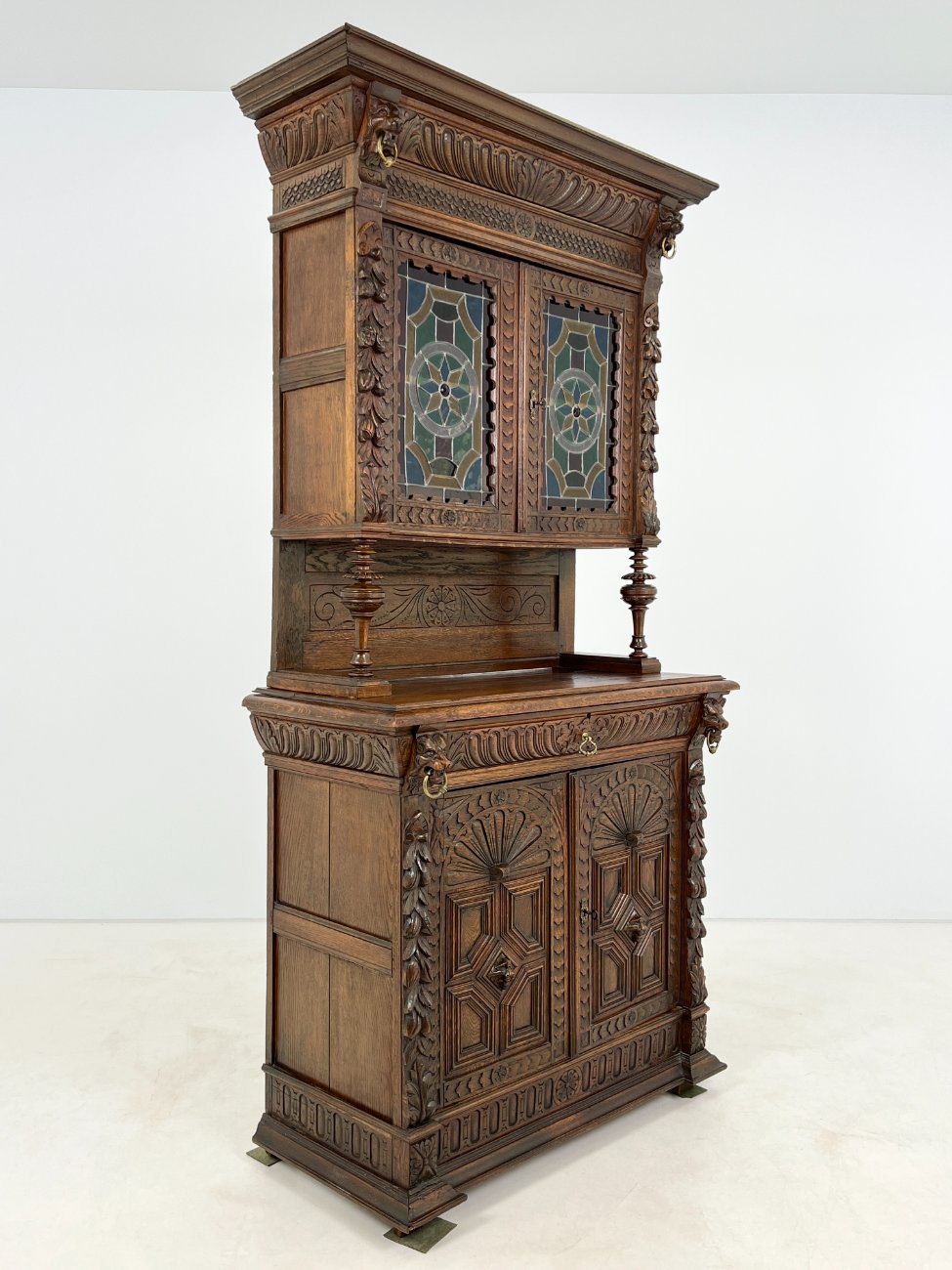 Senovinis drožinėtas ąžuolinis dviejų dalių bufetas su vitražinėmis durelėmis.