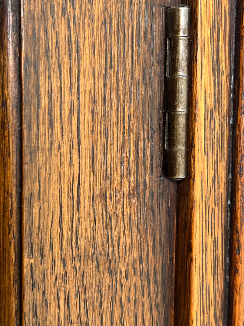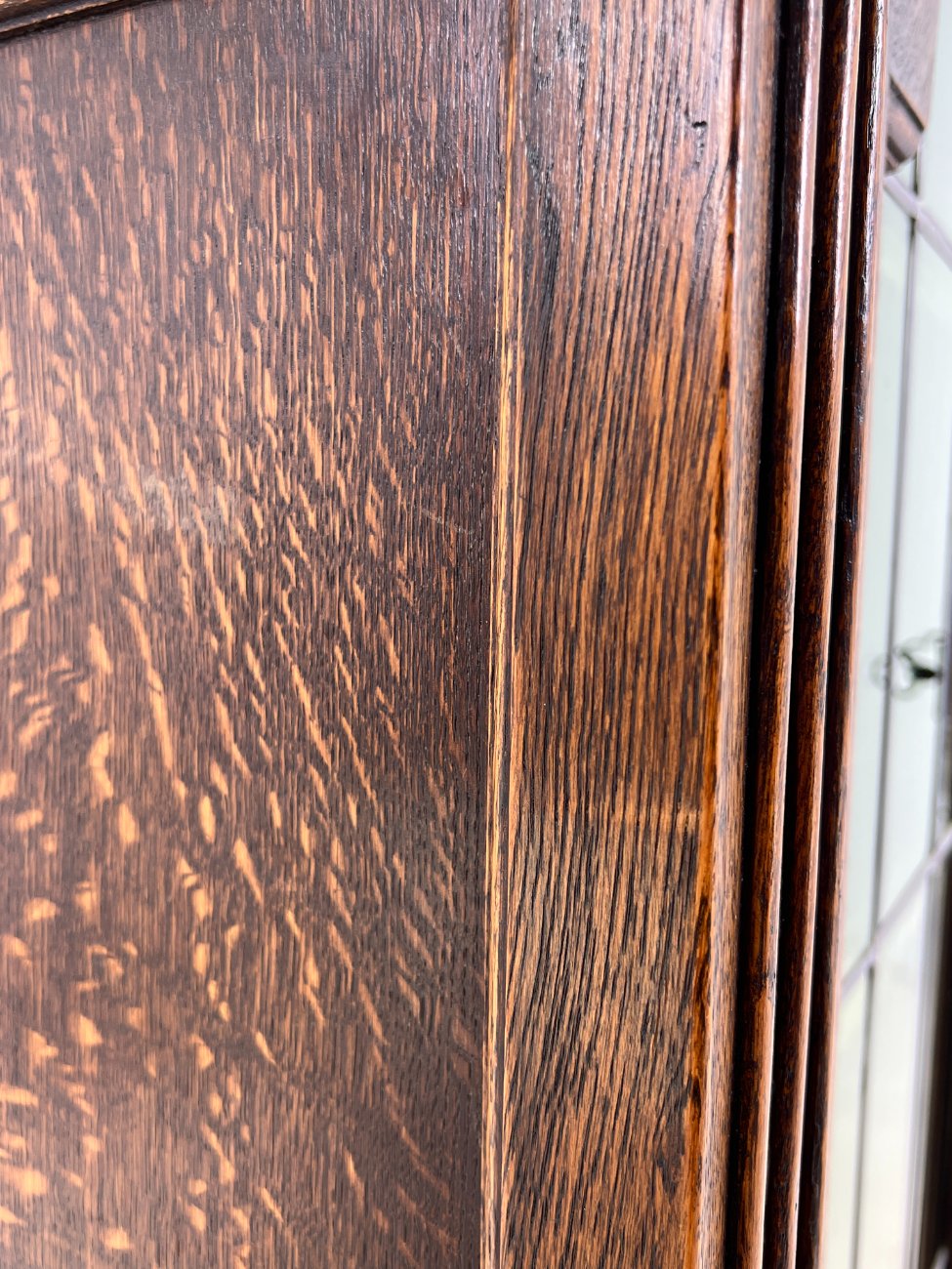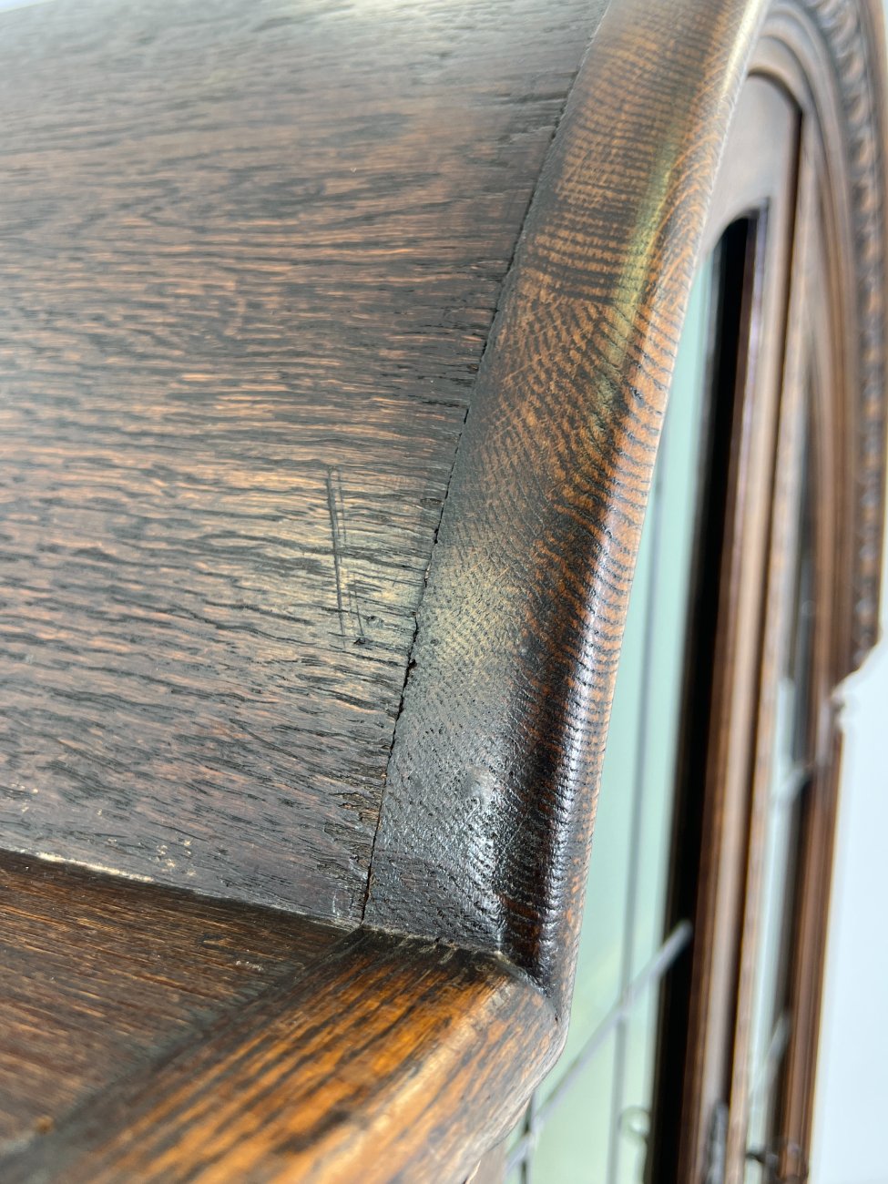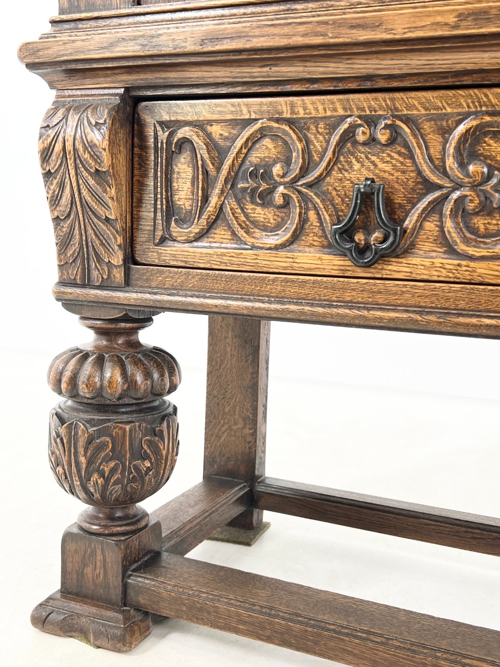 Ispaniško stiliaus ąžuolinis bufetas su žalio stiklo durimis.