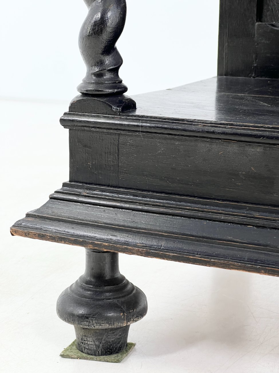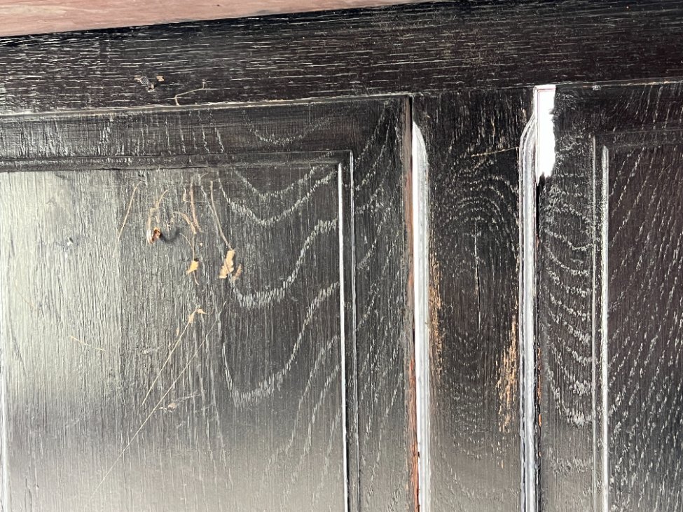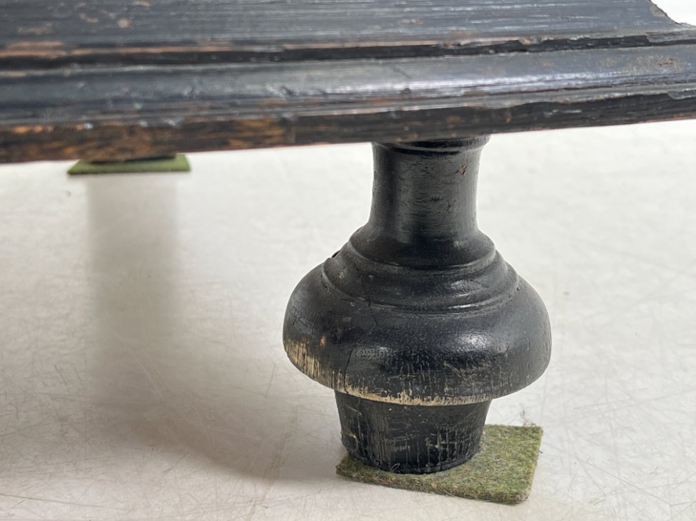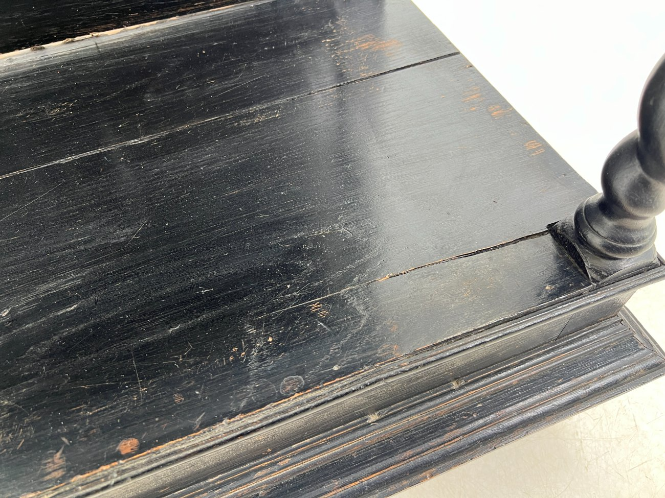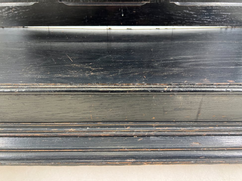 | Papildoma informacija | Maromos naudojimo žymės, per visą paviršių yra pabraižymų, dažų pažeidimų, įmušimų, medienos skilimų. Tarp apatinės lentynos ir nugaros lentų yra tarpas., Nugaroje tarp viršutinės dalies ir apatinės lentynos yra skylė. |