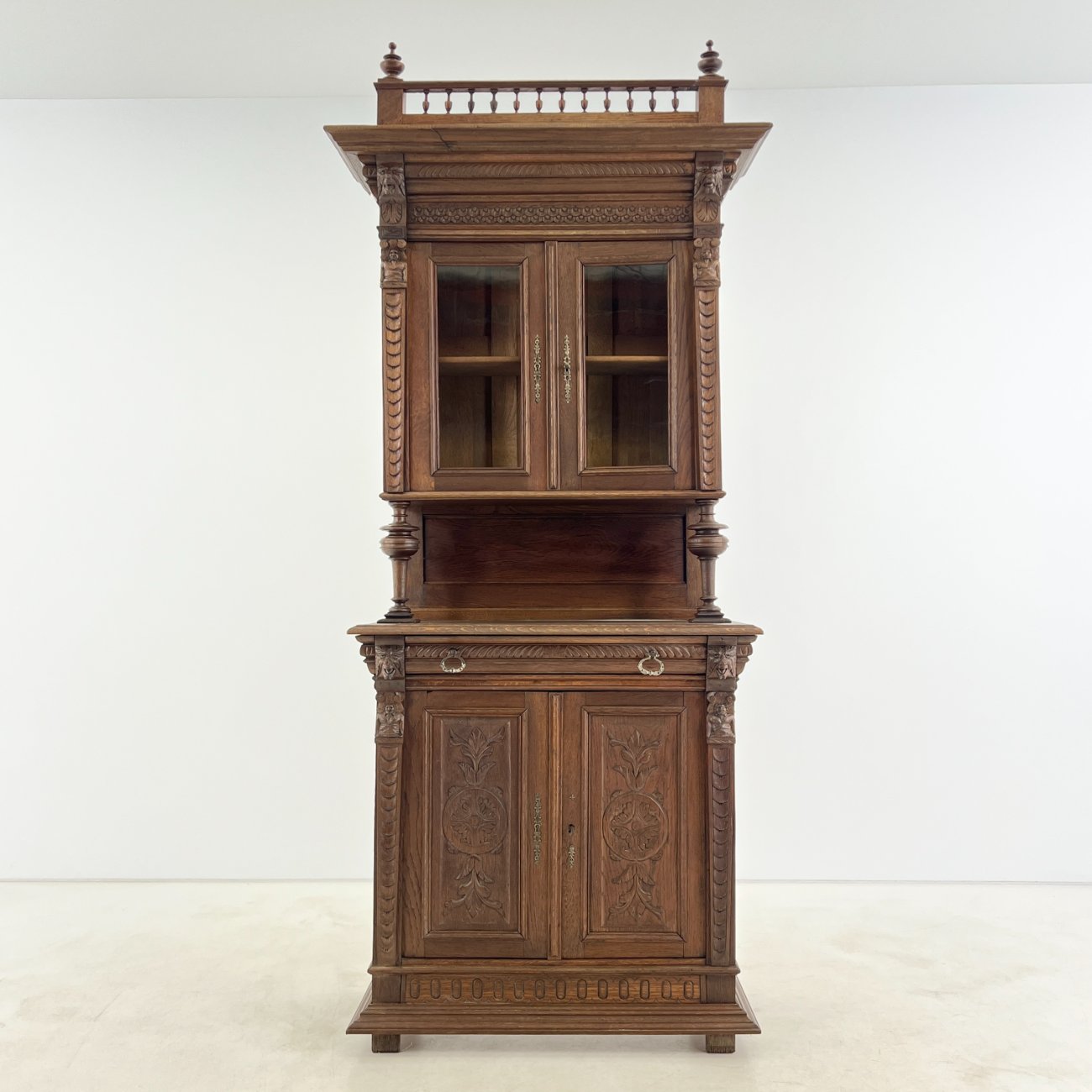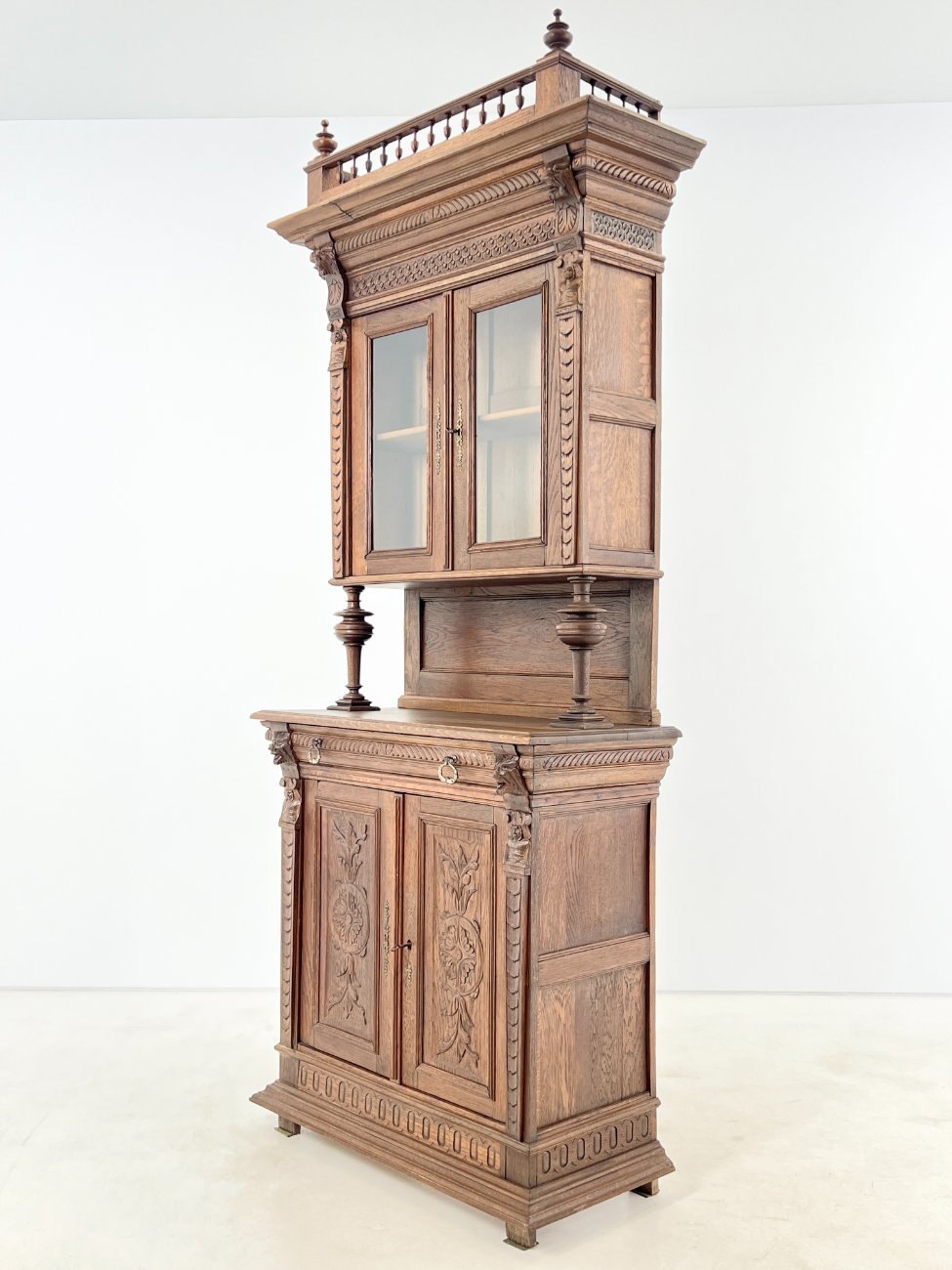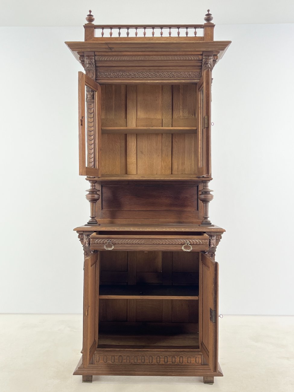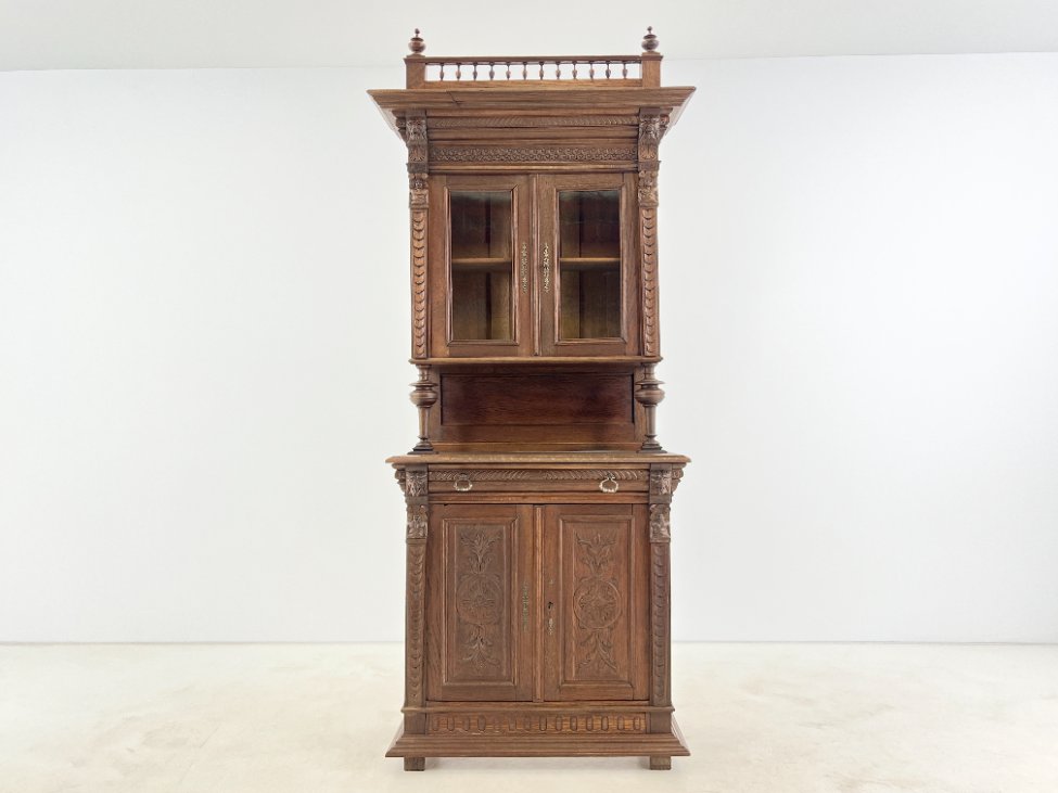 Senovinis ąžuolinis drožinėtas bufetas su stiklinėmis durimis 46x110x249 cm