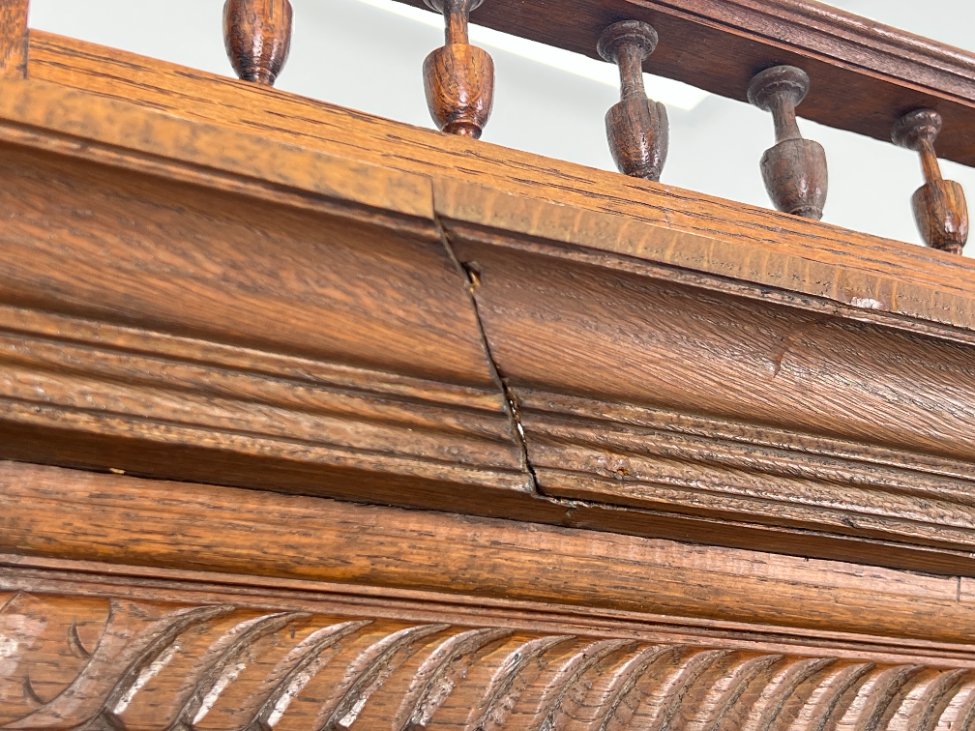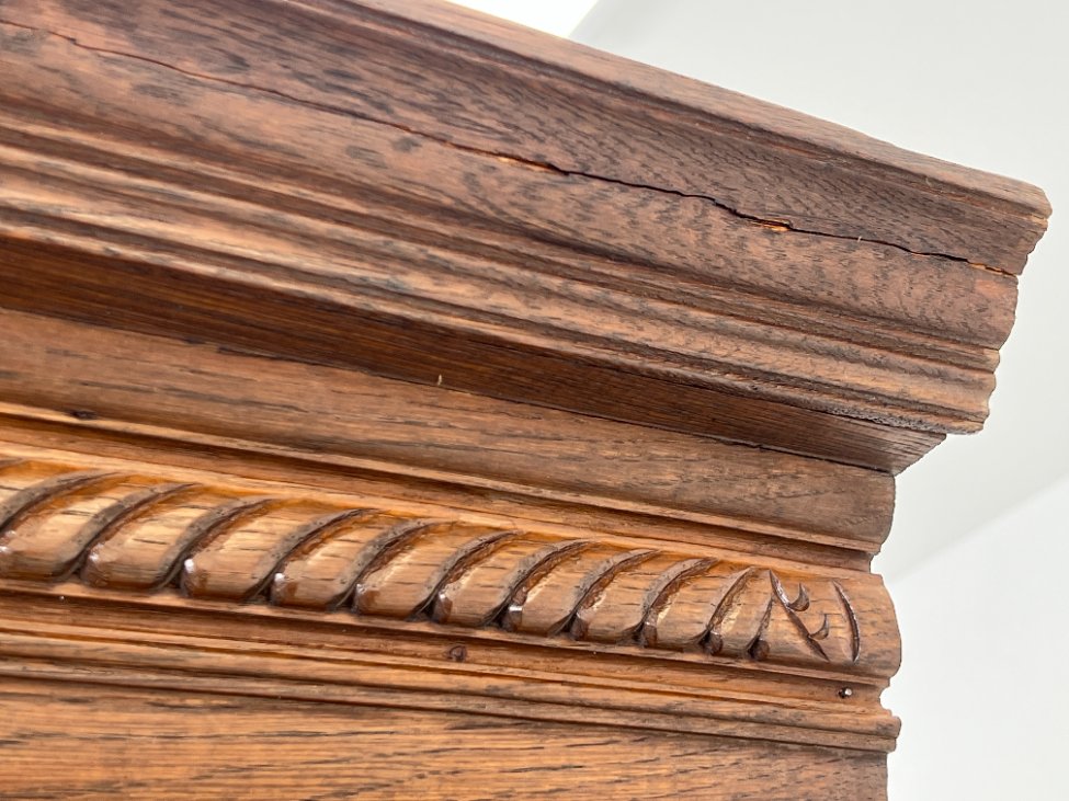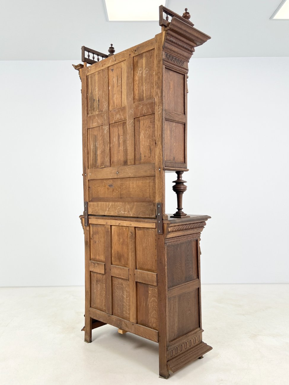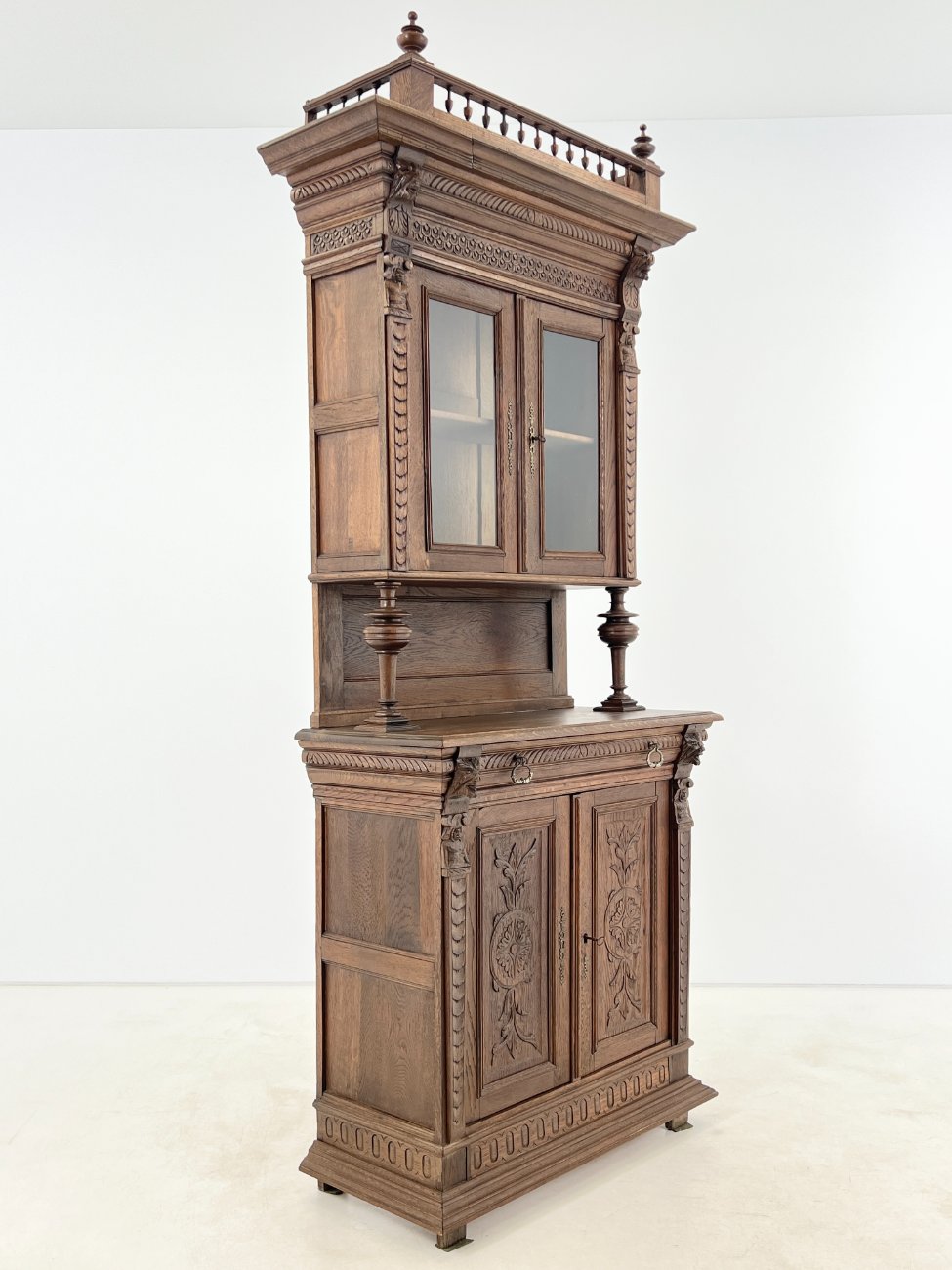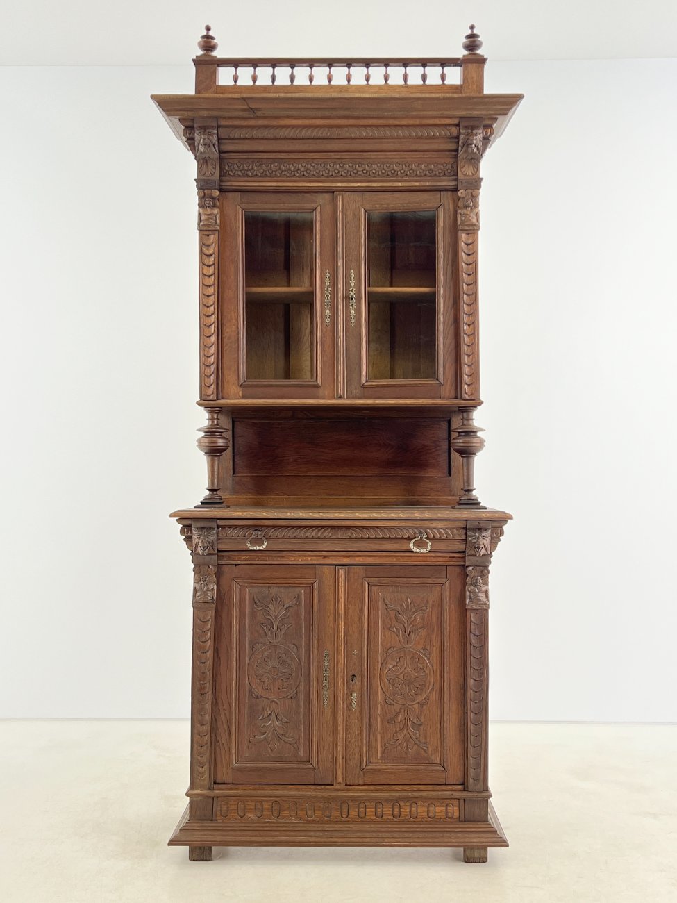 Senovinis ąžuolinis drožinėtas bufetas su stiklinėmis durimis 46x110x249 cm