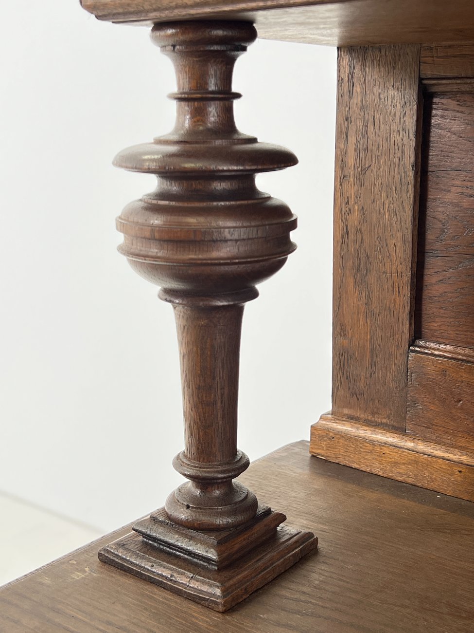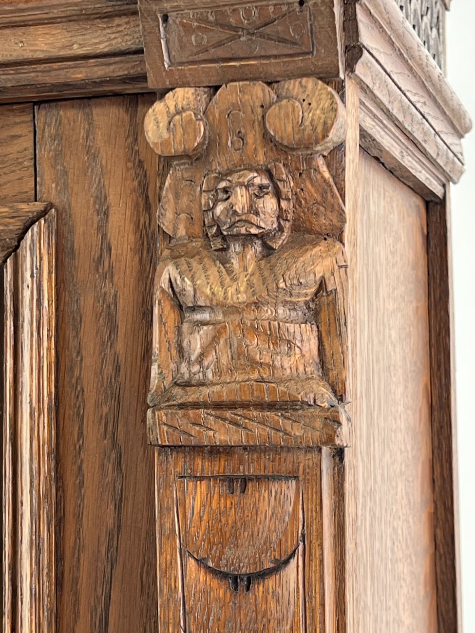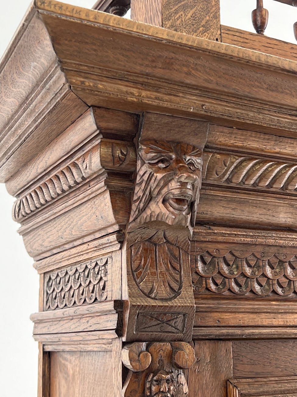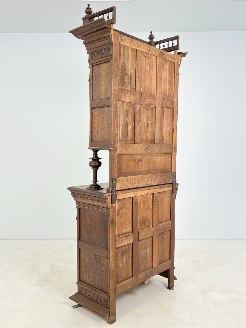 Senovinis ąžuolinis drožinėtas bufetas su stiklinėmis durimis 46x110x249 cm