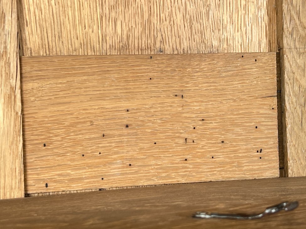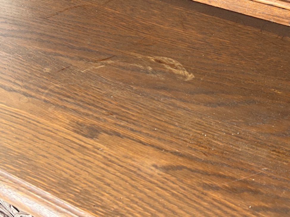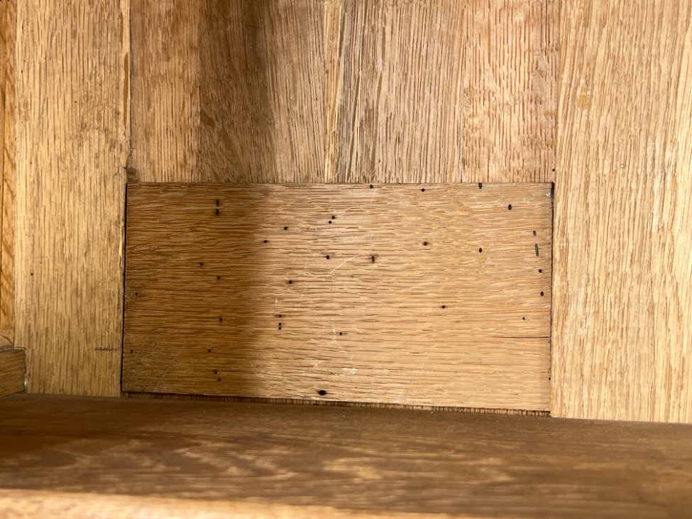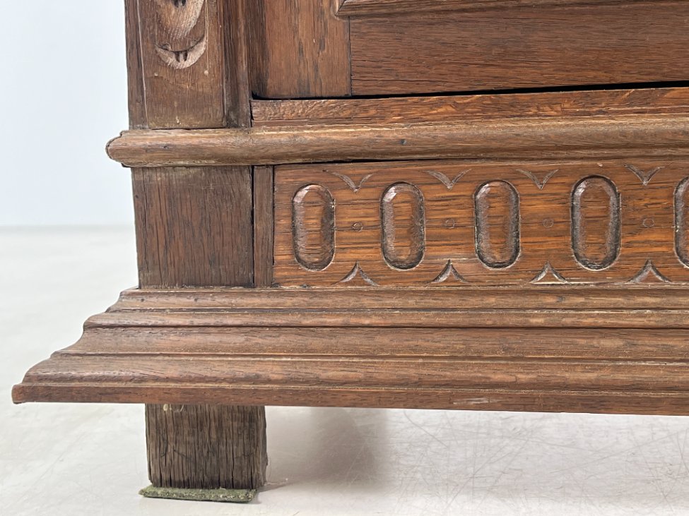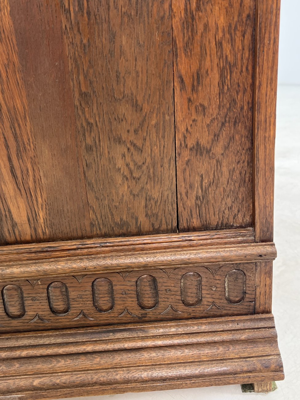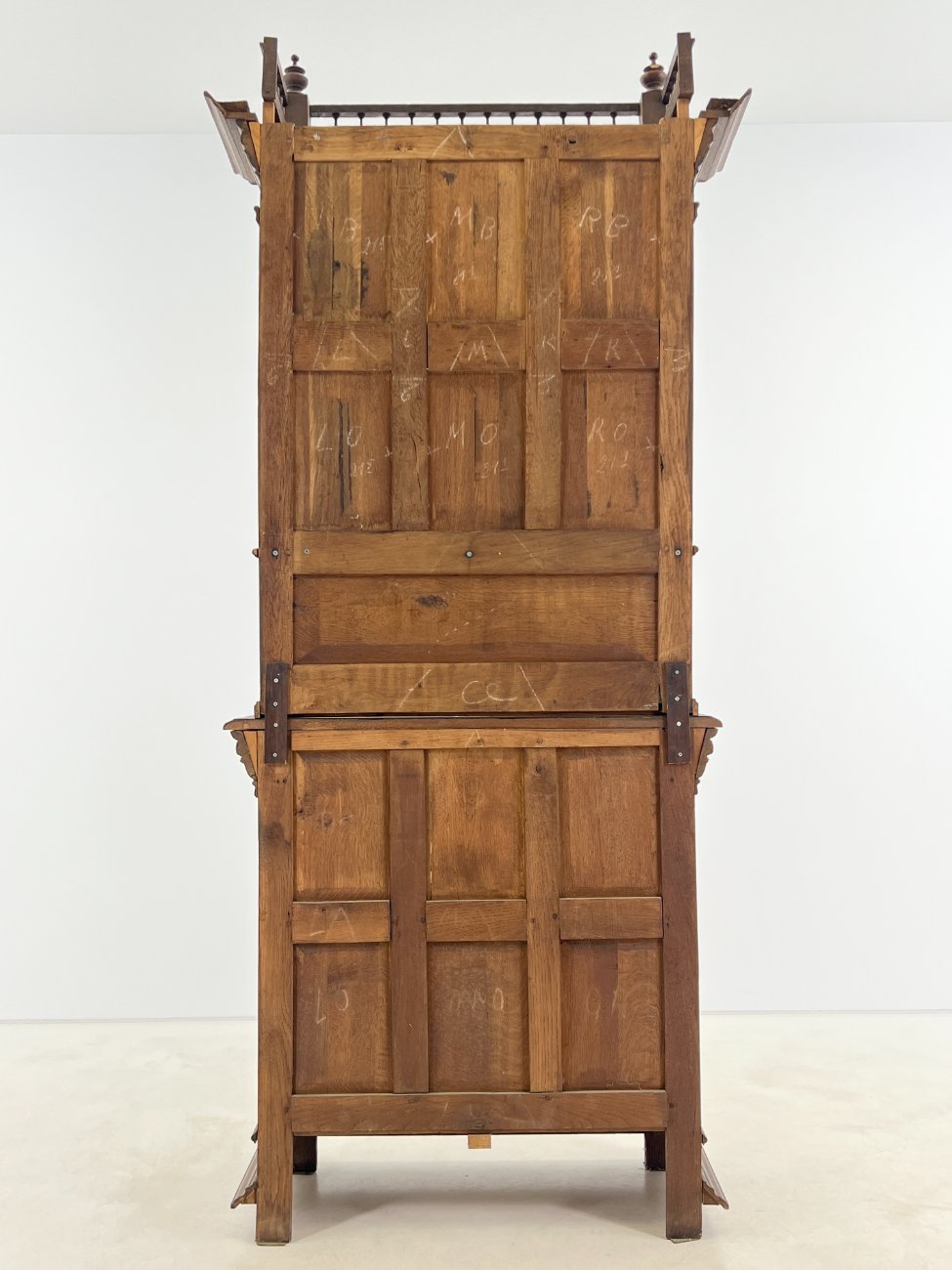 | Papildoma informacija | Matomos naudojimo ir amžiaus žymės, per visą paviršių yra pabraižymų, įmušimų, dėmių, medienos įskilimų. Yra kinivarpų pažeidimų. Ant dešiniųjų apatinių durų aplūžusi metalinė spynos apdaila. |