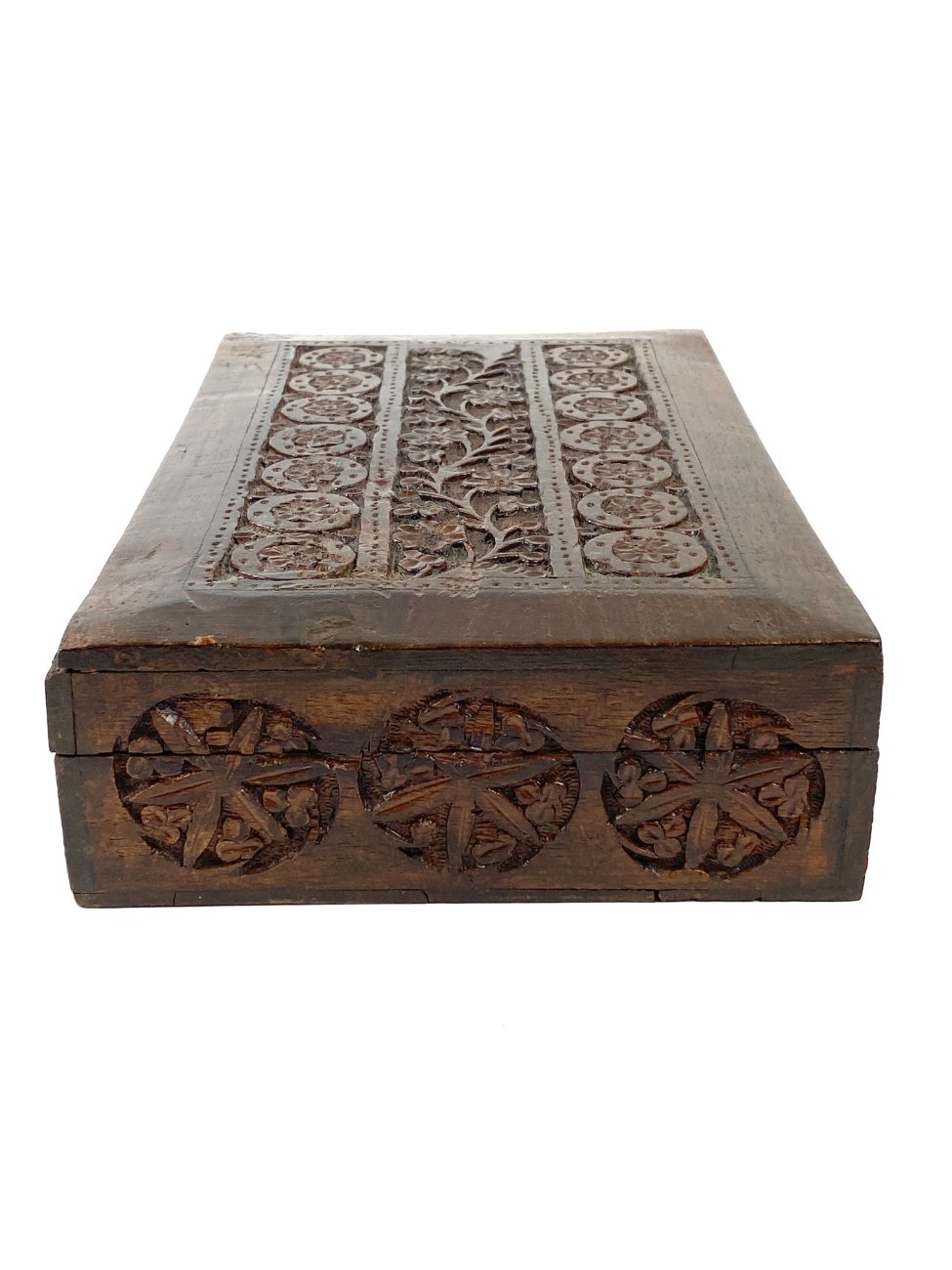 Augalų motyvais drožinėta medinė dėžutė.