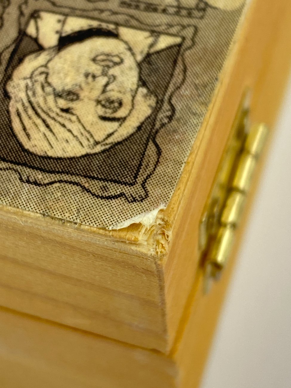 Medinė dėžutė, dekupuota filmo “Harold and Maude” motyvais.
