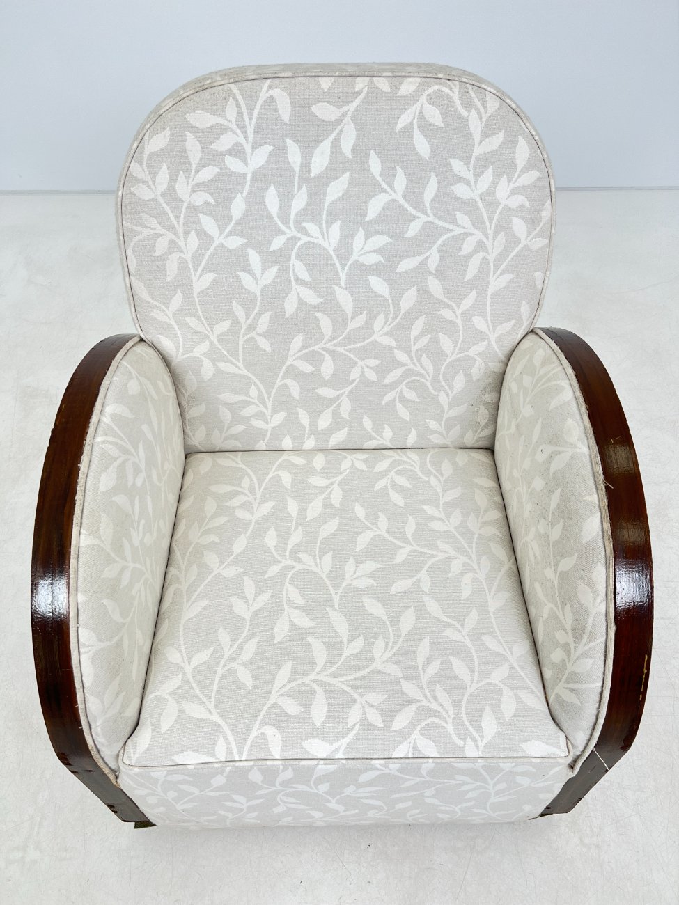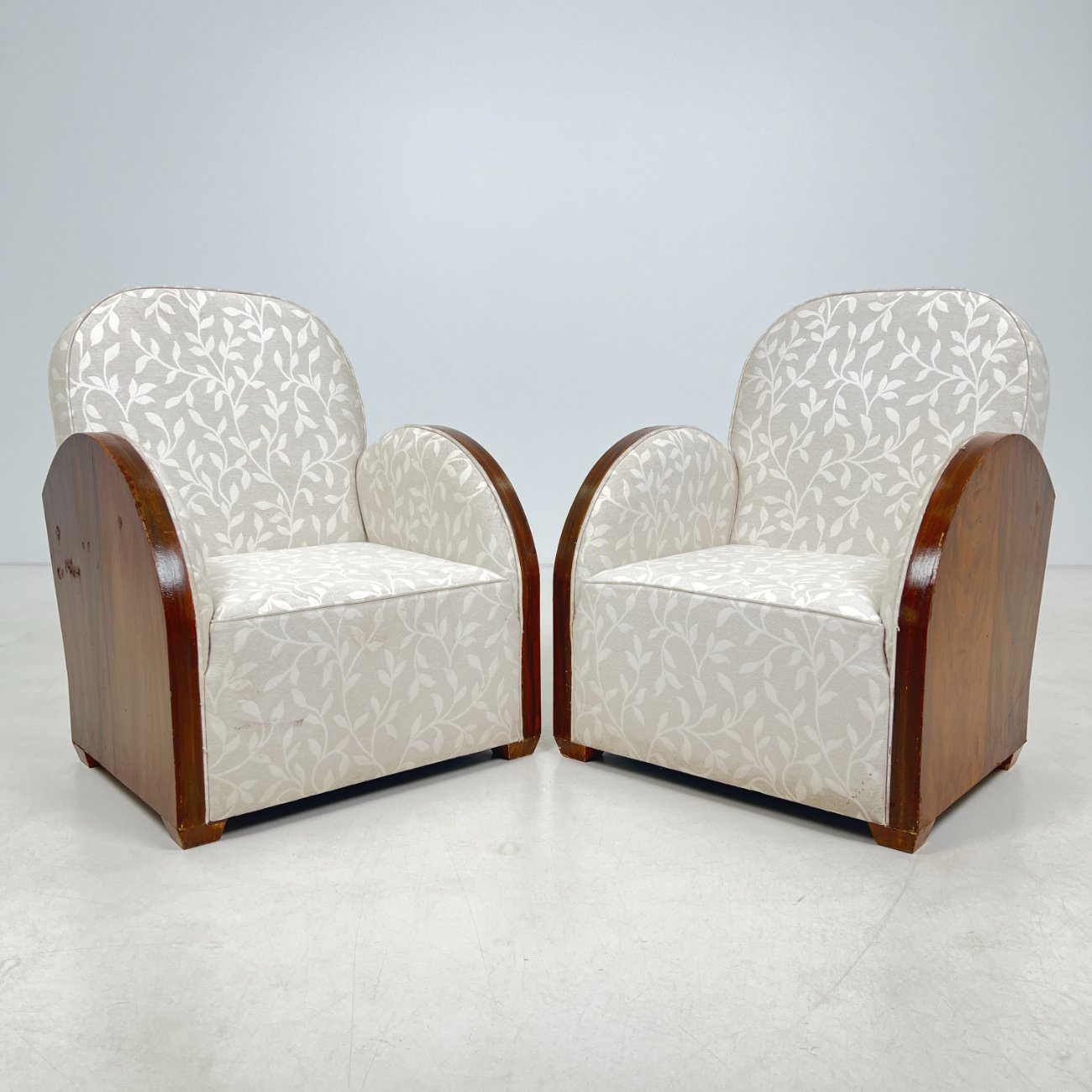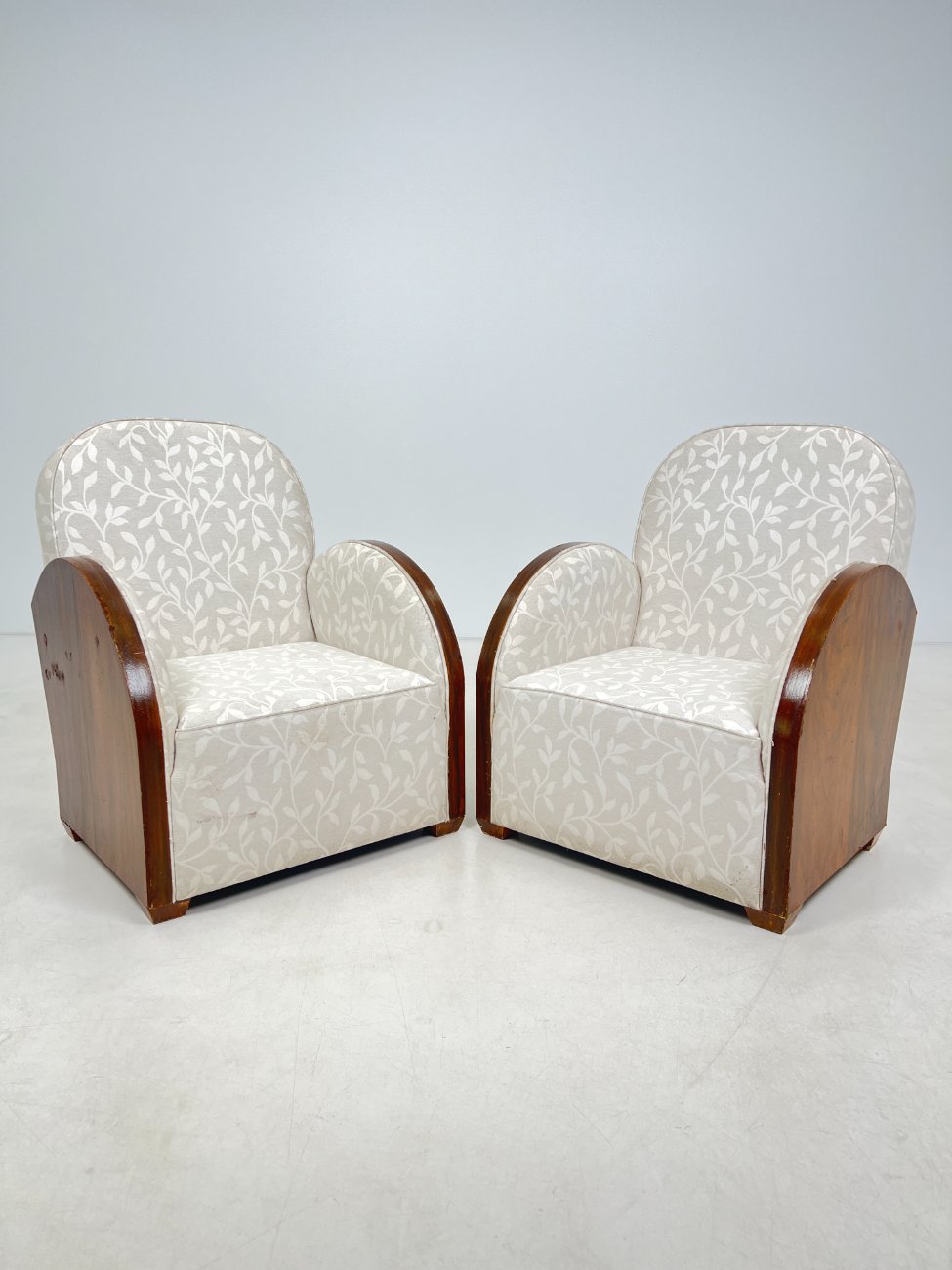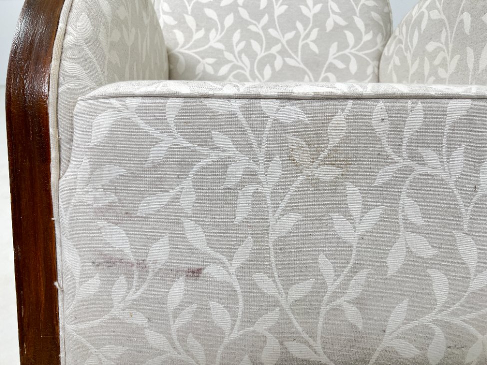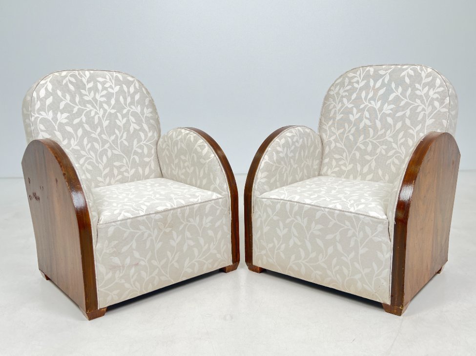 Art deco riešutmedžio foteliai šviesiu gobelenu 2 vnt. komplektas.