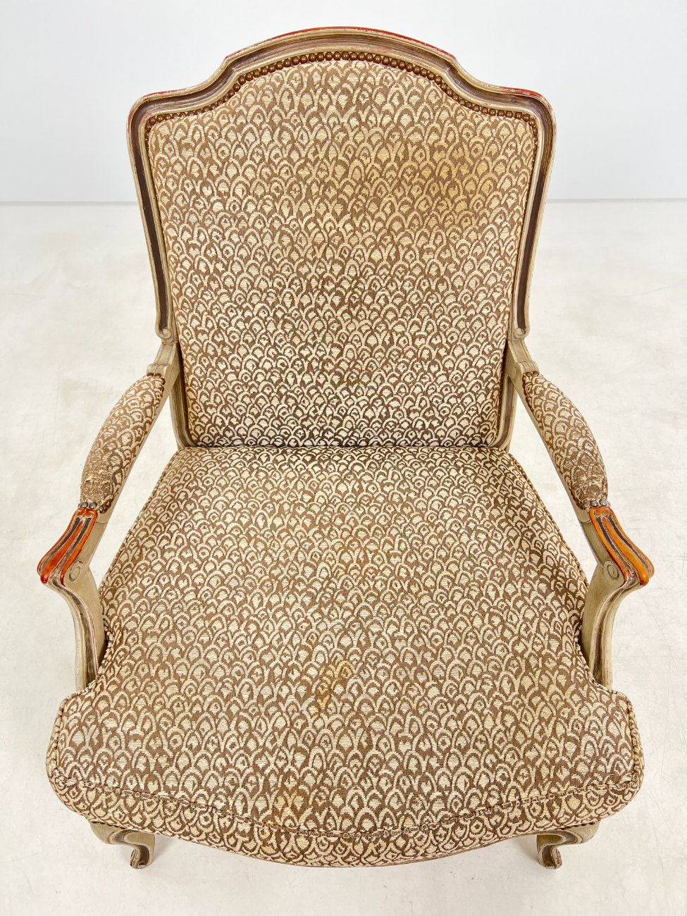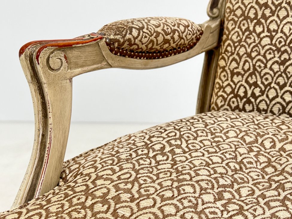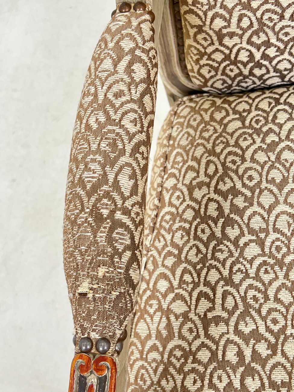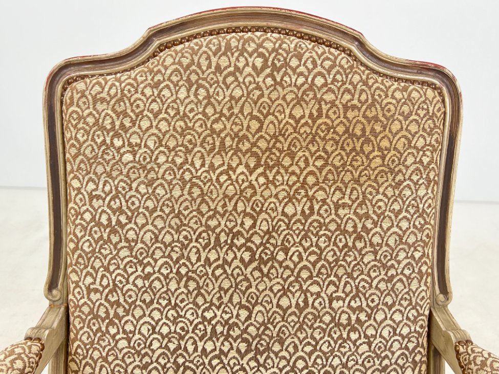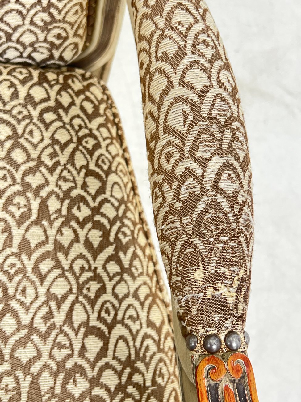 Klasikinis sendinto medinio rėmo krėslas su gobelenu.