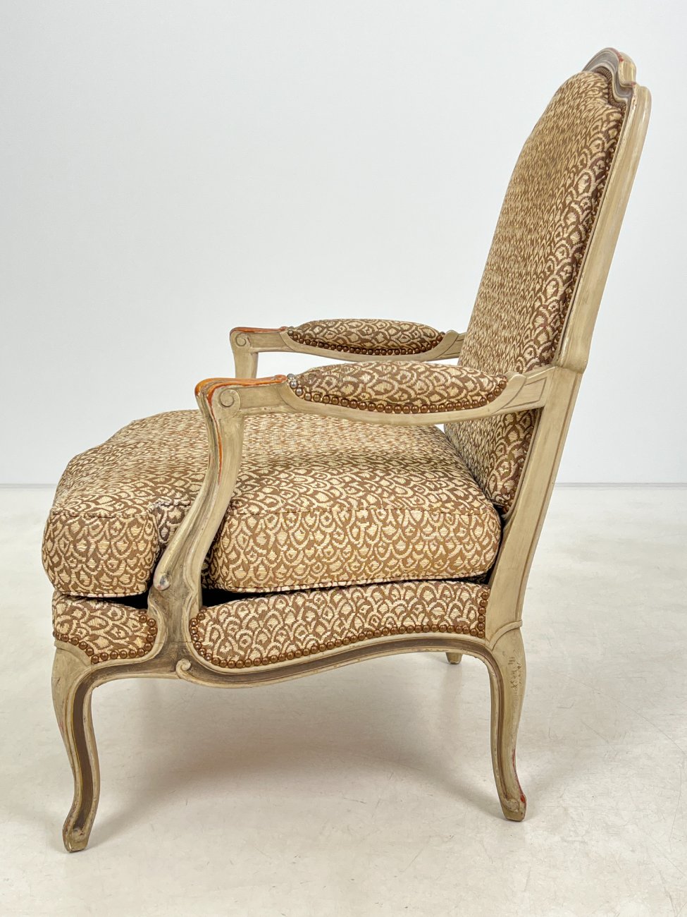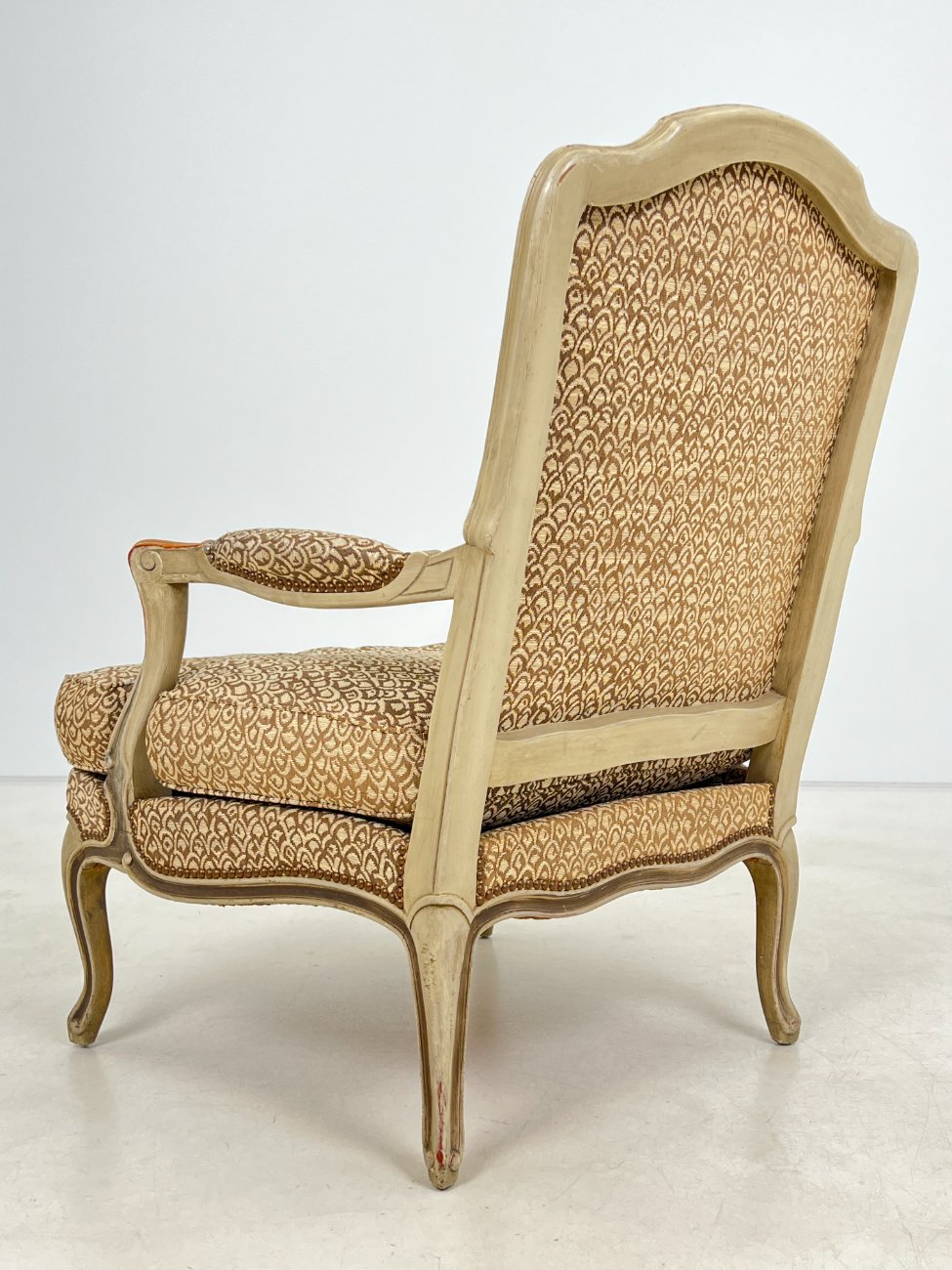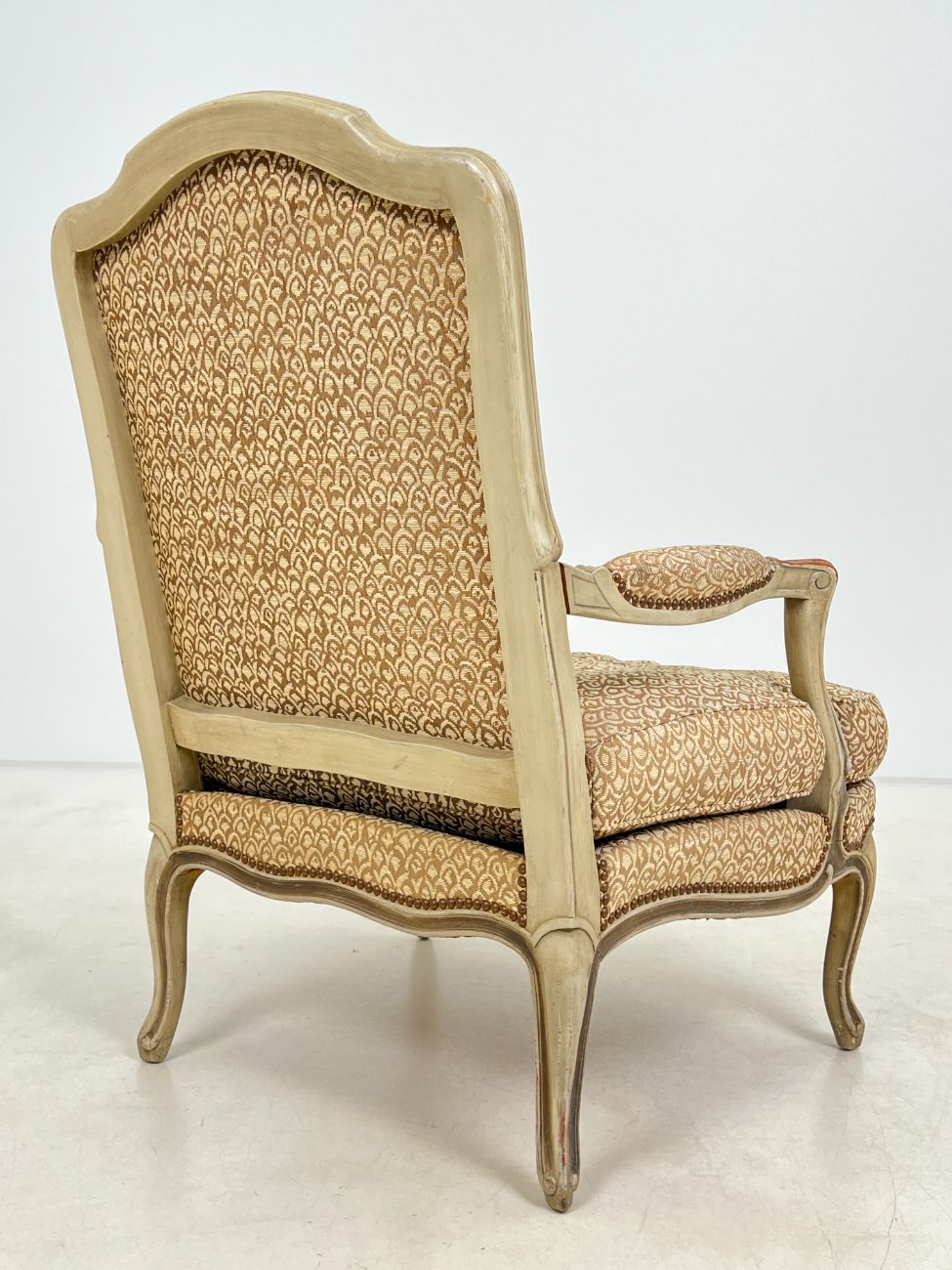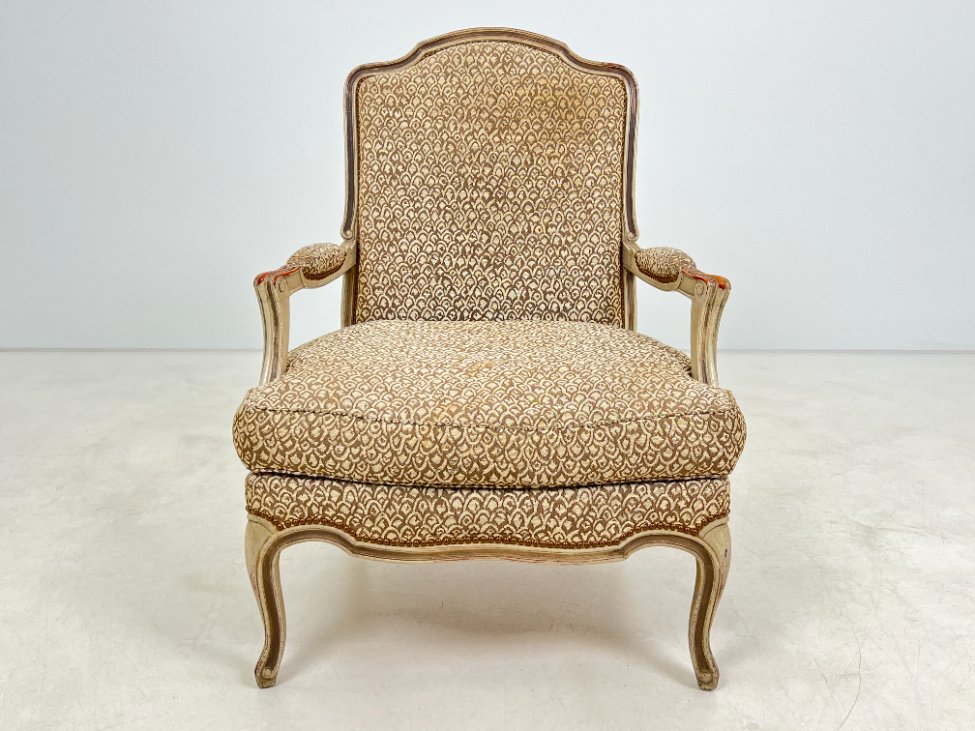 Klasikinis sendinto medinio rėmo krėslas su gobelenu.